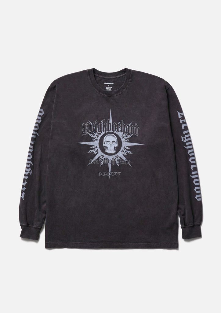 A dolman sleeve shirt featuring a distinctive panel design connecting the sleeves and body. Made from broadcloth fabric using high-quality combed yarn with excellent luster. Equipped with hand pockets utilizing side details. A graphic print is featured on the back. Includes original four-hole buttons, a brand tag on the left hem and on the side seam. One-wash finish.