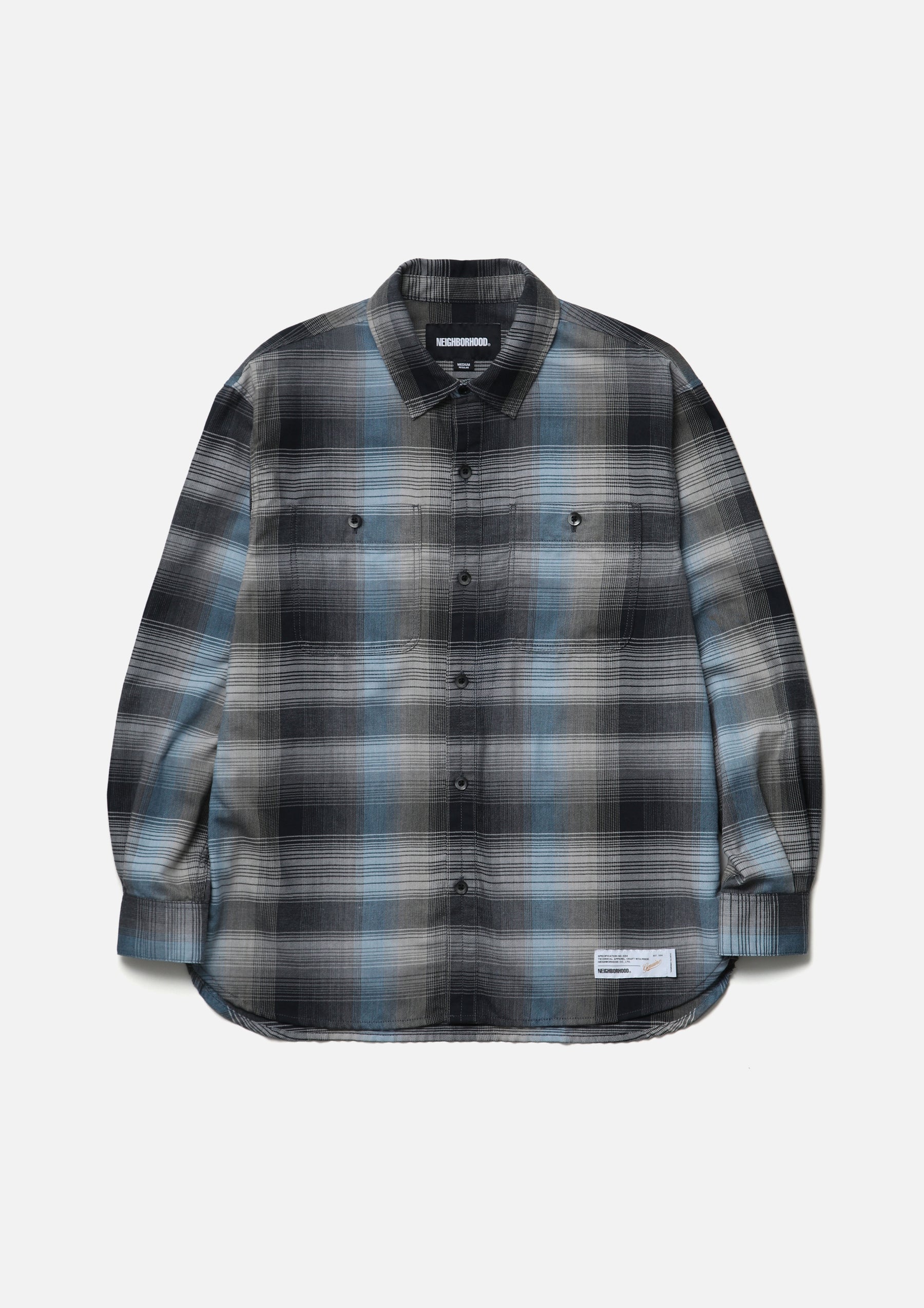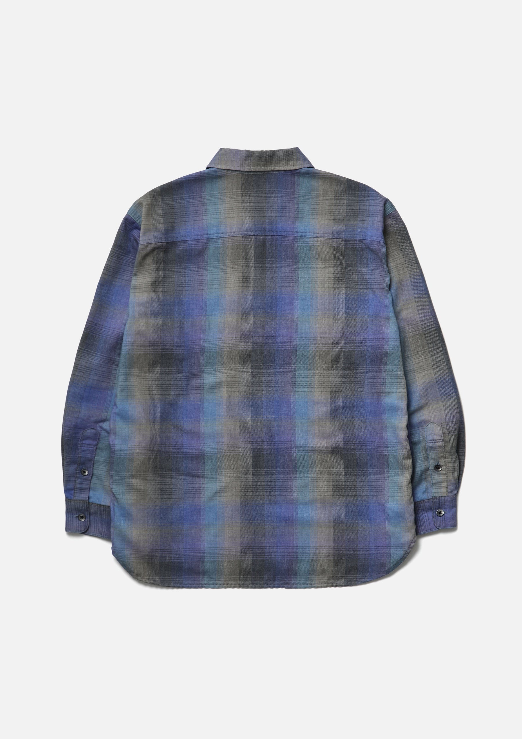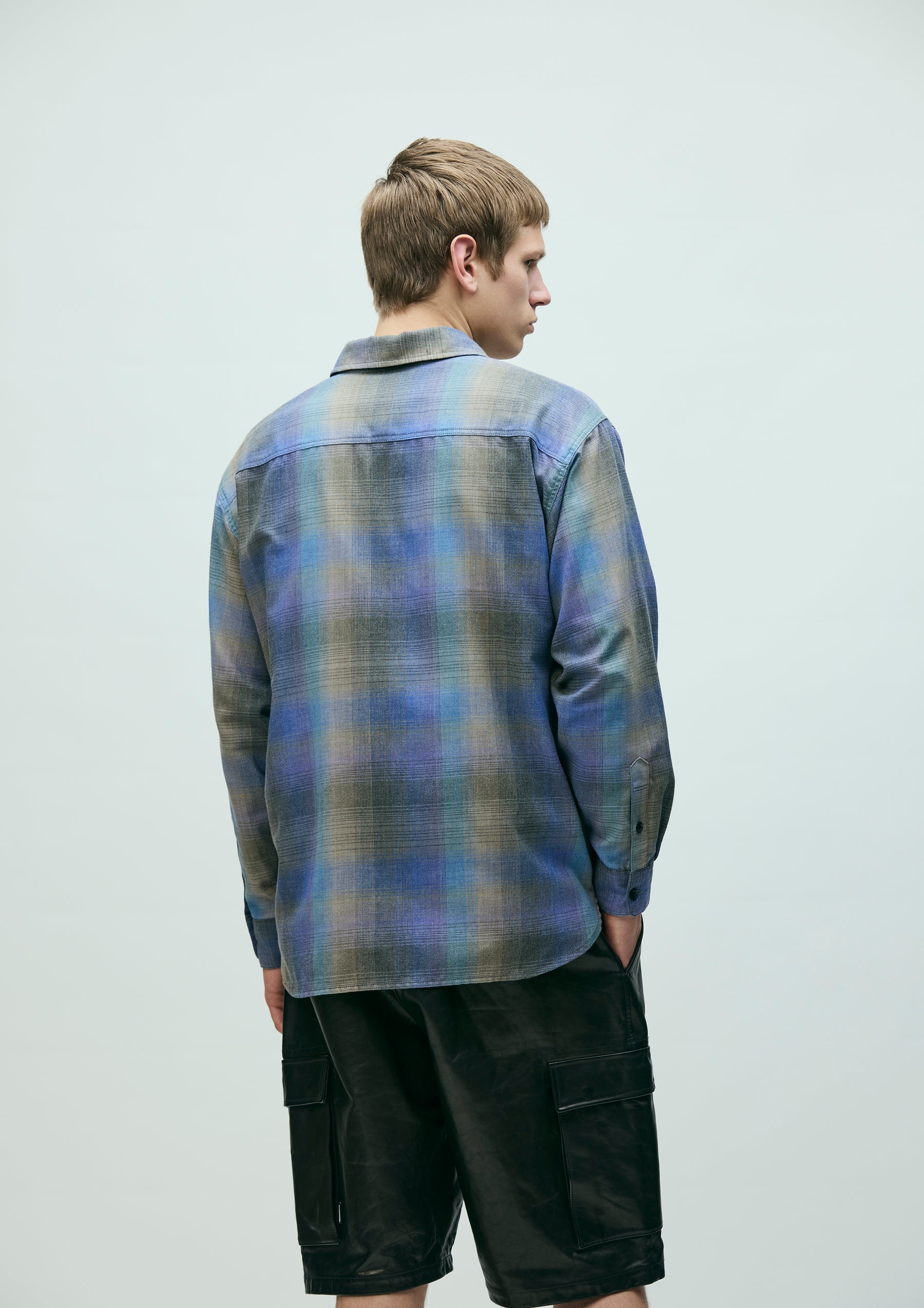Ombre check shirt made from an original textile dyed to produce a faded look. Crafted with polyester-cotton yarns, giving it a crisp, dry hand feel. Designed with classic detailing. Finished with original buttons. A brand tag is placed at the left hem and inside the front placket, with a woven side label at the side seam. Completed with a one-wash finish.