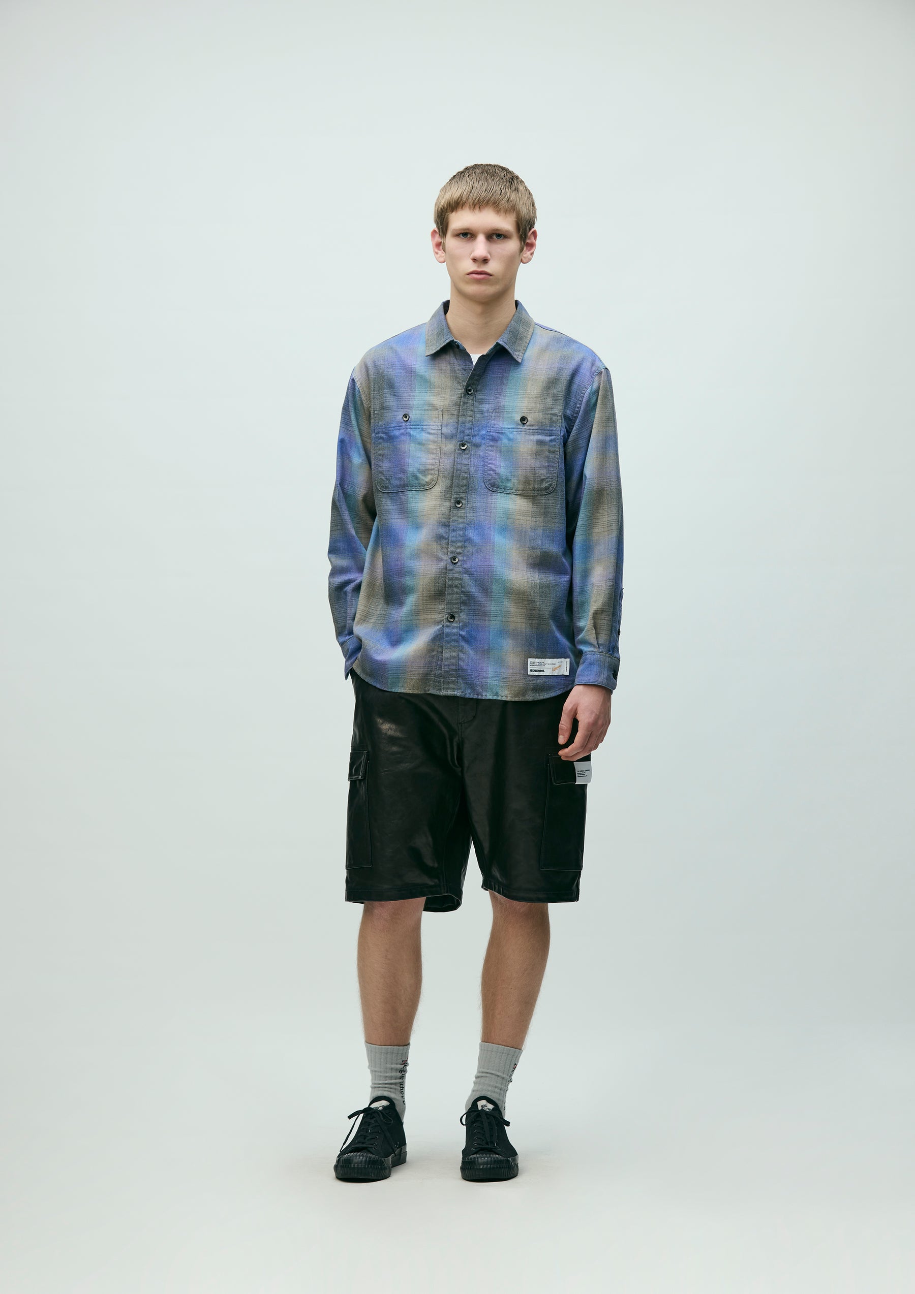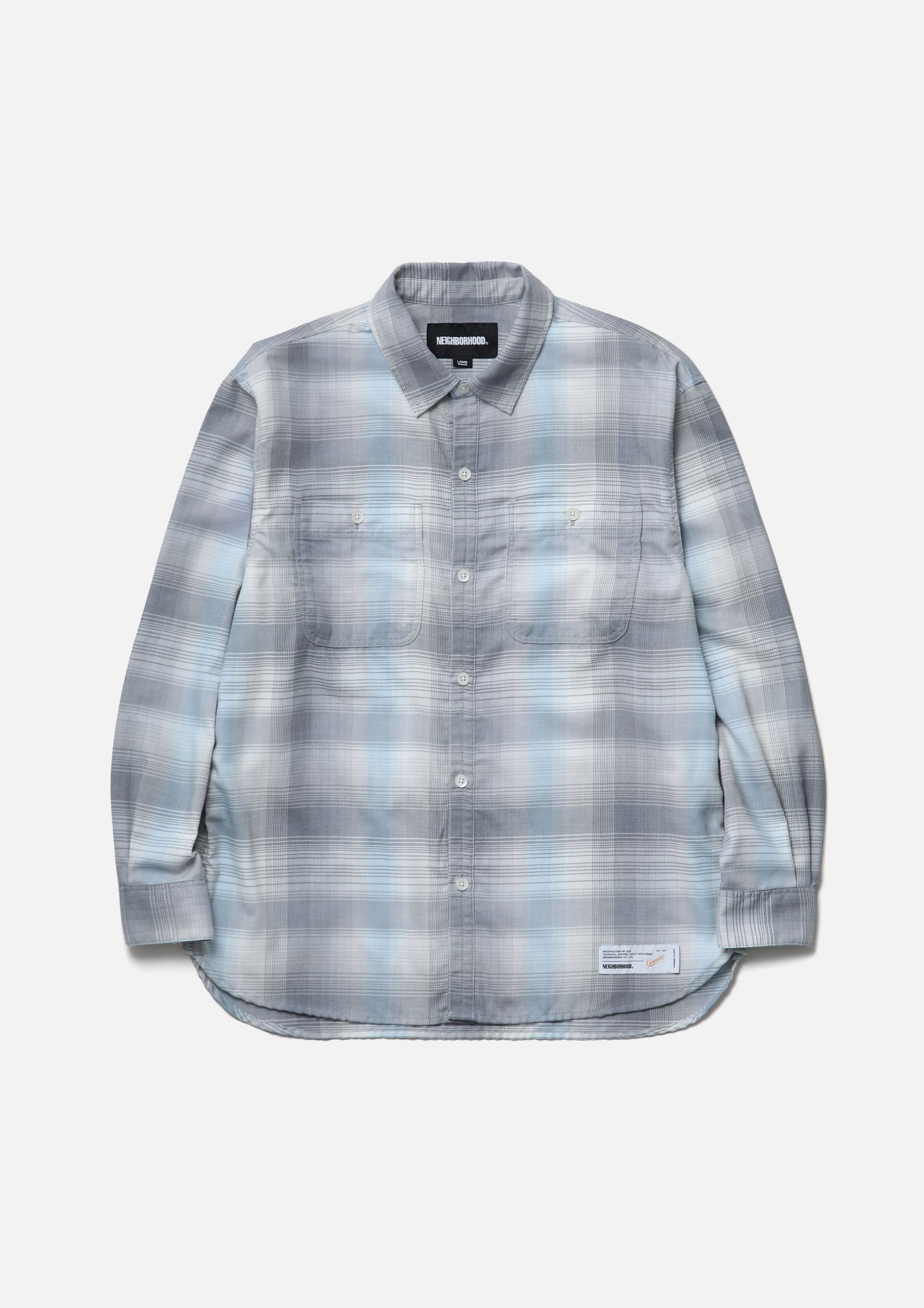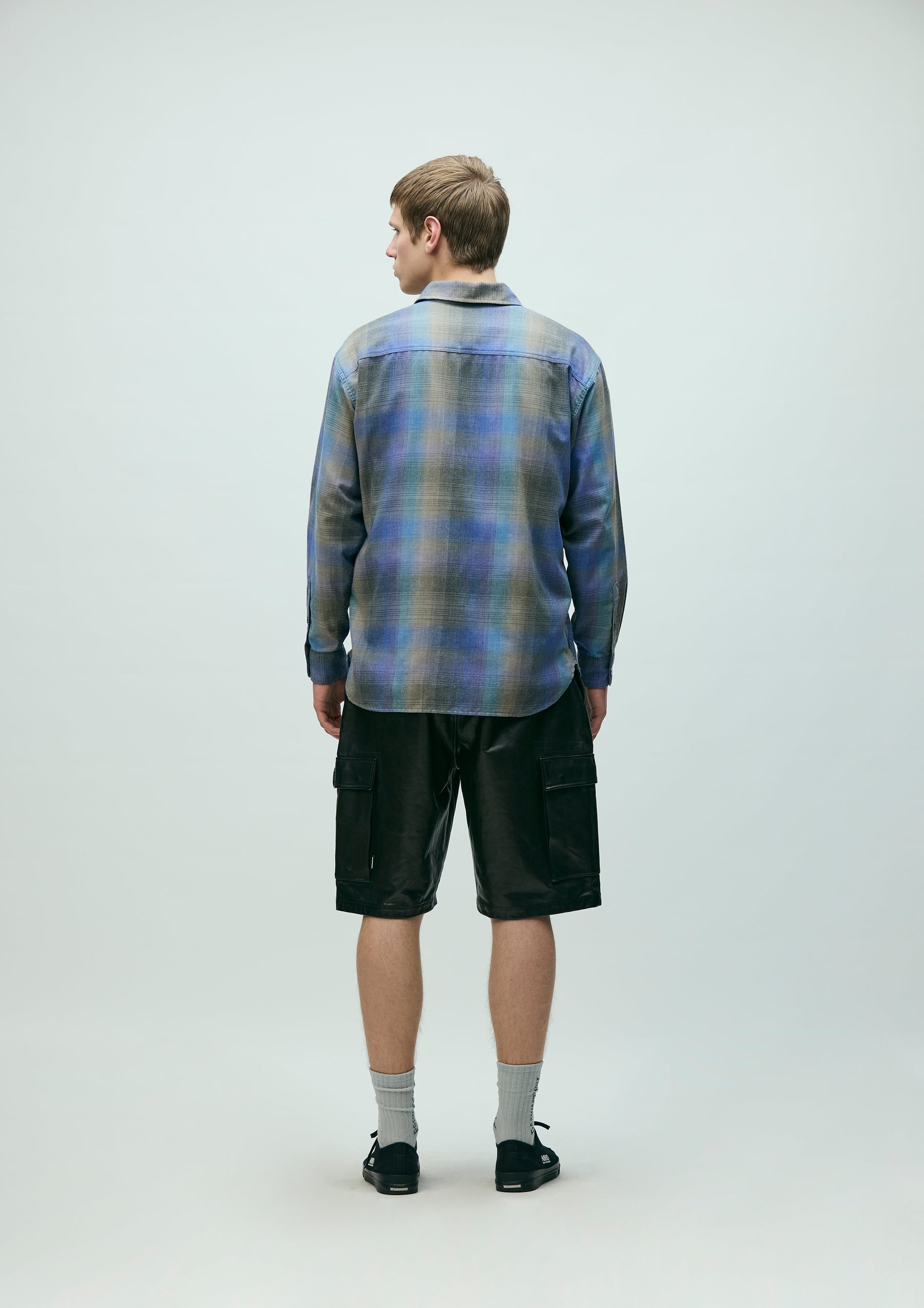 Ombre check shirt made from an original textile dyed to produce a faded look. Crafted with polyester-cotton yarns, giving it a crisp, dry hand feel. Designed with classic detailing. Finished with original buttons. A brand tag is placed at the left hem and inside the front placket, with a woven side label at the side seam. Completed with a one-wash finish.
