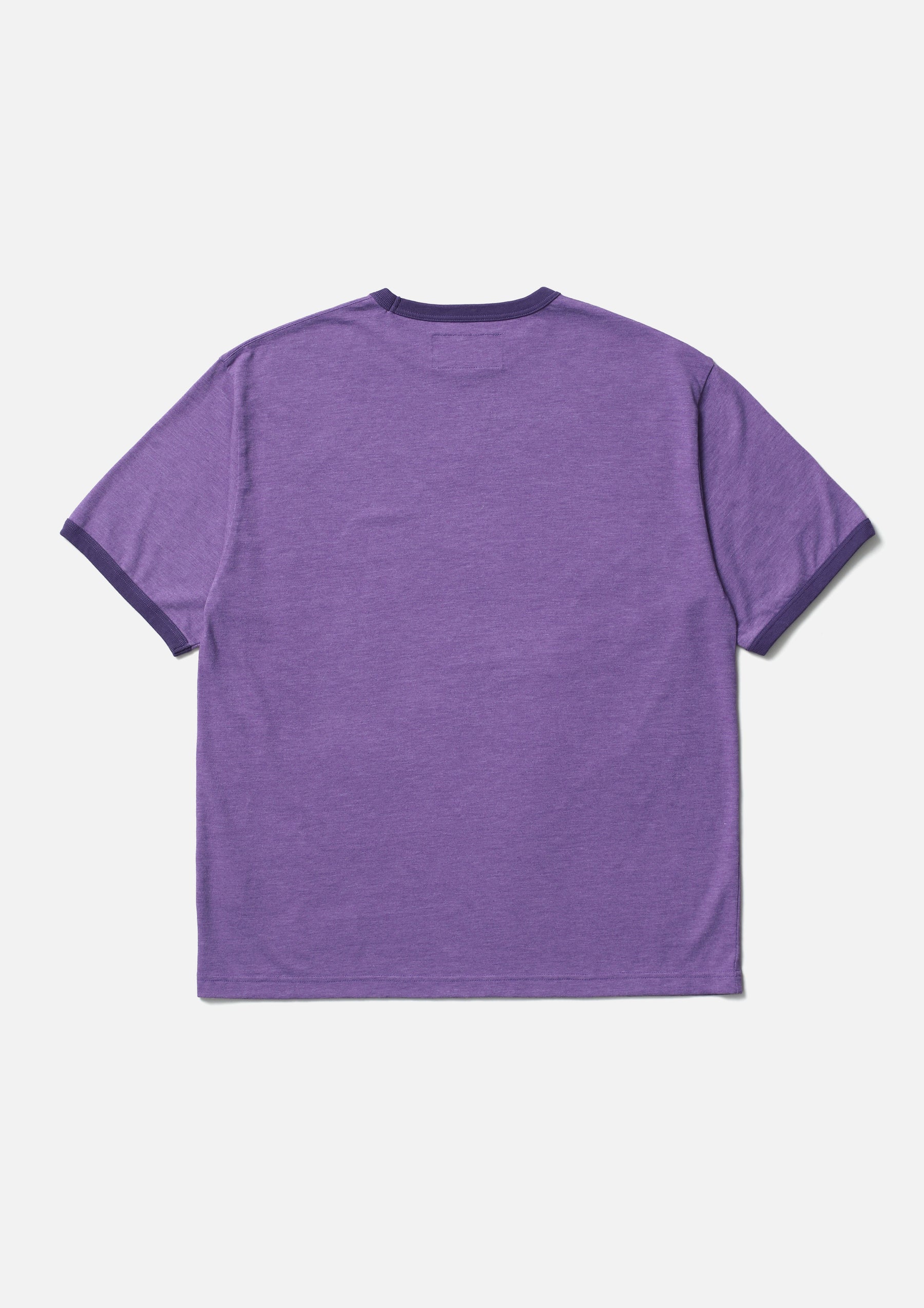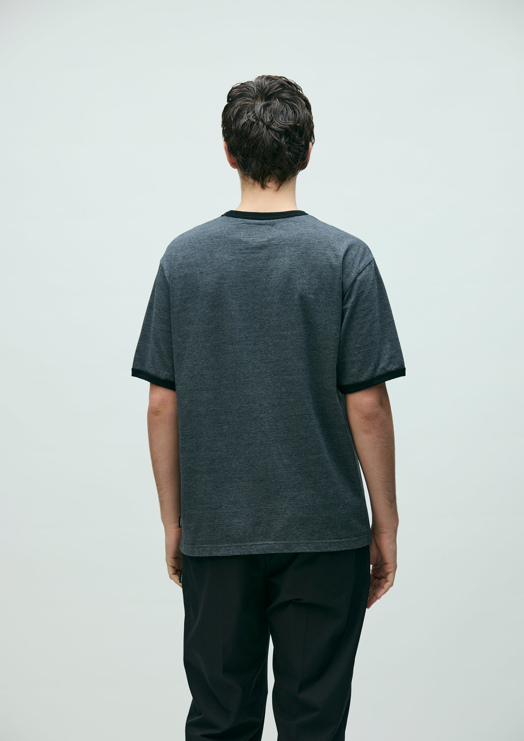 Short-sleeve crewneck cut-and-sew top made from eco jersey fabric. Features a flock-printed logo on the left chest. A brand tag is placed at the left hem, and a woven side label is attached at the side seam. Completed with a one-wash finish.