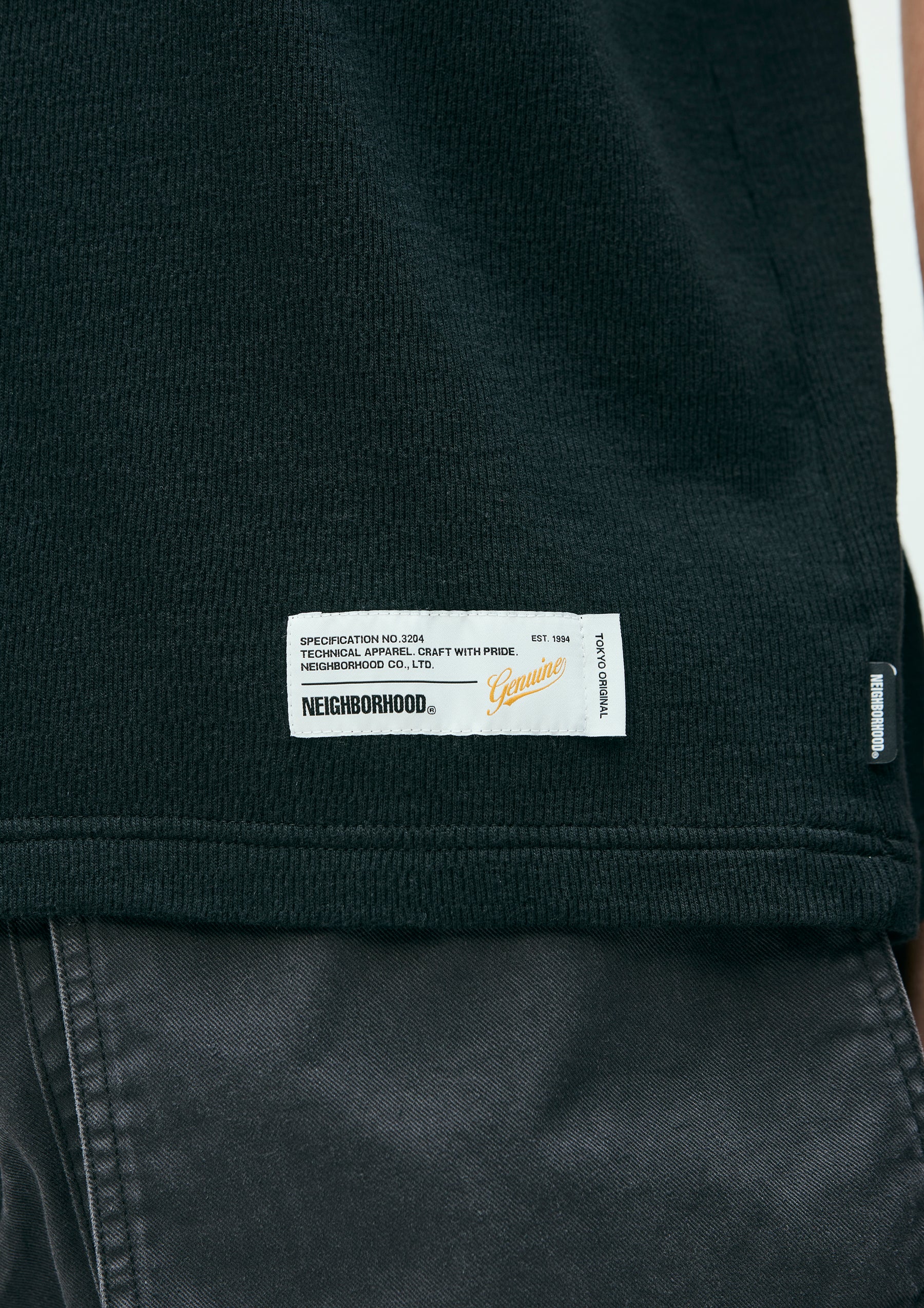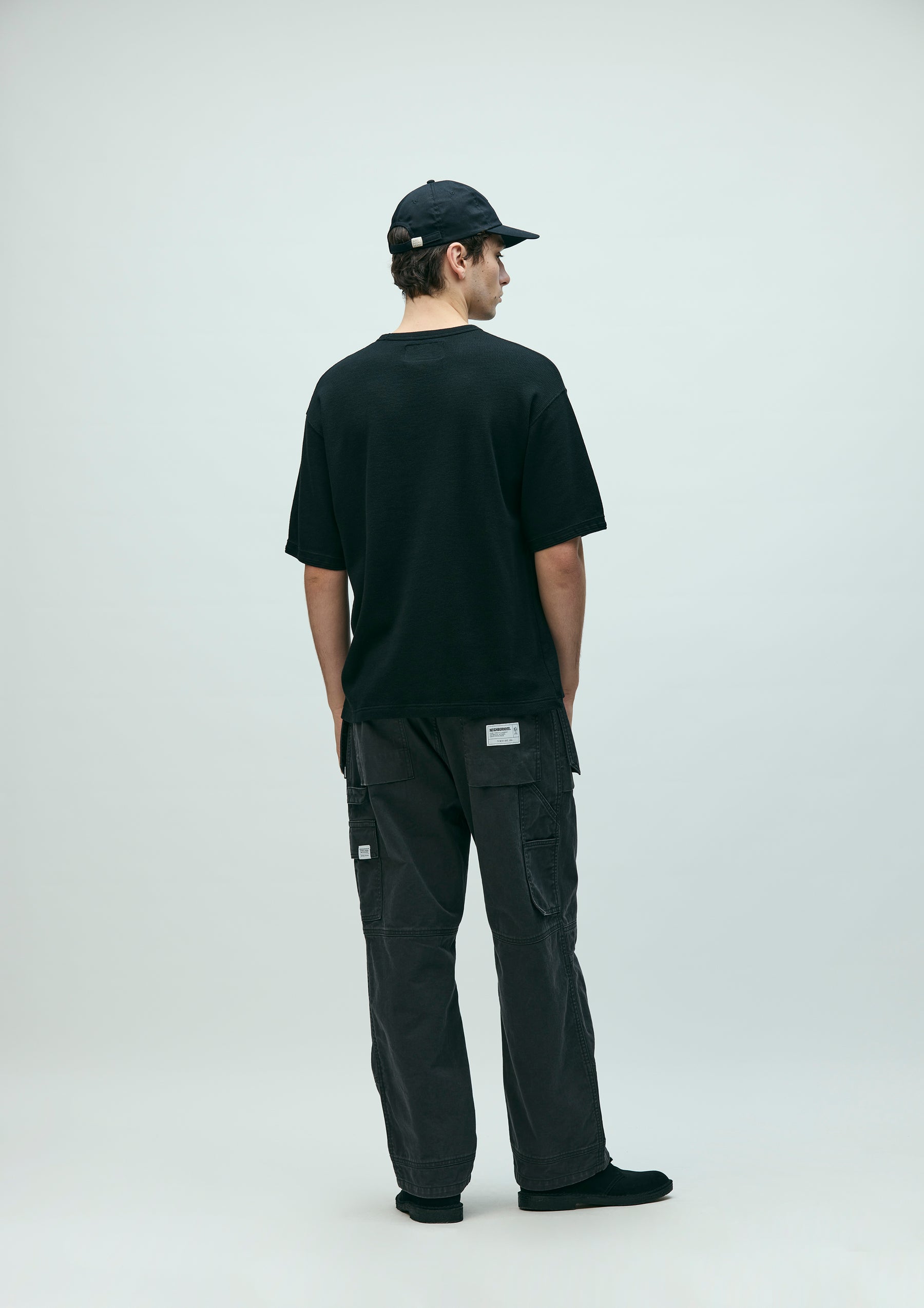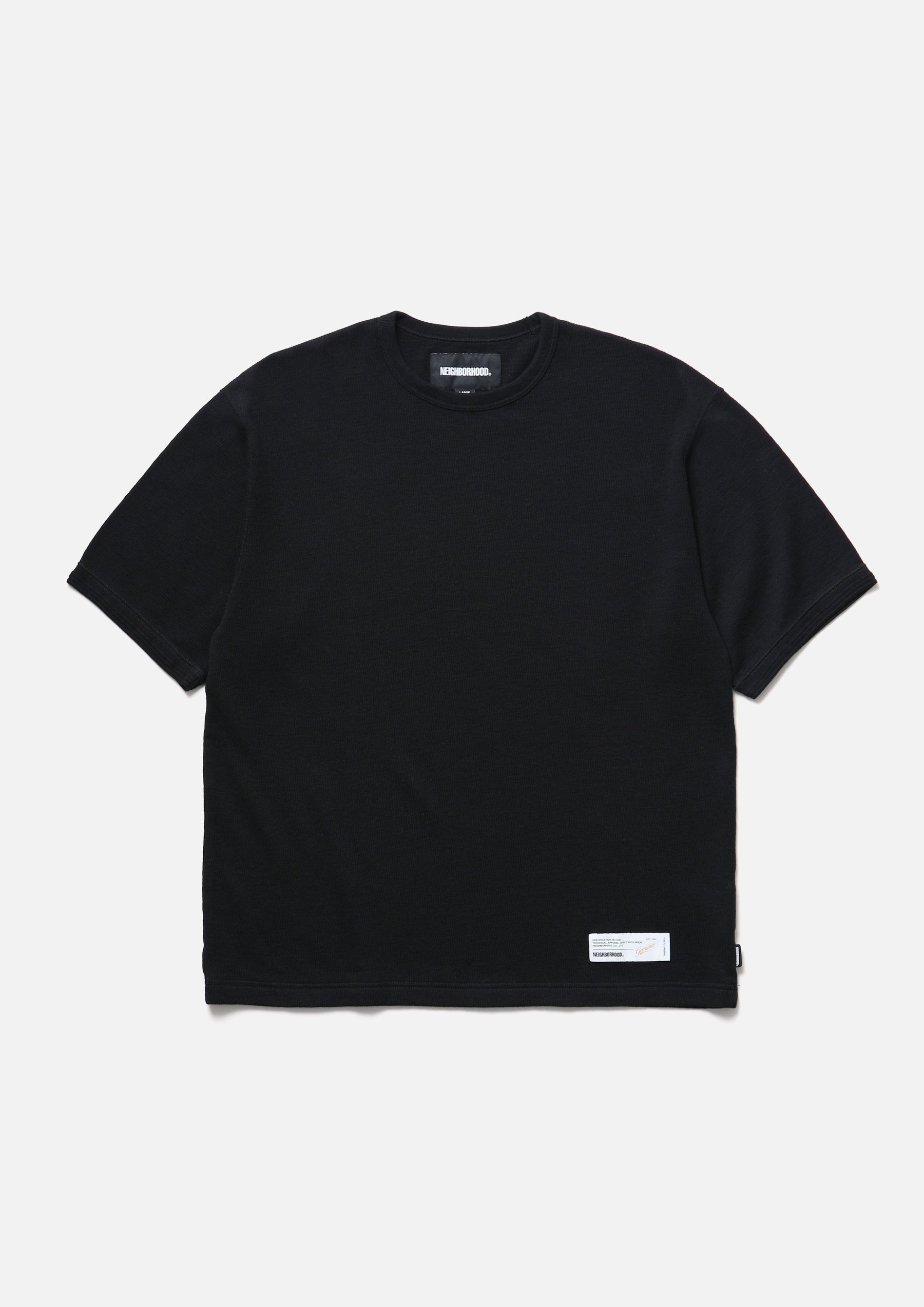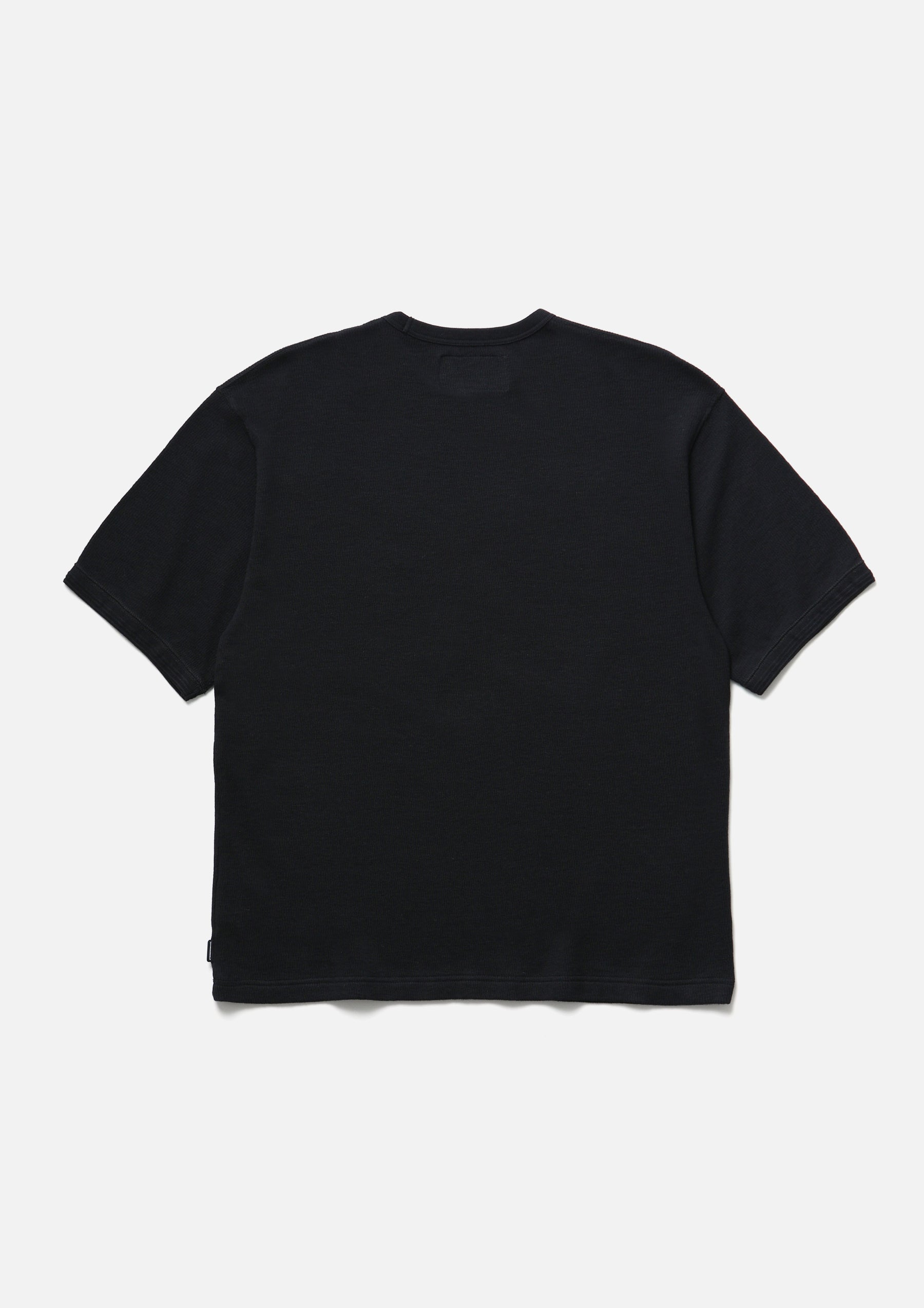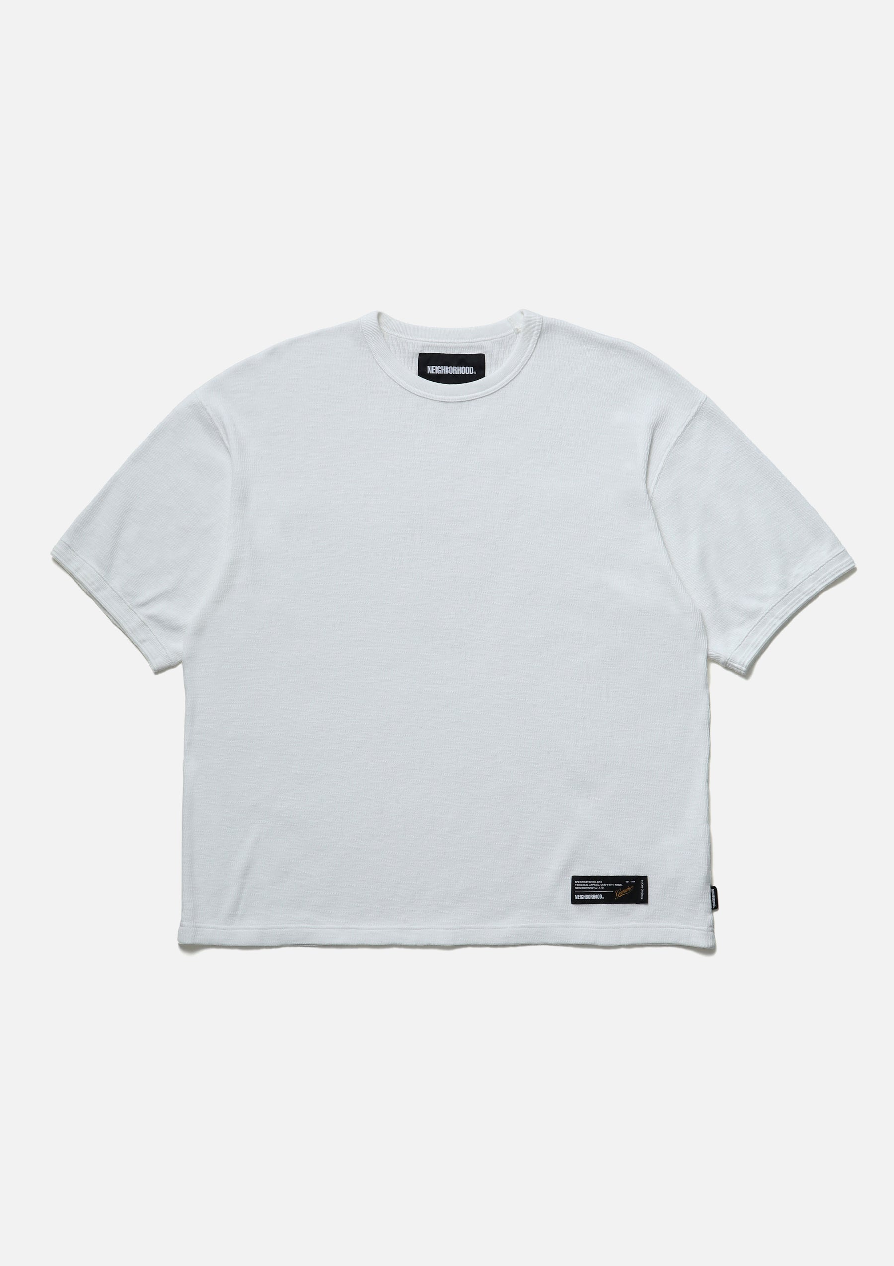 Short-sleeve crewneck cut-and-sew top made from honeycomb waffle fabric. A brand tag is placed at the left hem, and a woven side label is attached at the side seam. Completed with a one-wash finish.