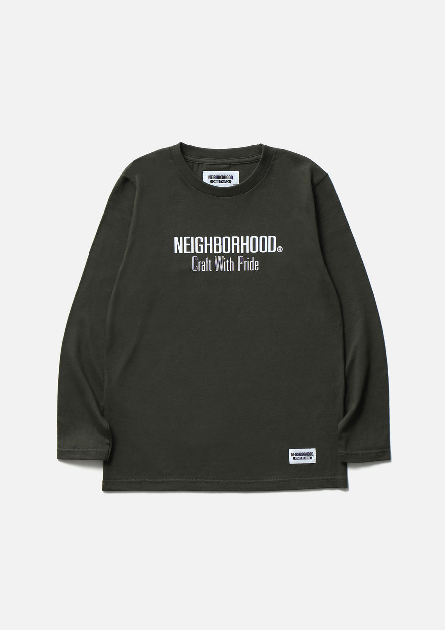 A long-sleeve T-shirt made of a 5.6oz heavyweight body. Printed logo on the front. A name tag is placed on the left hem.