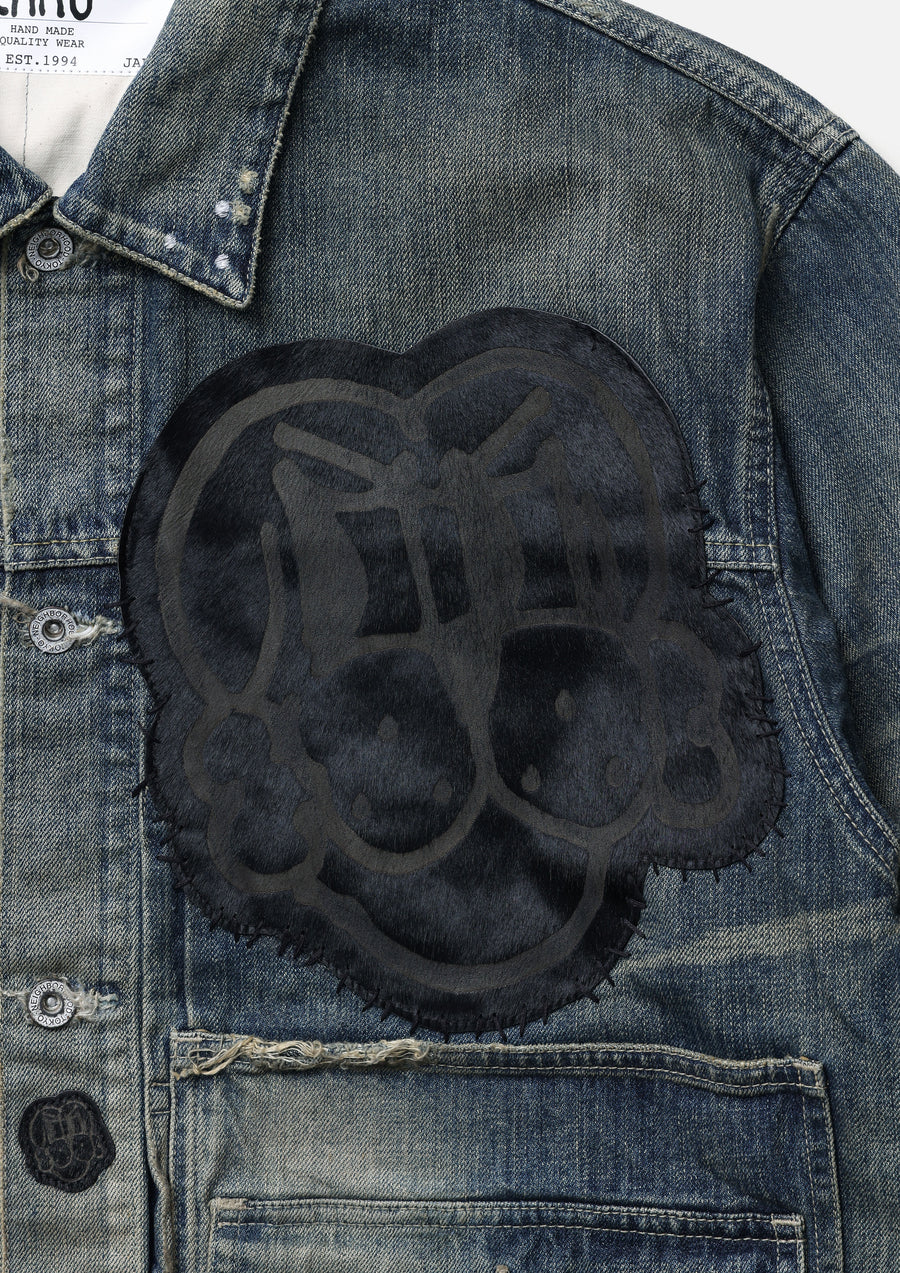 Savage denim jacket featuring Finesse Pup. Crafted from original 12oz selvedge denim. Finesse Pup are expressed through cowhide patches placed in multiple locations, and distressing with rework stitching across the entire back panel. Features diverse details including hand embroidery at the collar using reflector thread, paneled sleeves, and double-layered patch pockets. Distinguished by authentic aging achieved through distressing, rework processing, and heavy fading that expresses fabric deterioration. Incorporates original rivets and tack buttons. Includes clip tag at the side seam. Collaboration with CHITO.