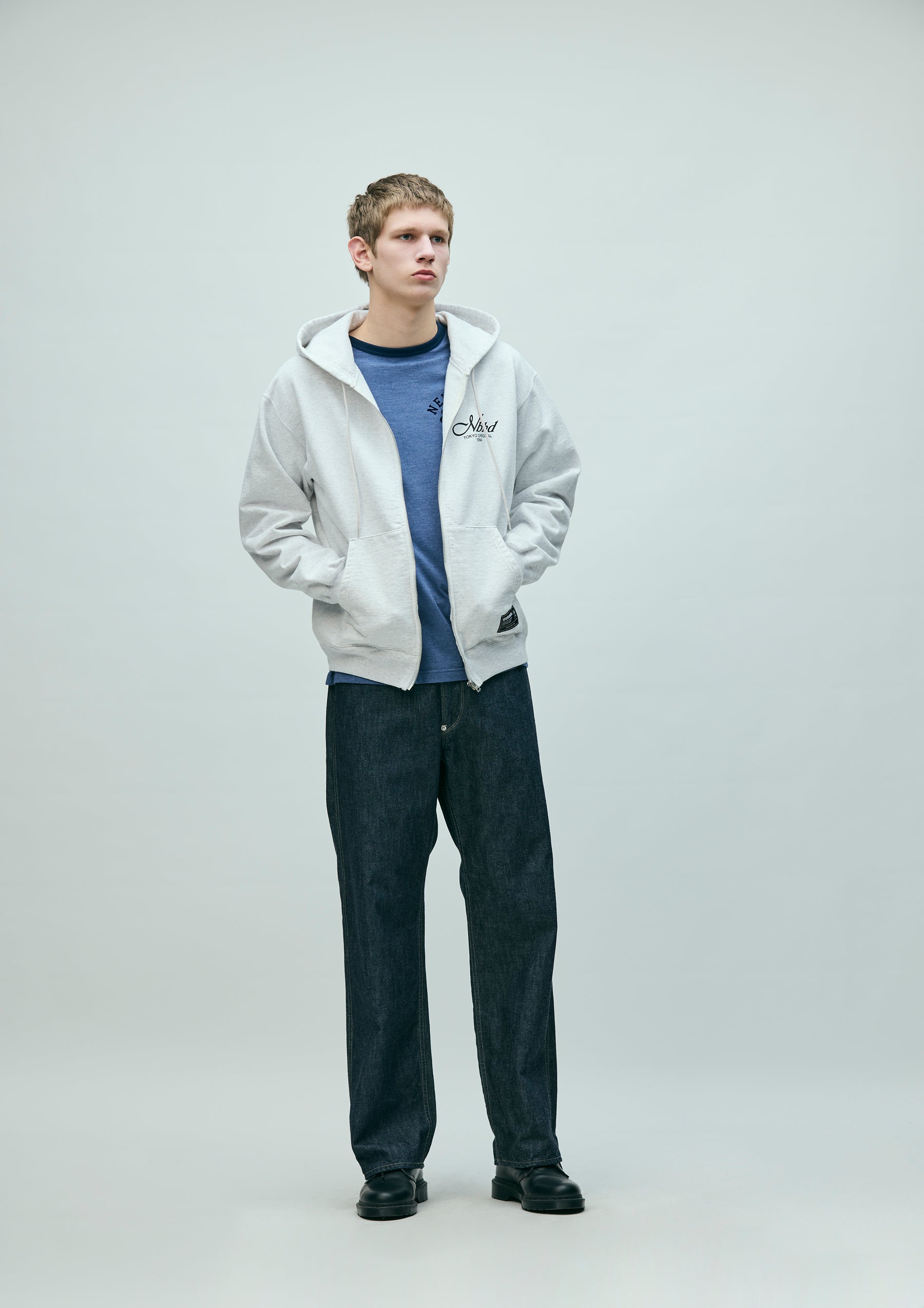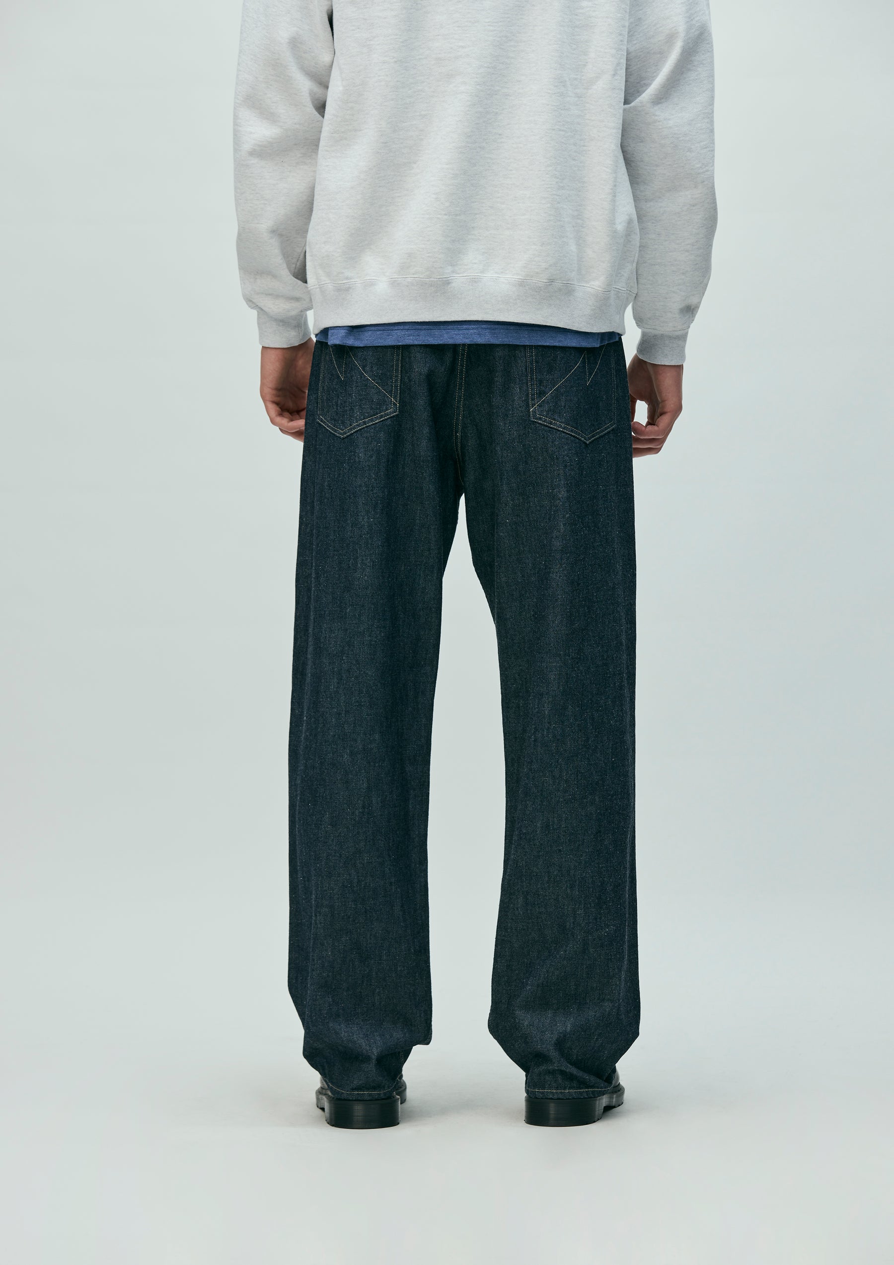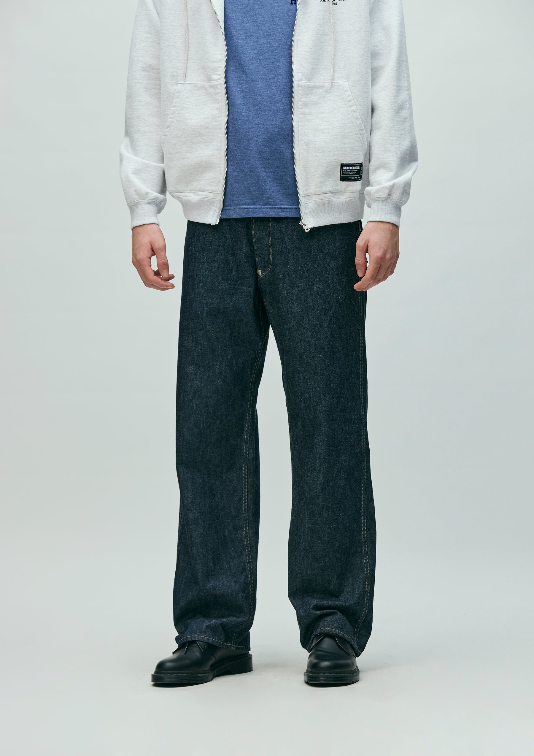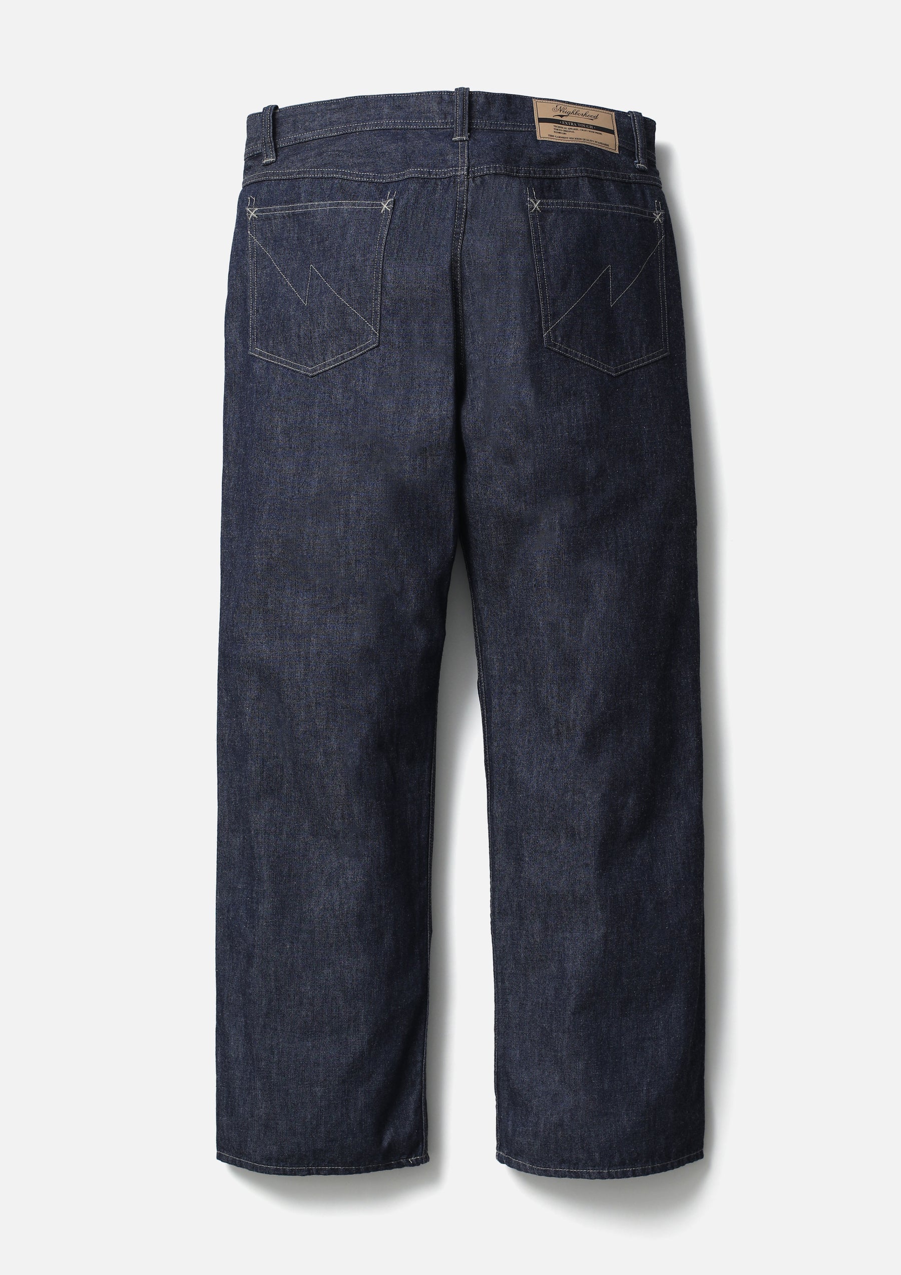 Utility pants made from original 11oz lightweight denim. Designed in a 5-pocket style with a coin pocket and N-stitched back pockets. Distinguished from standard NH denim by details such as the reverse use of the waistband lining fabric, double-stitched chain seams on the waistband, high-placed yoke stitching, and bar-tacked reinforcements at the back pocket openings. Finished with original tack buttons, zipper pulls, and a paper patch. A woven side label is attached at the side seam. Cut in a relaxed straight silhouette and completed with a one-wash finish.