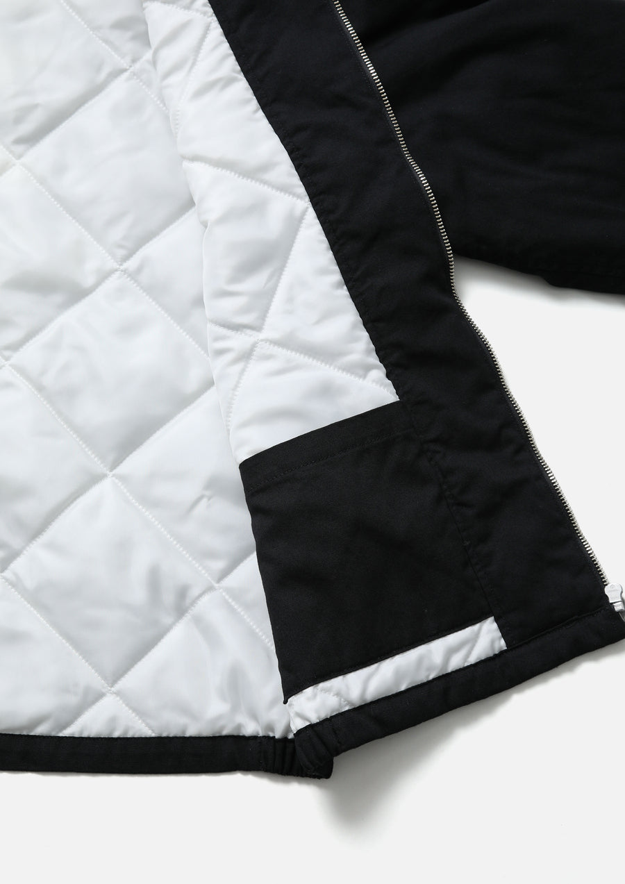 Racing jacket made from oxford fabric. Lined with diamond quilting for heat retention. Logos and graphics are expressed through embroidery. Finished with original buttons and zipper pulls. A woven side label is attached at the side seam. Completed with a one-wash finish. Collaborative model with Team Ikuzawa.