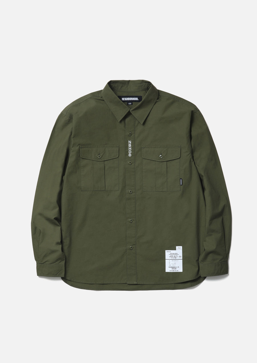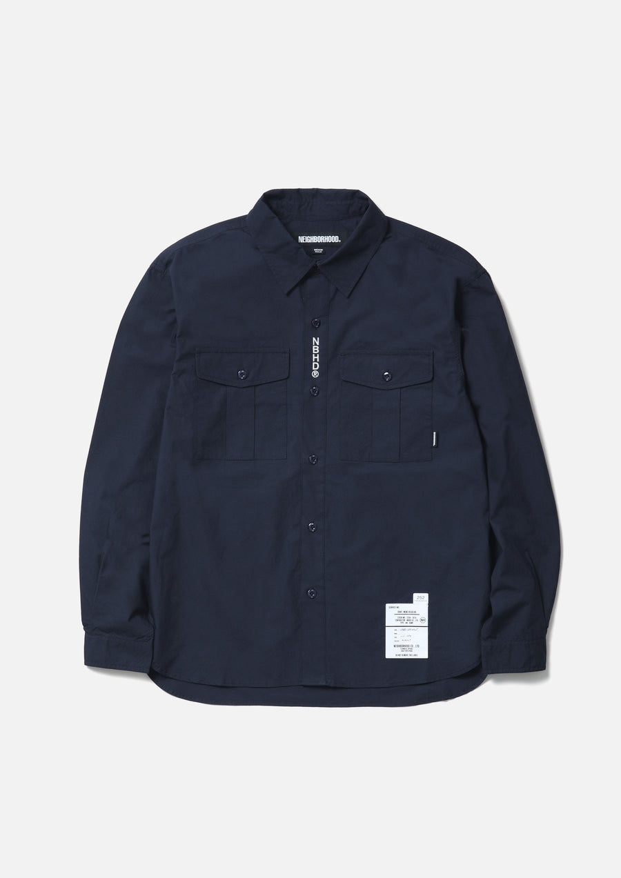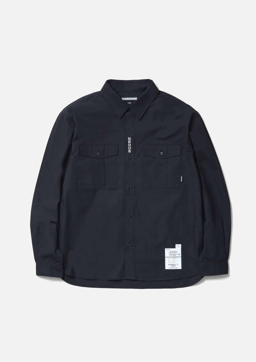 An officer shirt made from medium-weight typewriter fabric that has been specially processed to soften its stiffness. The side seams feature front and back chain stitch wrapping. Embroidered logo on the placket. Equipped with original four-hole buttons, a brand tag on the left hem and on the pocket side. One-wash finish.