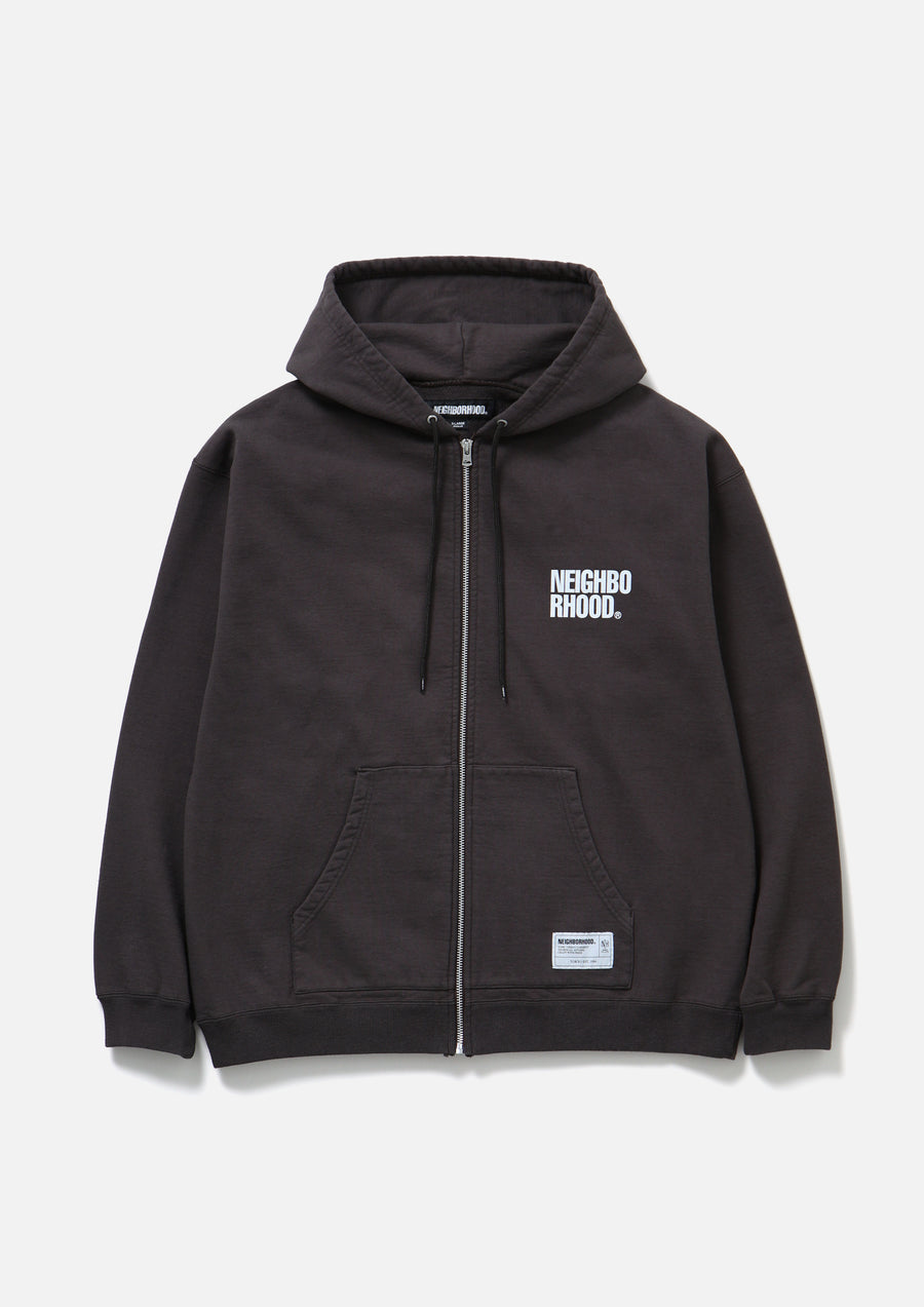 A zip hoodie made of tightly knit fleece-backed fabric. Features double-thread loops for both durability and softness. Printed logos on the left chest and back. Includes an original zipper pull and a brand tag on the side seam.