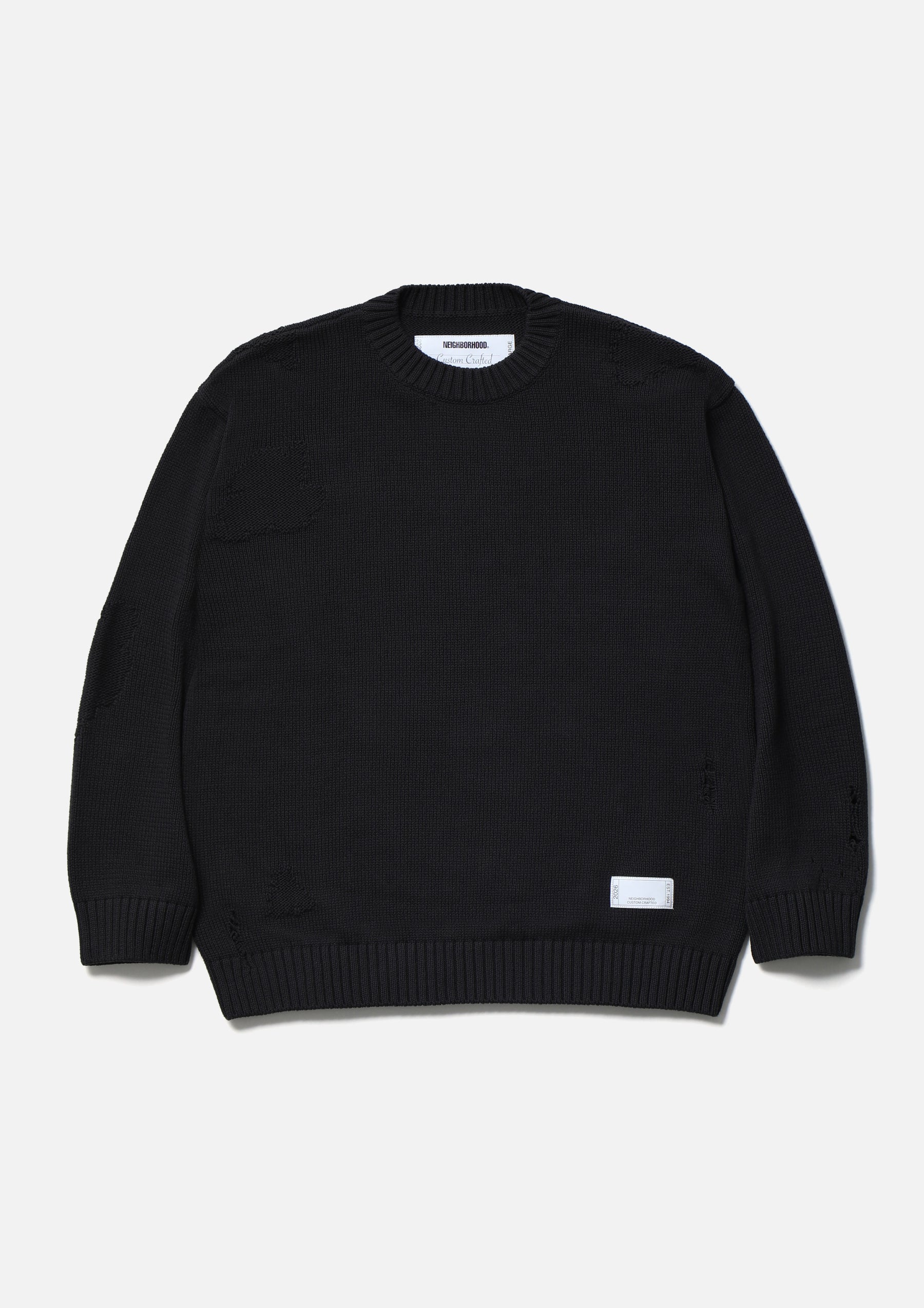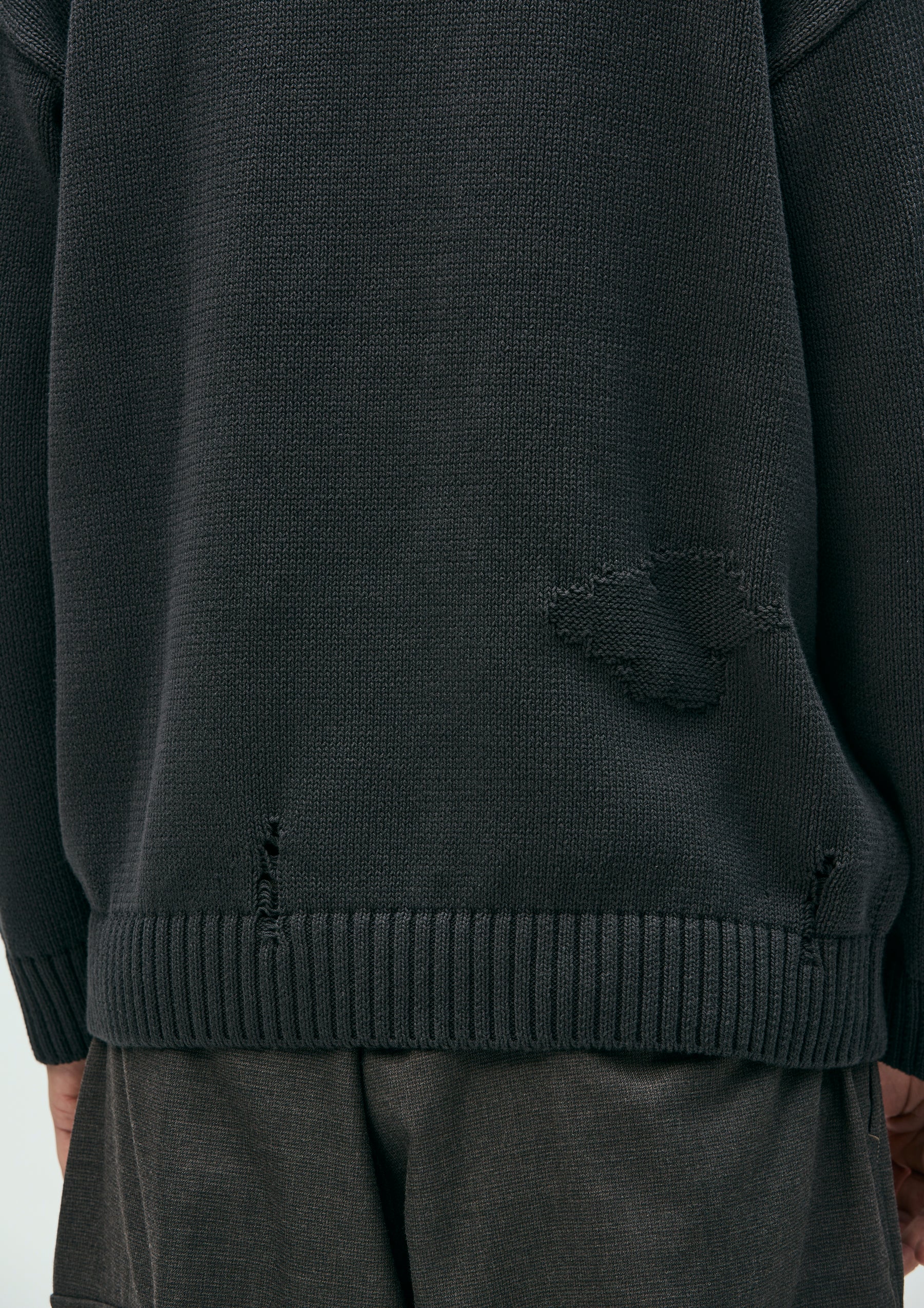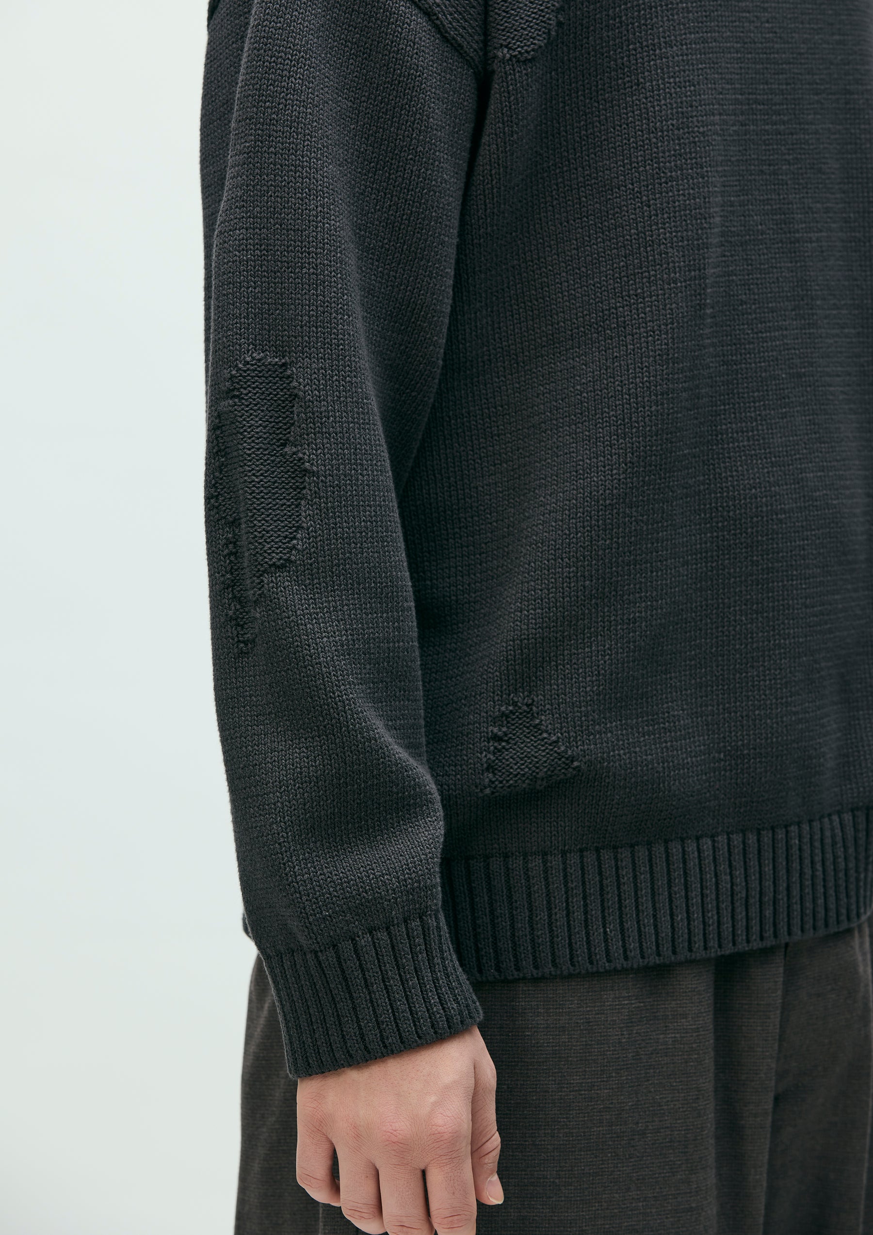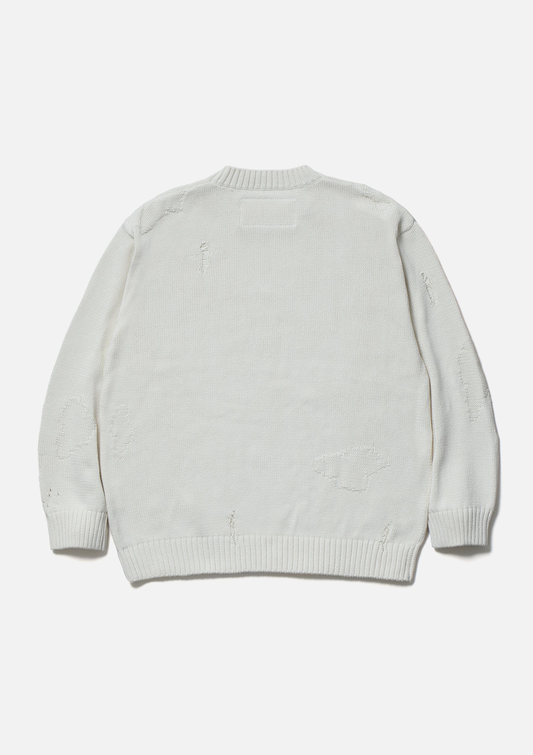 Savage crewneck knit crafted in 5-gauge jersey using cotton yarn. Designed with damage detailing expressed through drop-needle holes and reverse-side knitting. Finished with a brand tag exclusive to the Custom Crafted line at the left hem.
