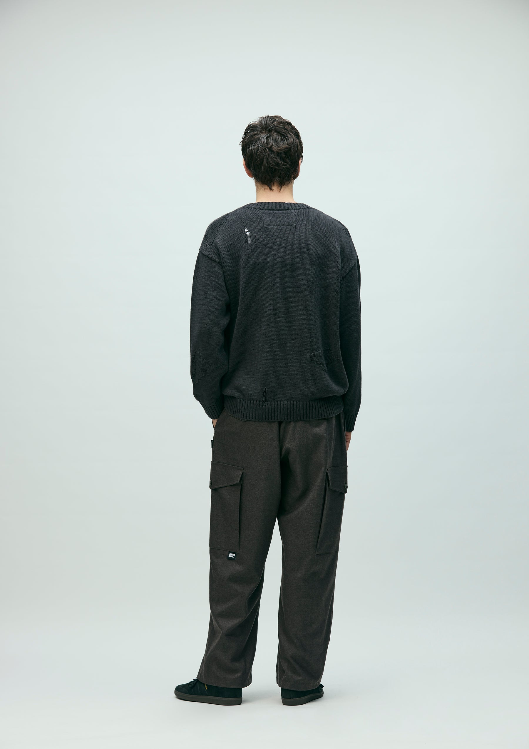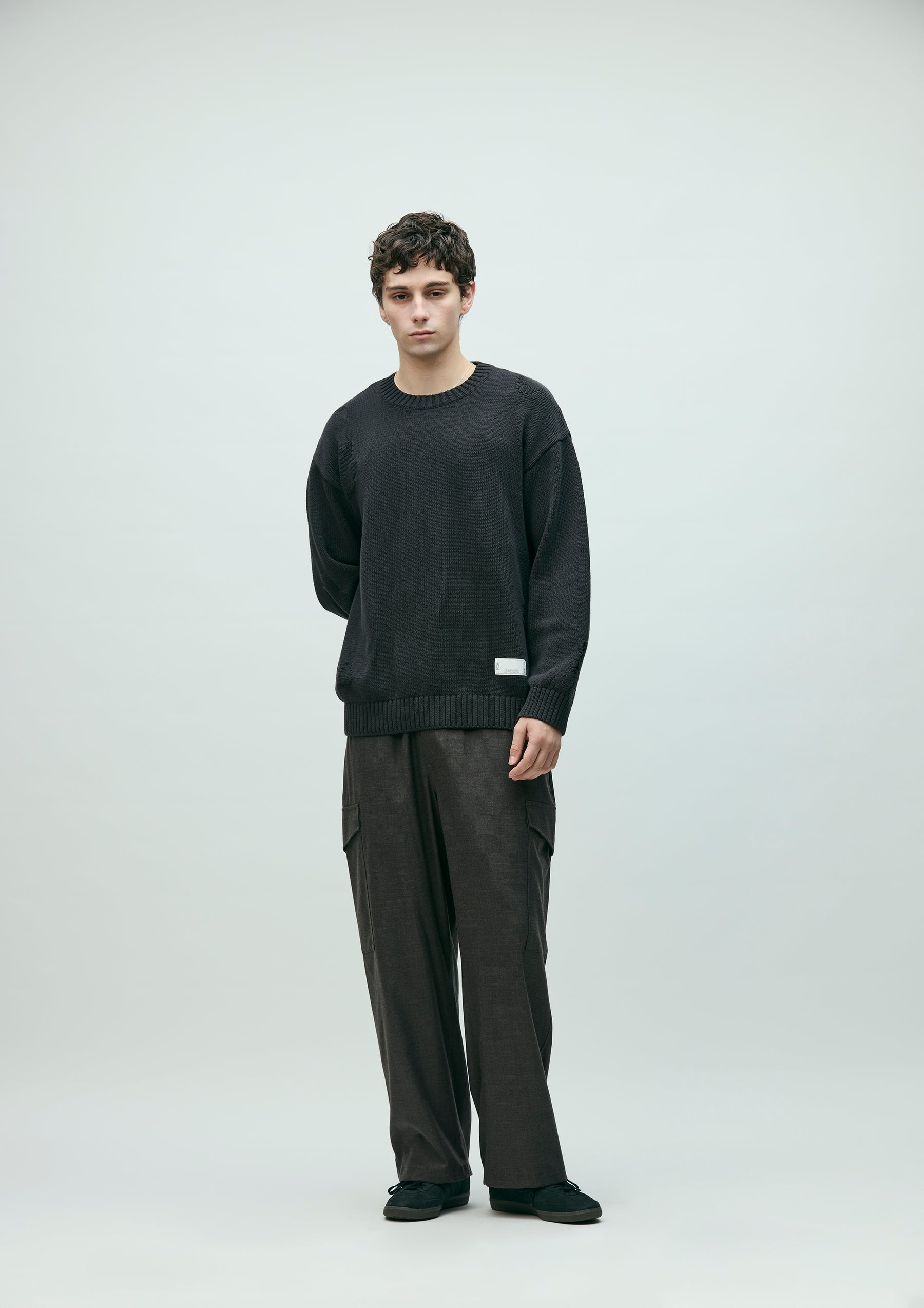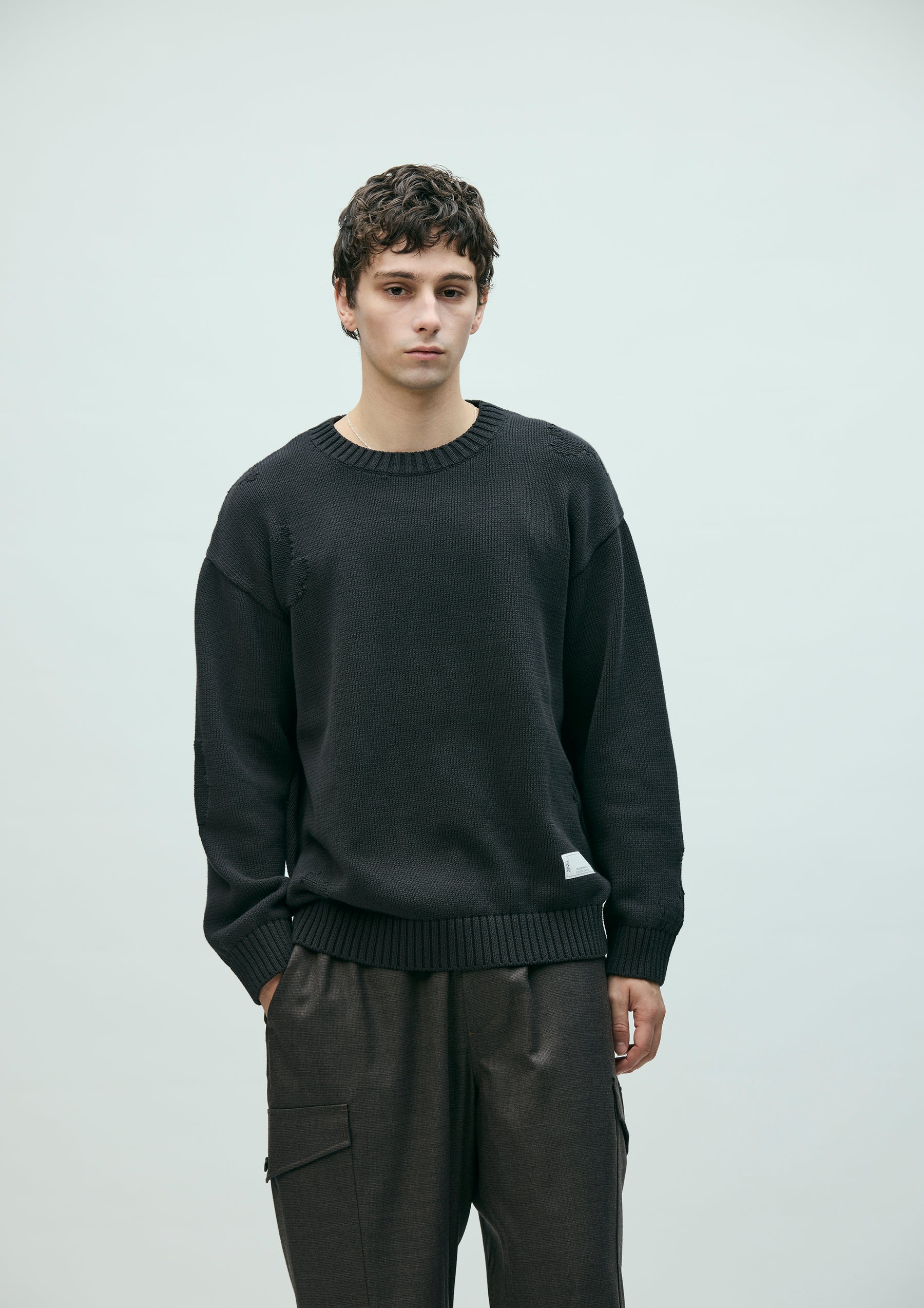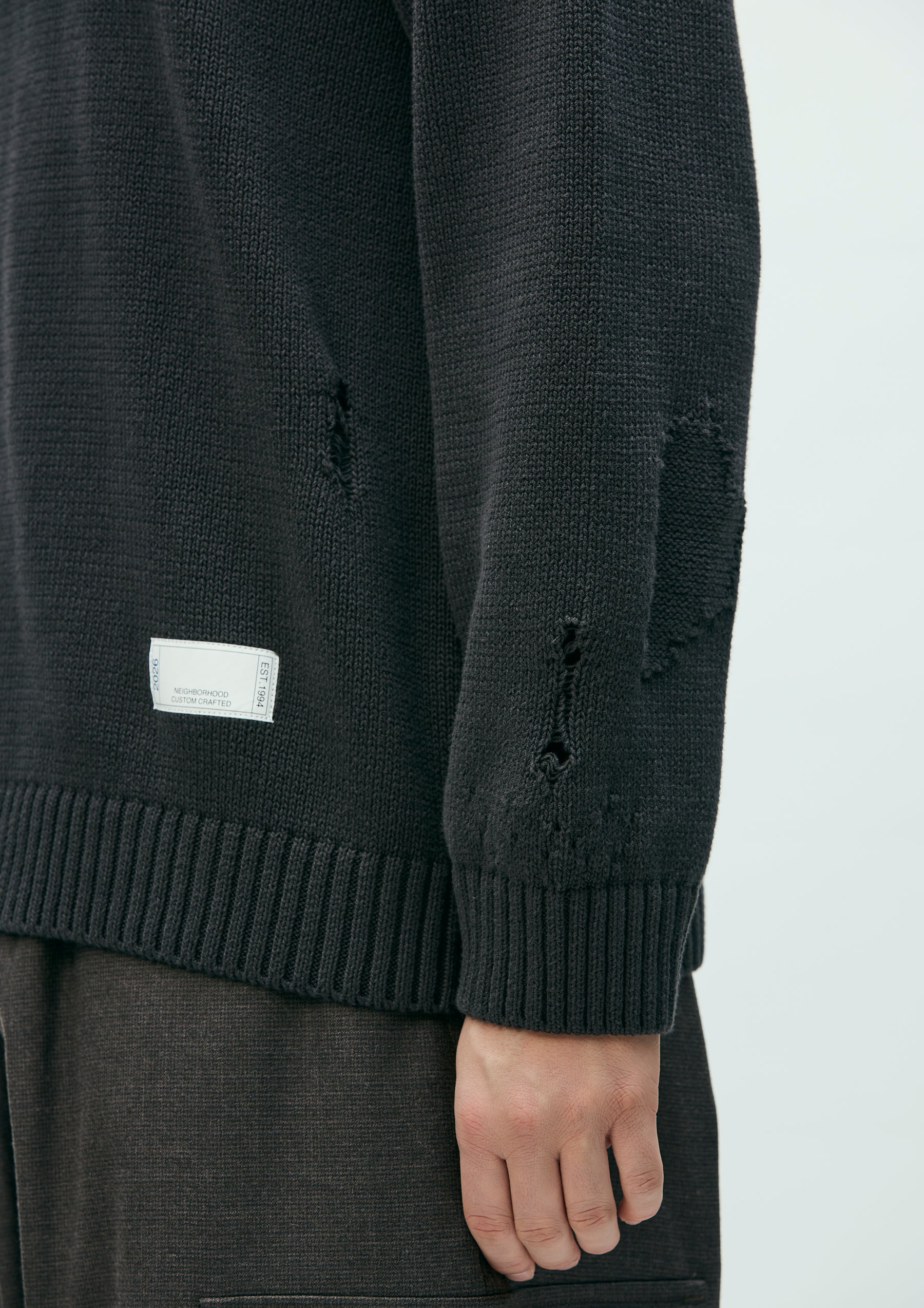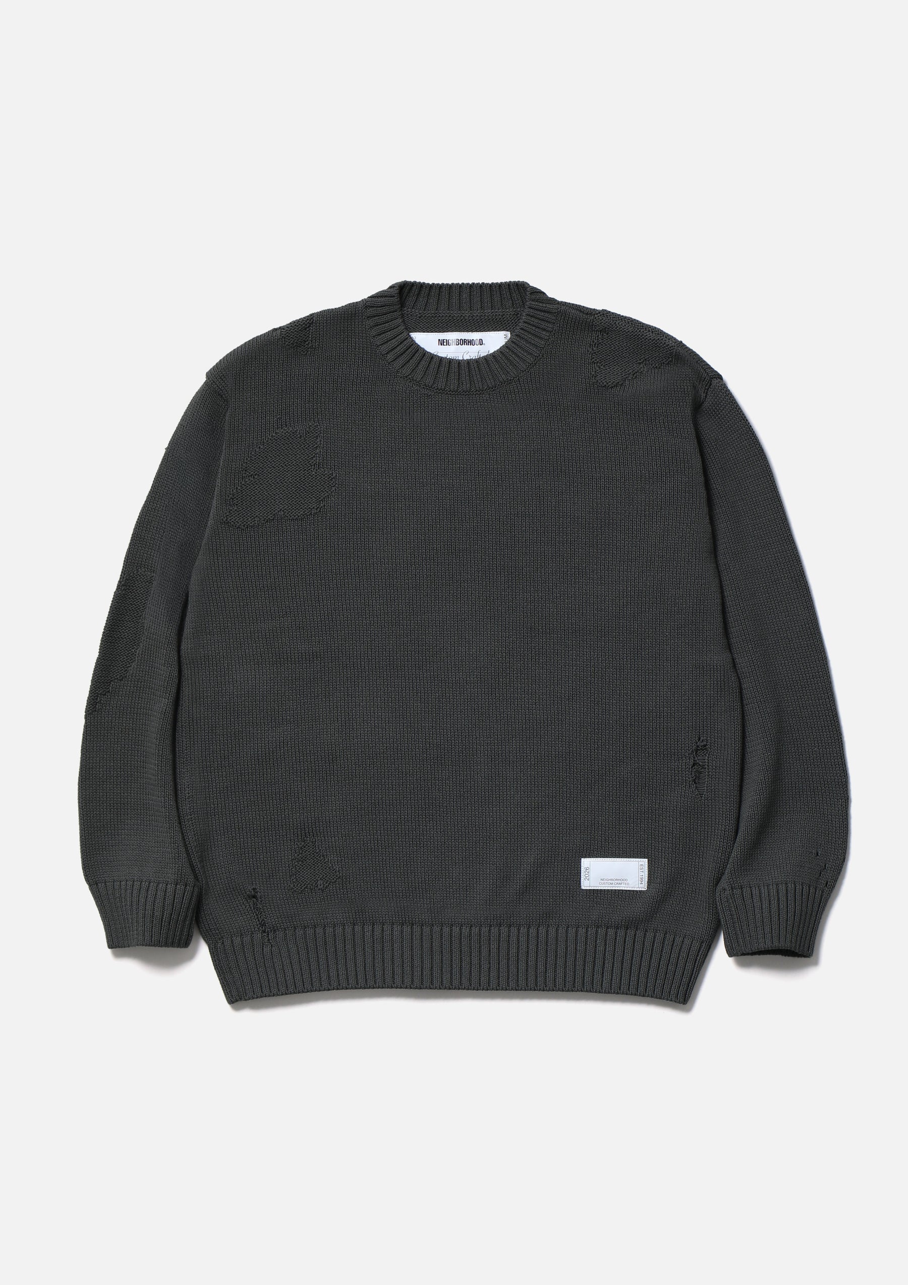 Savage crewneck knit crafted in 5-gauge jersey using cotton yarn. Designed with damage detailing expressed through drop-needle holes and reverse-side knitting. Finished with a brand tag exclusive to the Custom Crafted line at the left hem.
