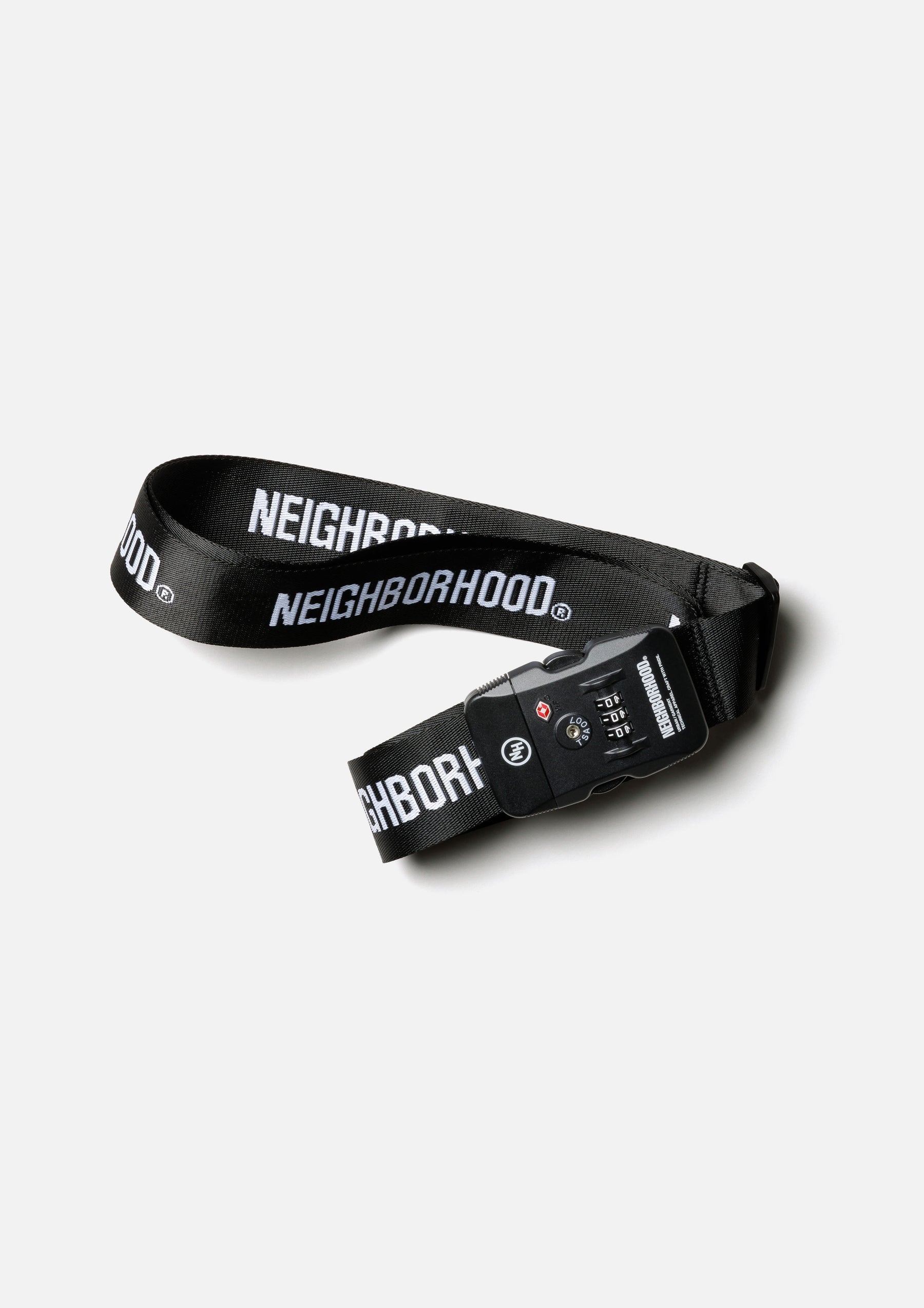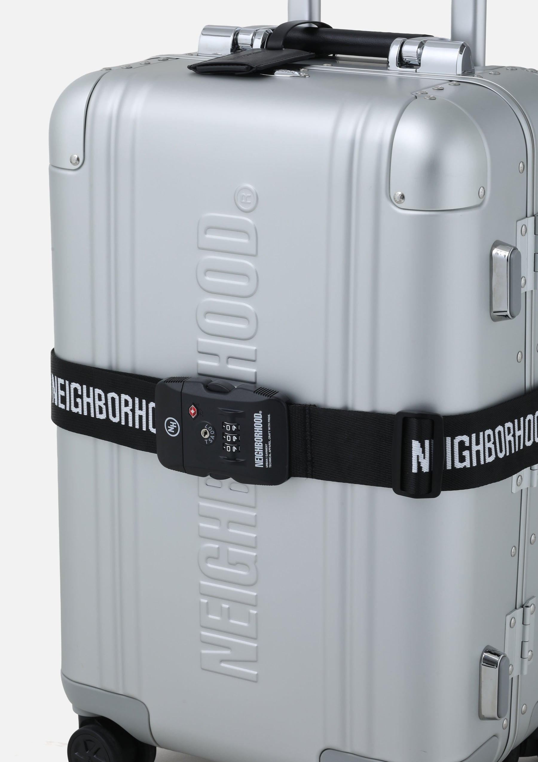 Suitcase belt featuring original jacquard tape with logo detailing and a custom buckle. The buckle is TSA lock-compatible, offering both security and convenience for travel.
