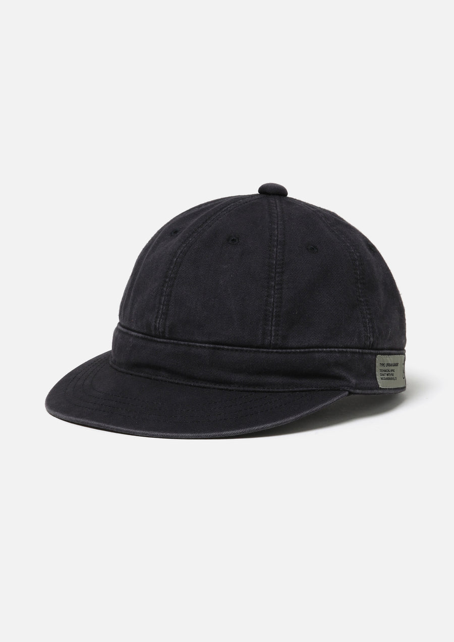 A baseball cap made from German cord cloth fabric, treated with ball bio-wash processing. The rear adjuster is made of leather and features an original buckle. Brand tag on the left side.