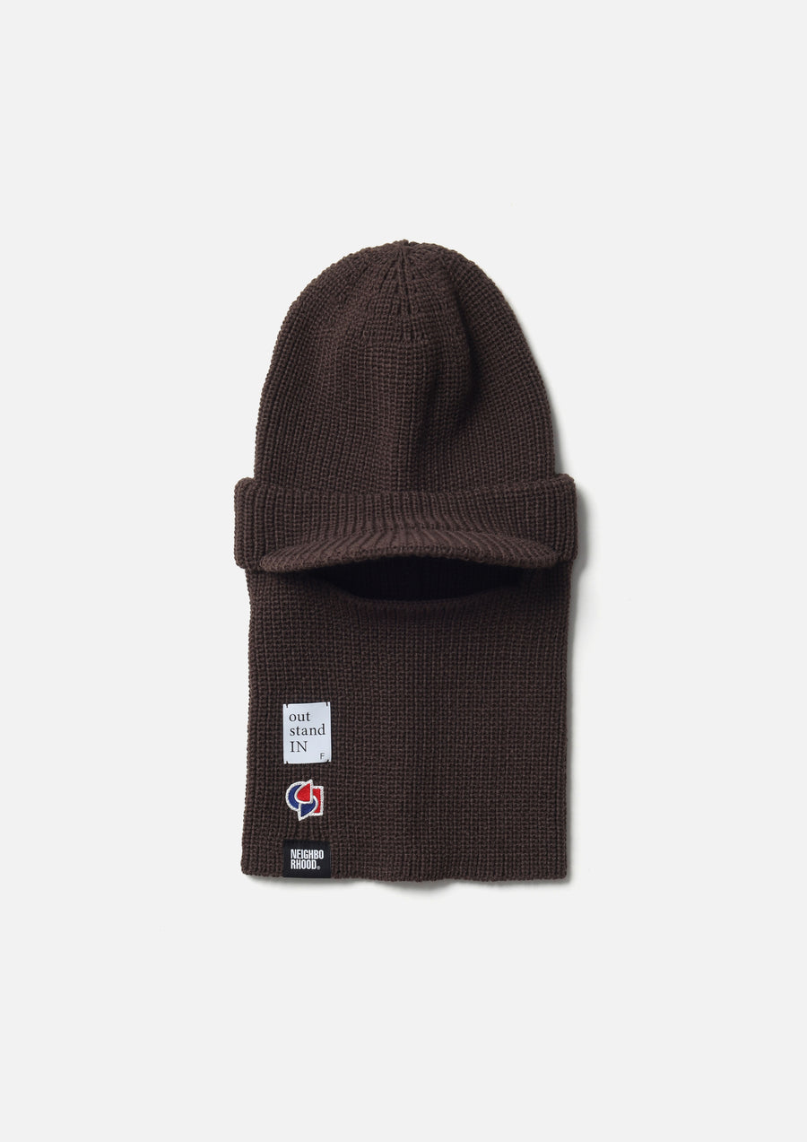 A collaborative item with out stand IN, a brand led by art director Tetsuya Nagato and designer/creative director Kazuki Kuraishi. A brimmed balaclava that can also be worn as a knit cap by storing the mask section. Made from acrylic yarn. Features a logo patch on the right hem.