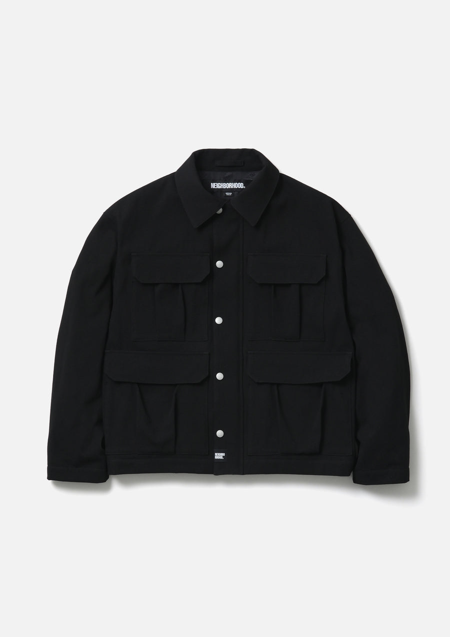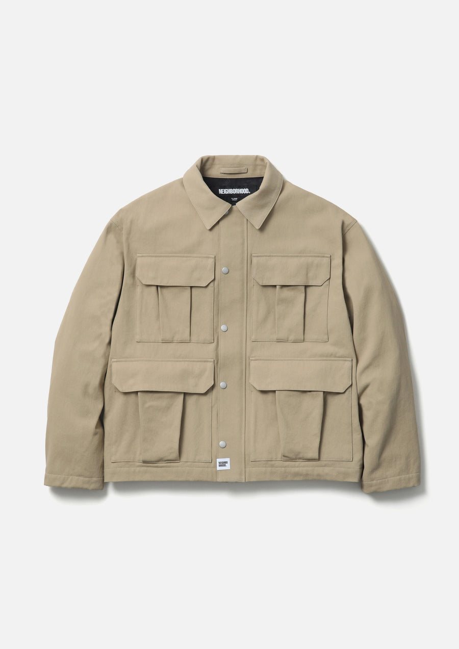 A utility jacket made from chino fabric featuring toughness from strong-twist yarns and a dry-touch texture. The front has a large placket with a zipper closure. Equipped with four utility pockets with tucks. The lining features a jacquard logo. A brand tag on the placket and on the side seam.