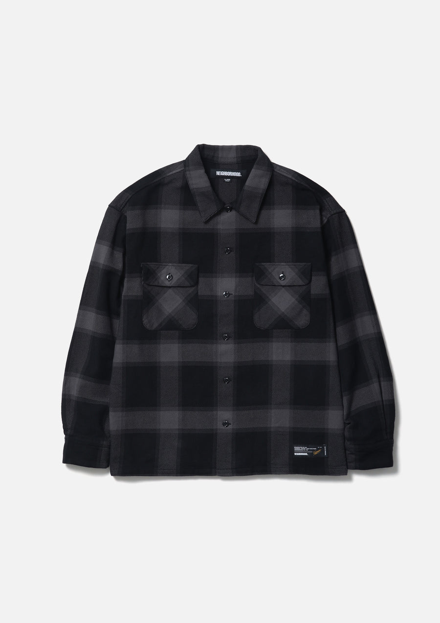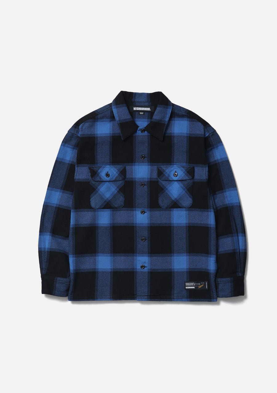 A check shirt with an original pattern, using thick yarn and brushed only on the inside. Maintains classic flannel shirt details. Equipped with original four-hole buttons, a brand tag on the left hem and side seam. One-wash finish.