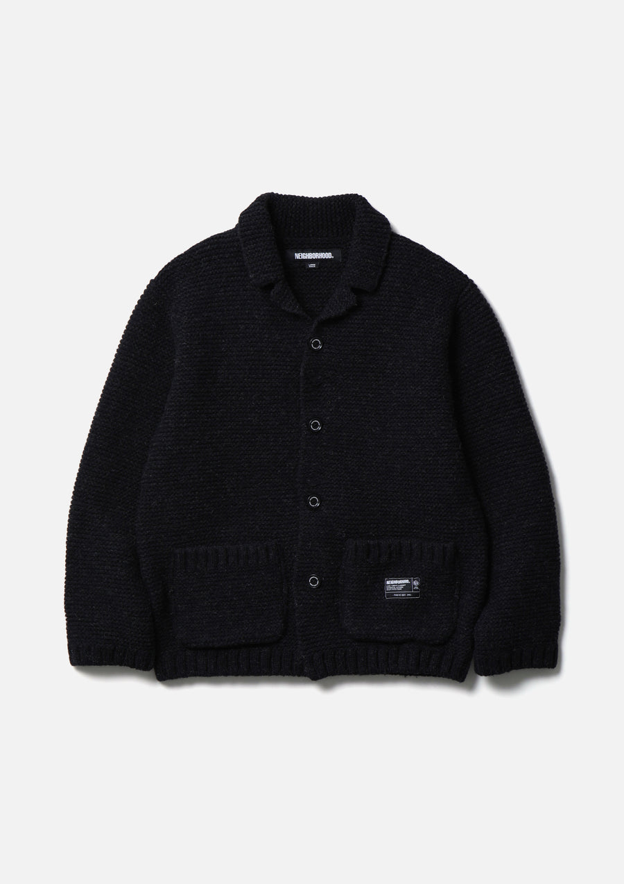 A knit jacket made of Shetland wool, finished with 3-gauge garter stitch knitting. Features original buttons with a logo and slogan. A brand tag is placed on the left pocket.