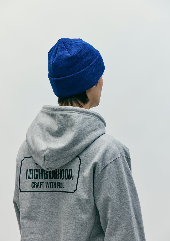 A crew neck cut-and-sew made of jersey fabric with a unique melange texture. Features a patch pocket on the left chest and a printed logo on the right sleeve. Includes a brand tag on the side seam.