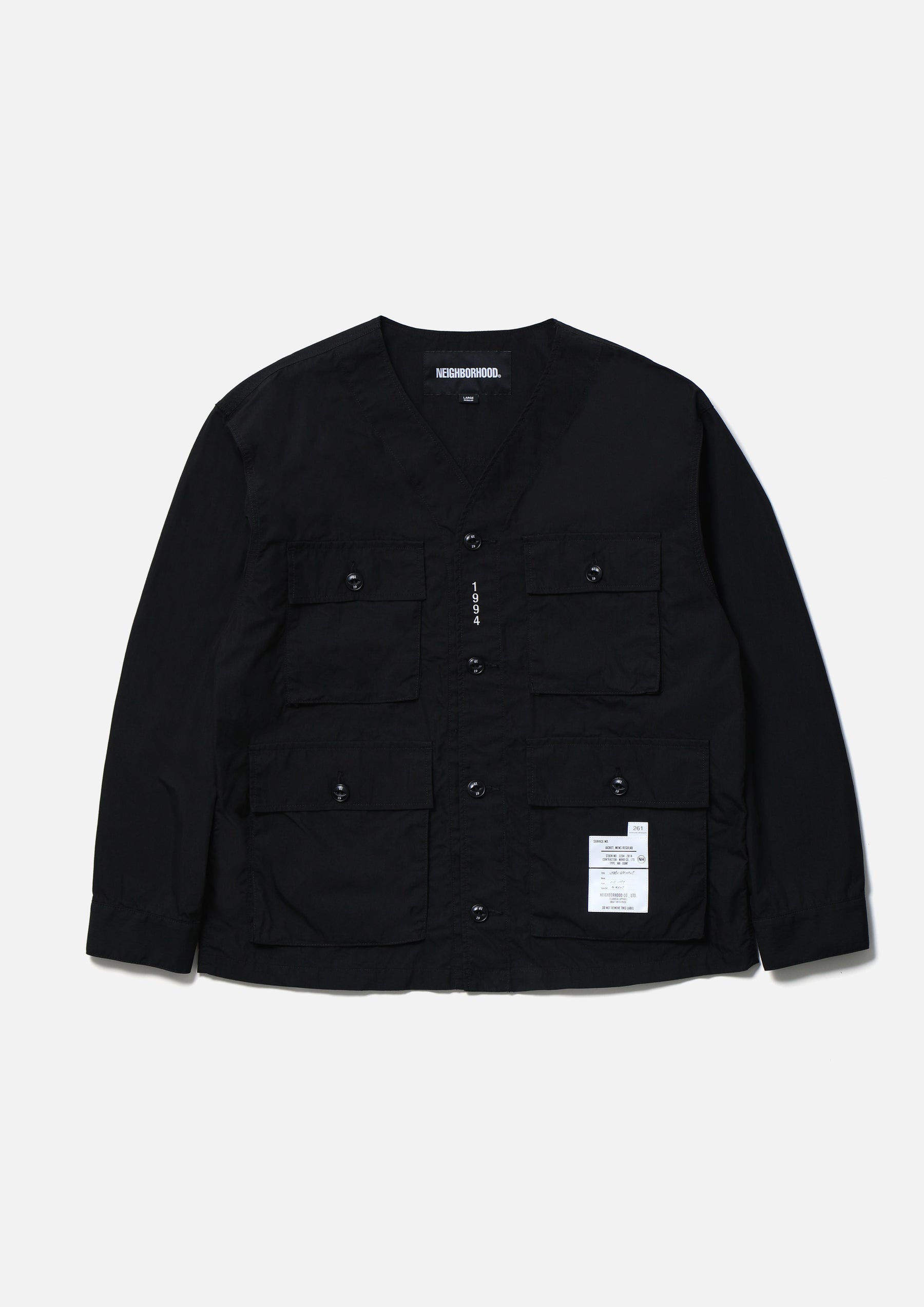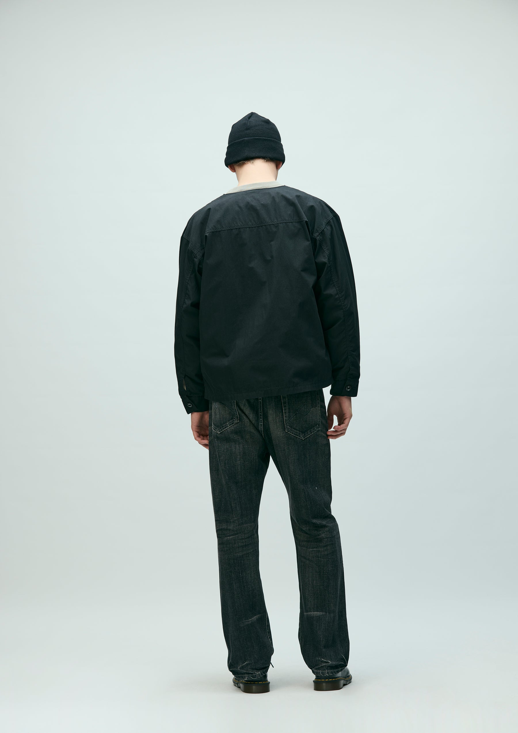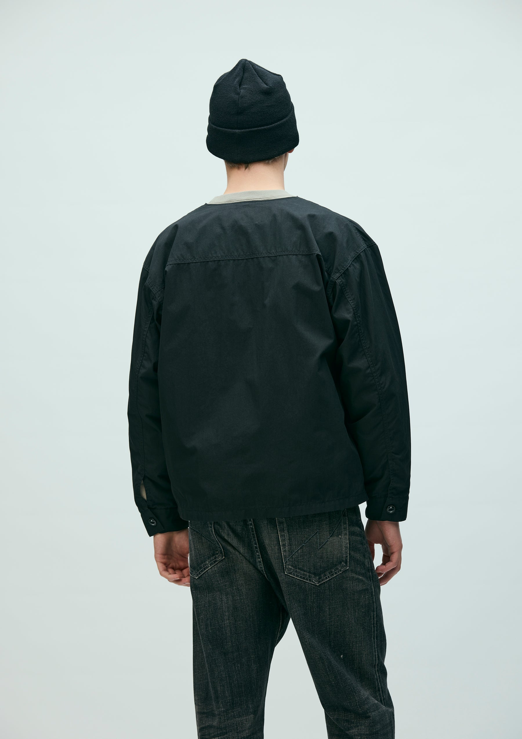 No Collar Utility Jacket made from a blended weather cloth that combines the natural feel of cotton with the structured firmness of nylon. Features“1994” embroidery between the first and second buttons, and four gusseted pockets on the front. Finished with original buttons. A brand tag is attached to the pocket, and a woven side label is placed at the side seam. Completed with a one-wash finish.