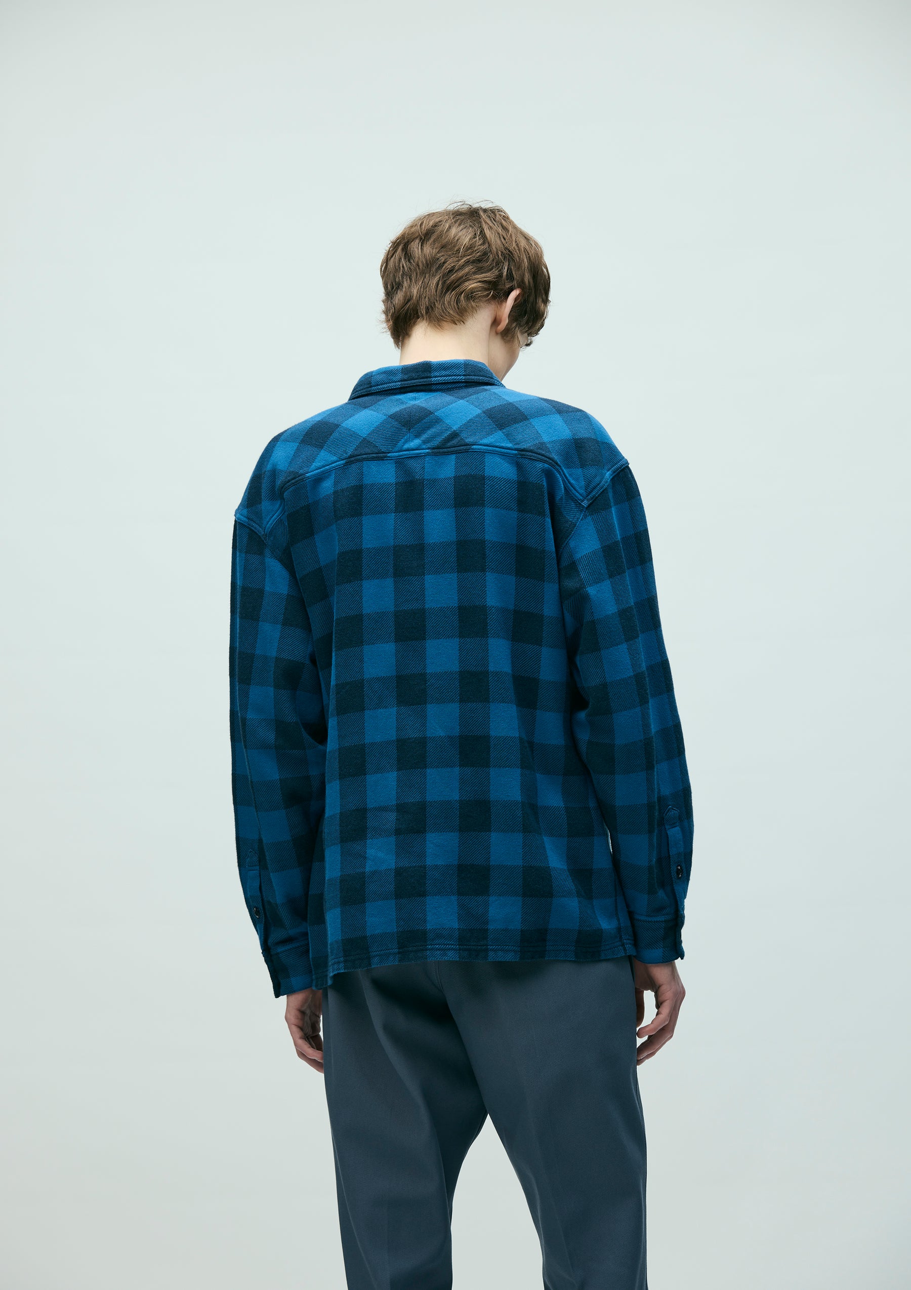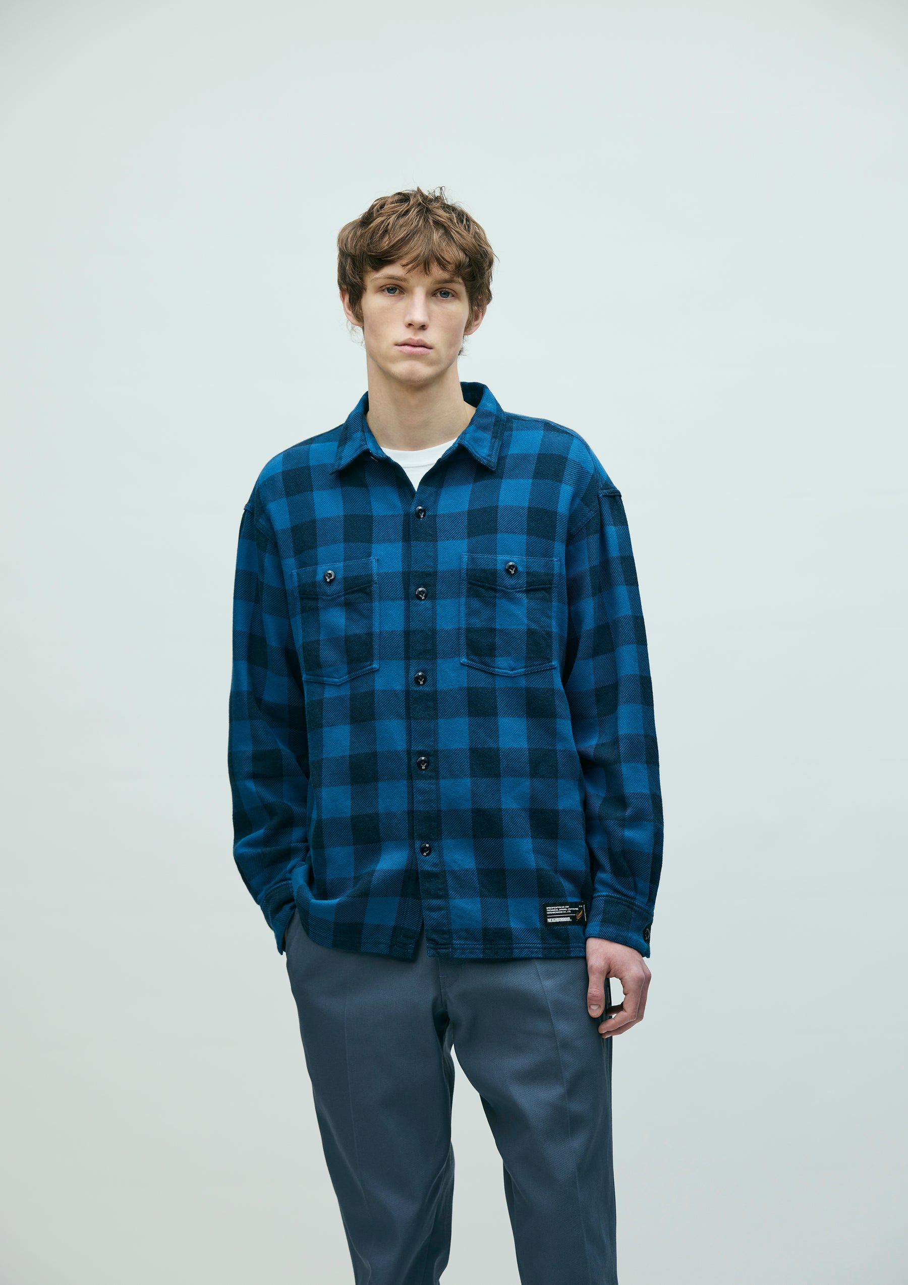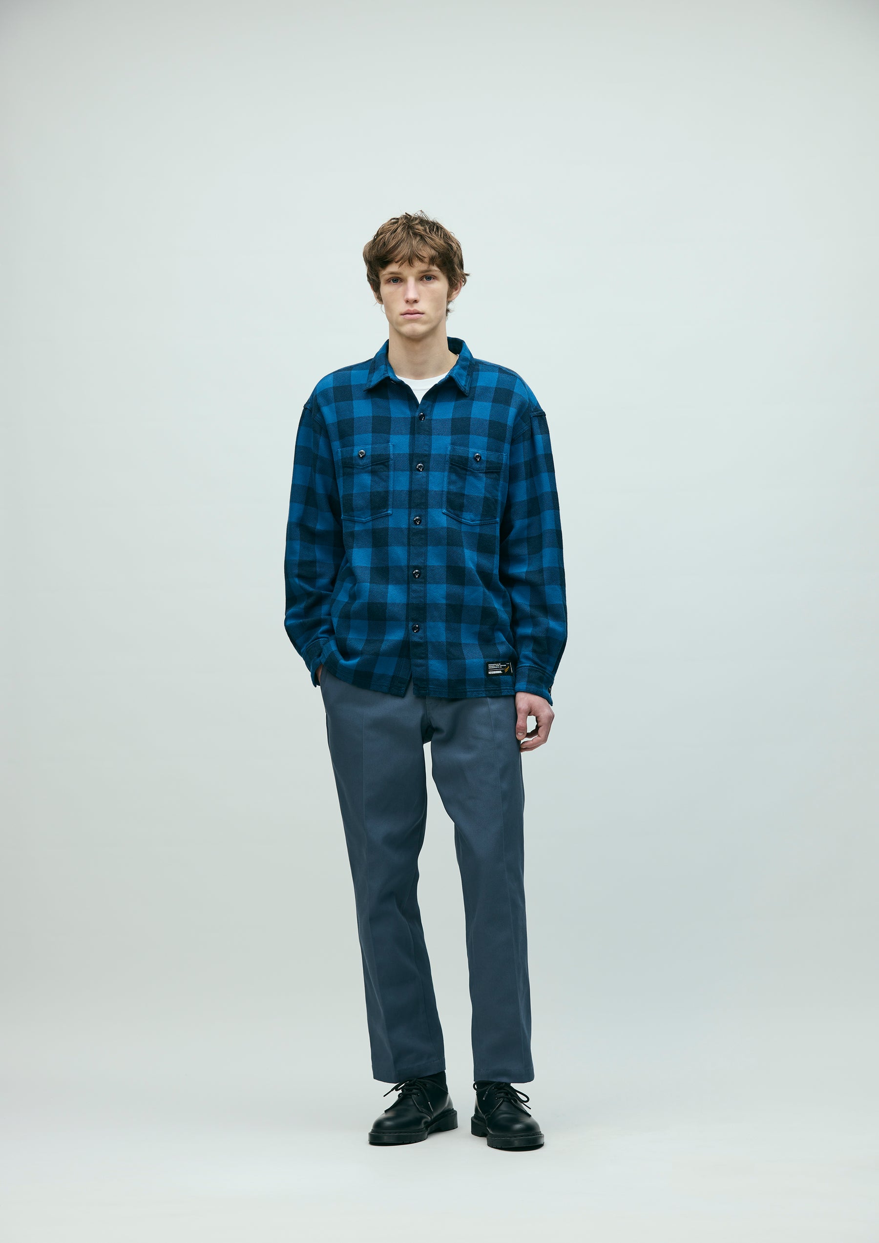 Block check shirt made from an original heathered-yarn textile, finished with garment dyeing. With repeated wear, it develops a faded look, richer tones, and a softer texture. Cut in a boxy silhouette that follows classic detailing. A brand tag is placed at the left hem and inside the front placket, with a woven side label at the side seam. Finished with original buttons and a one-wash process.
