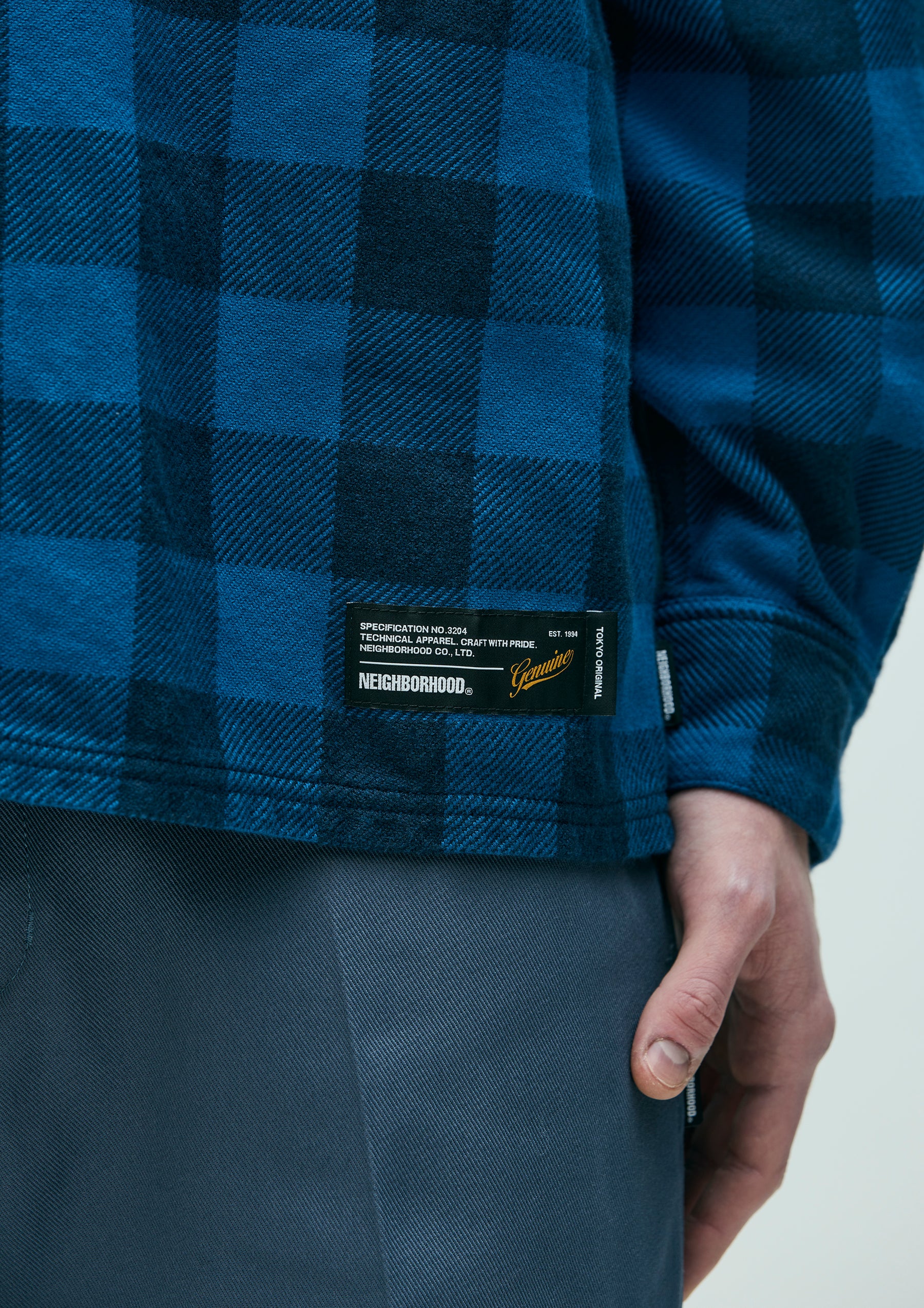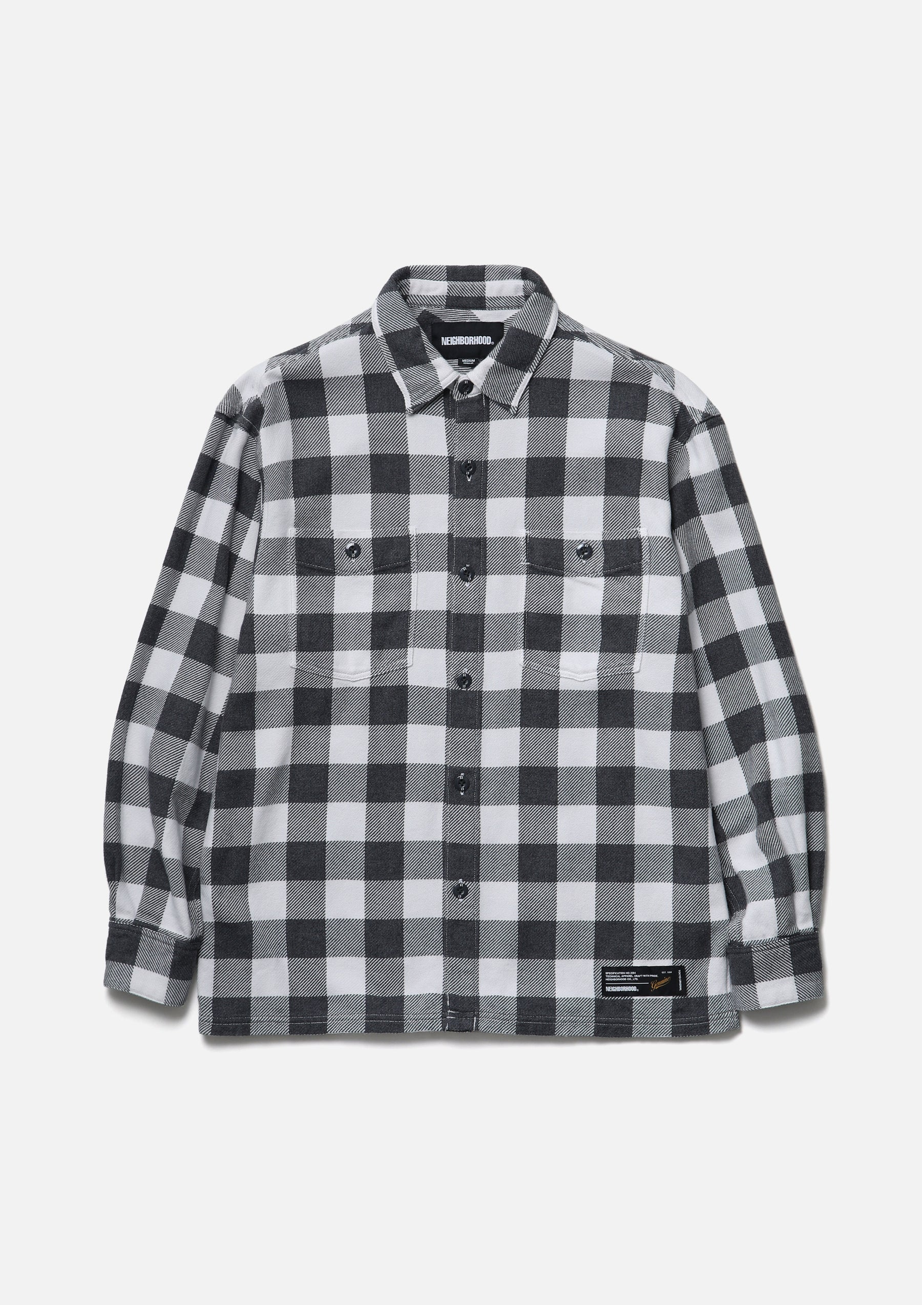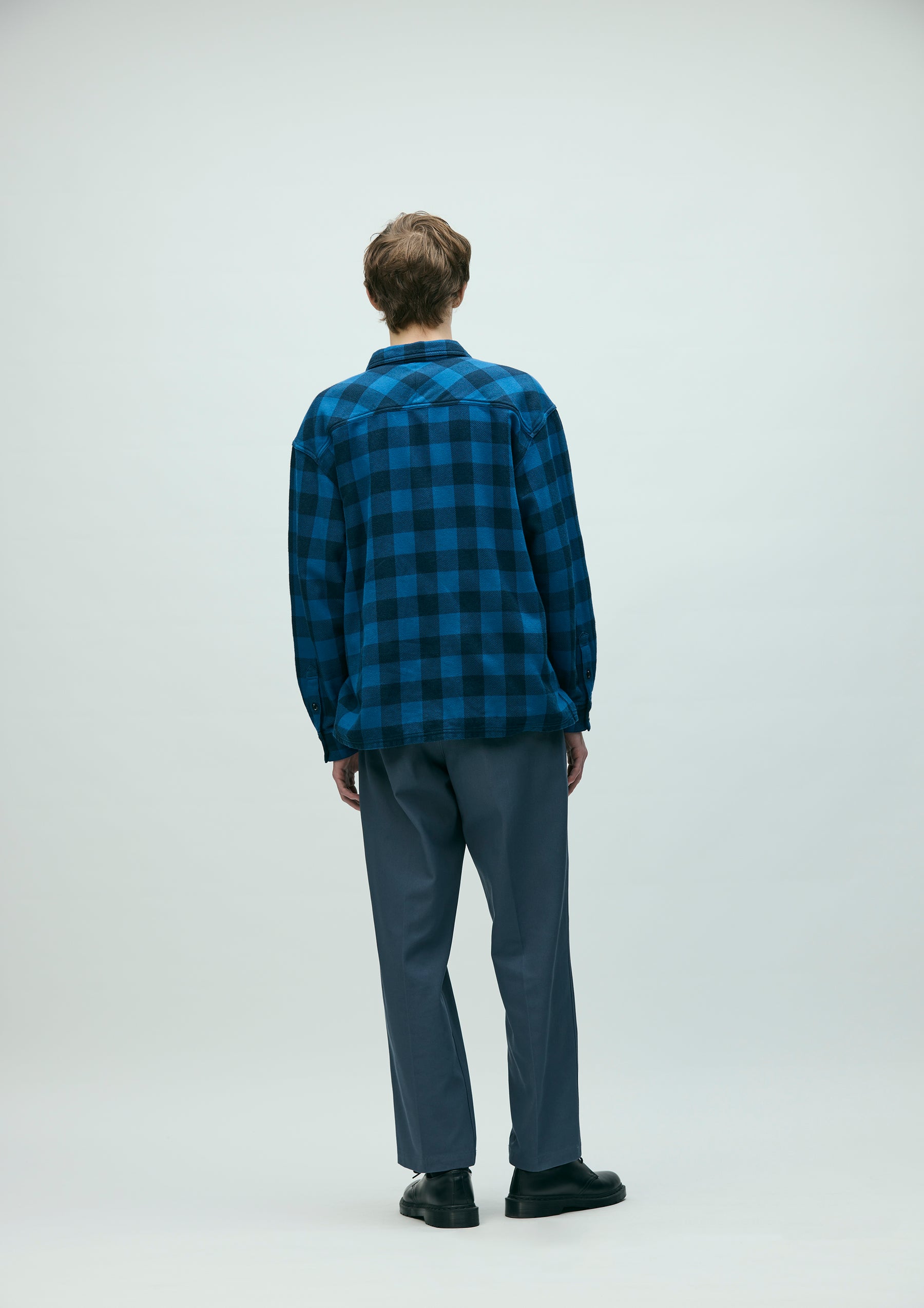 Block check shirt made from an original heathered-yarn textile, finished with garment dyeing. With repeated wear, it develops a faded look, richer tones, and a softer texture. Cut in a boxy silhouette that follows classic detailing. A brand tag is placed at the left hem and inside the front placket, with a woven side label at the side seam. Finished with original buttons and a one-wash process.