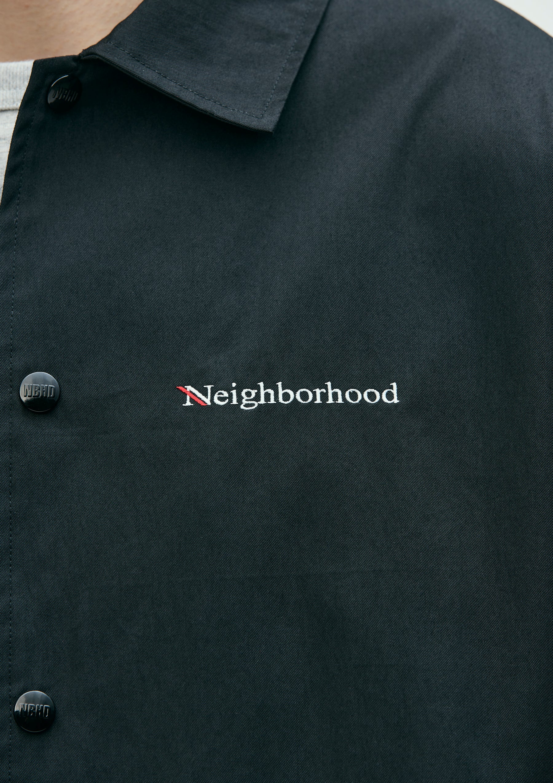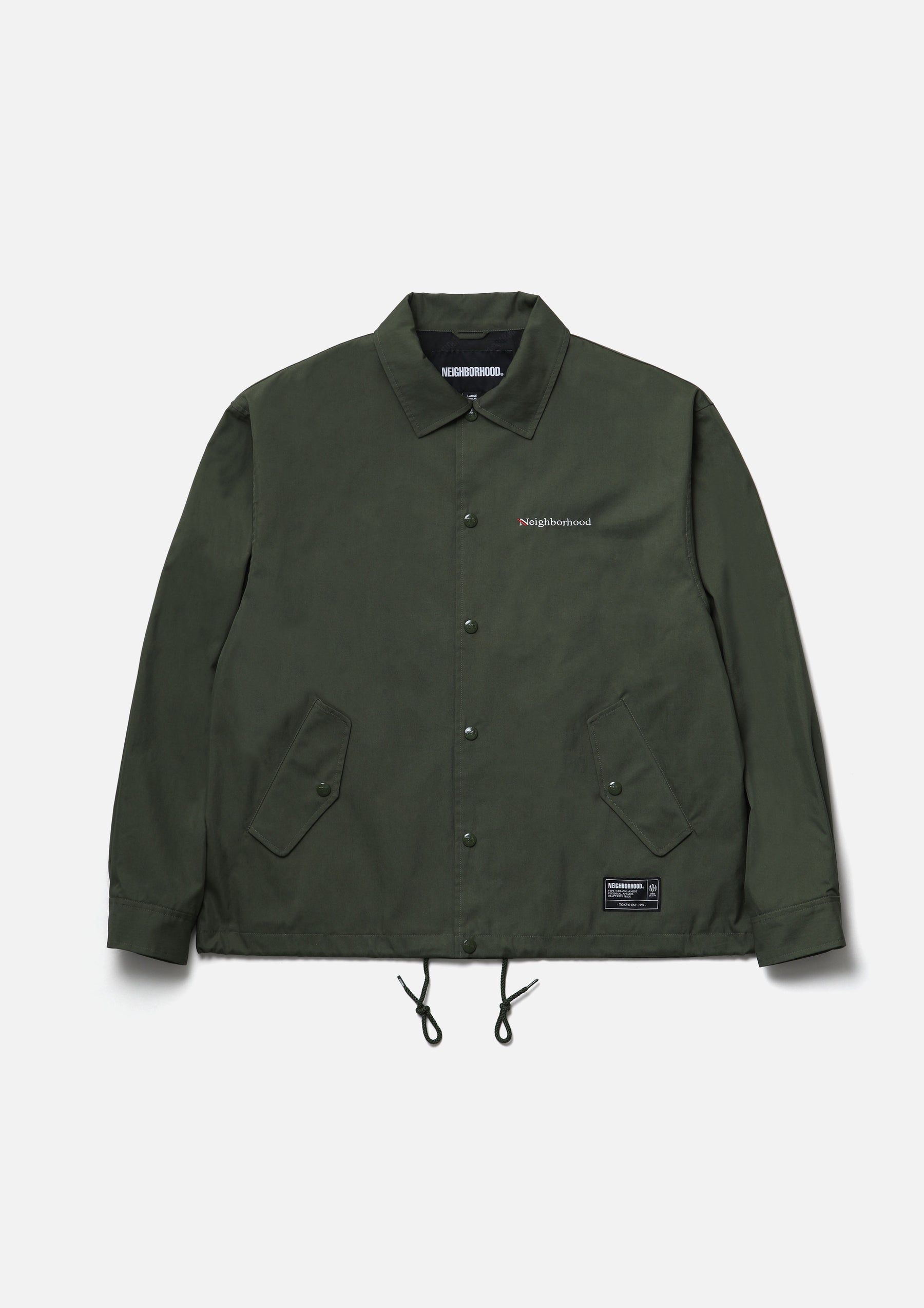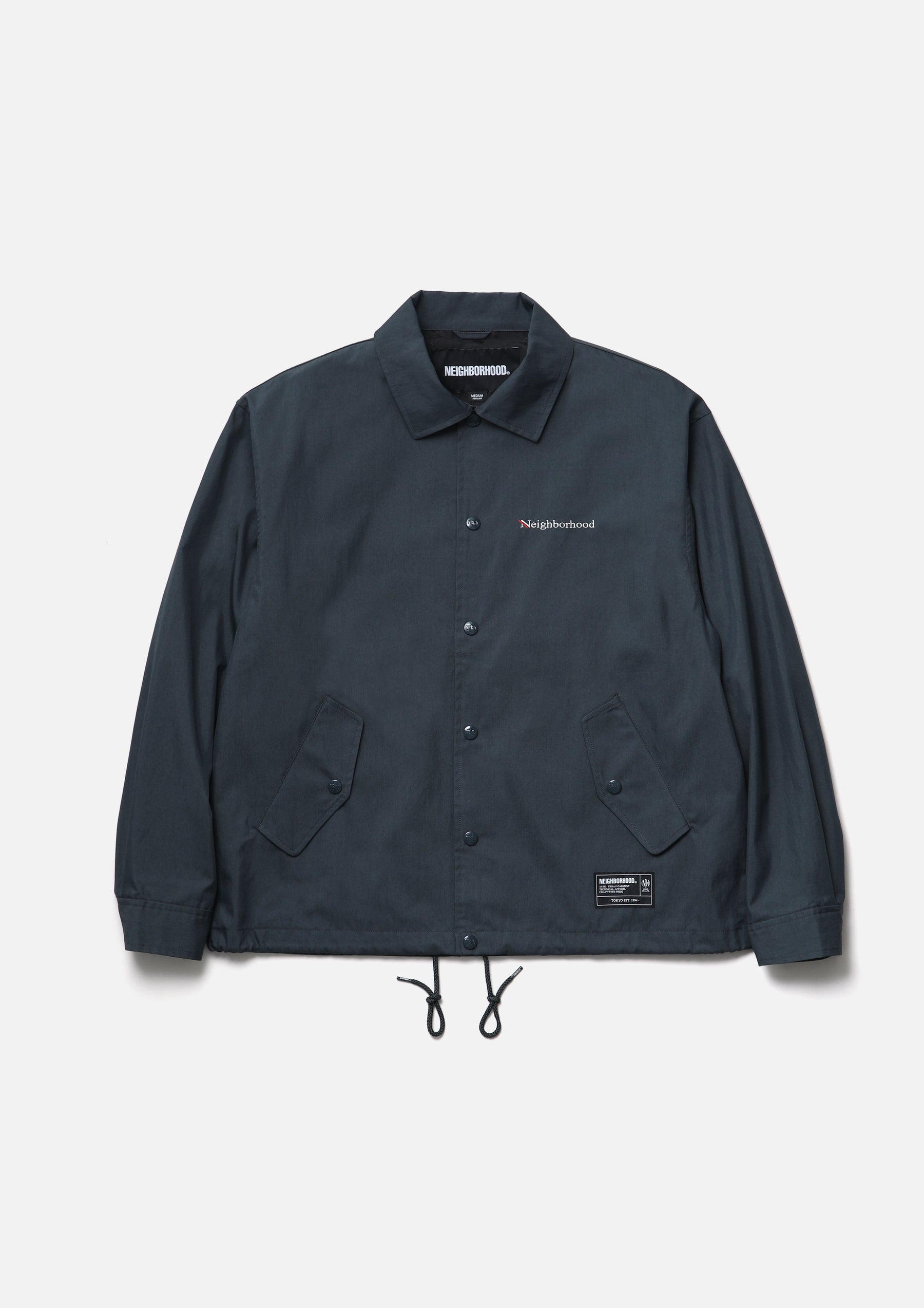 Windbreaker jacket made from a cotton/nylon blended gabardine fabric with a special treatment that gives it a dry, matte texture. Features buttoned flap pockets on both sides and an adjustable drawcord built into the hem. A logo is embroidered on the left chest. Finished with original snap buttons and a jacquard lining. A brand tag is attached at the left hem, and a woven side label is placed at the side seam.