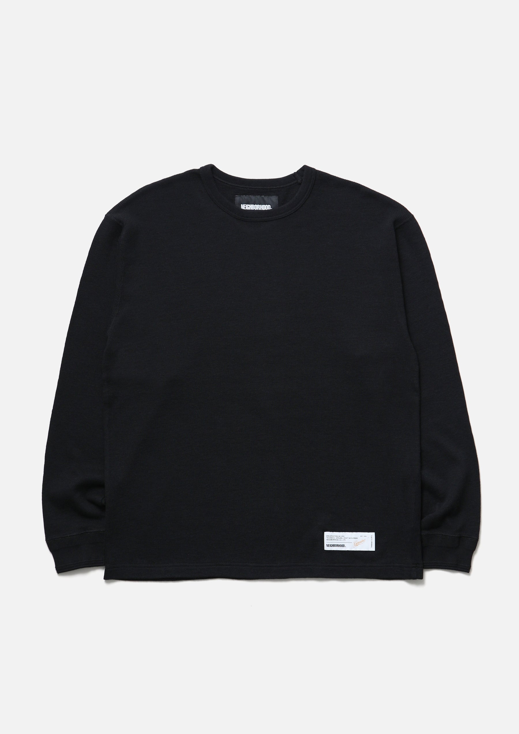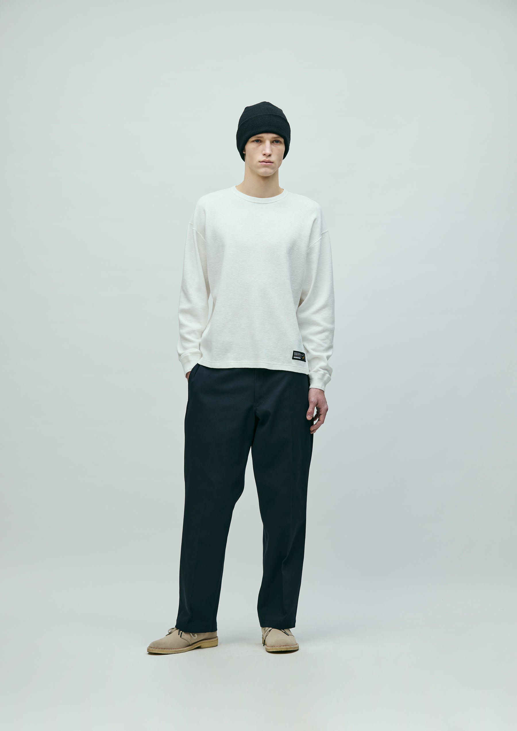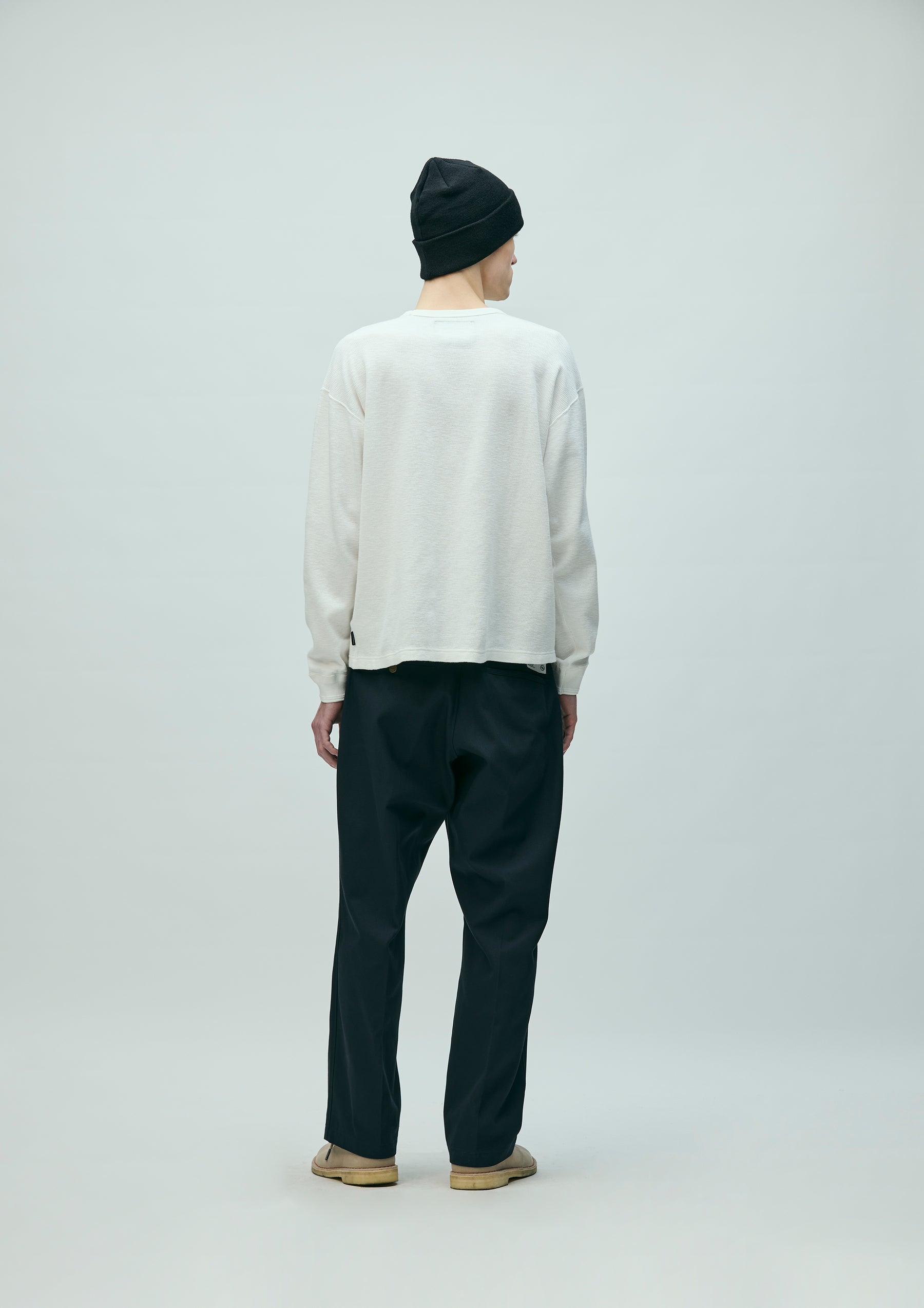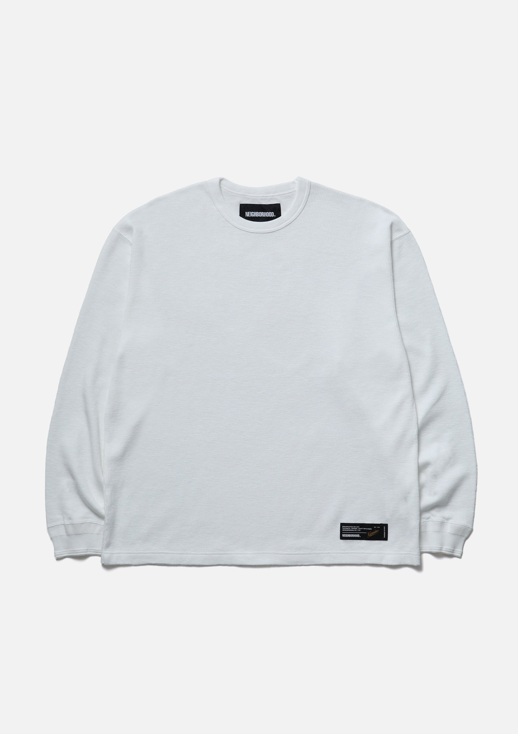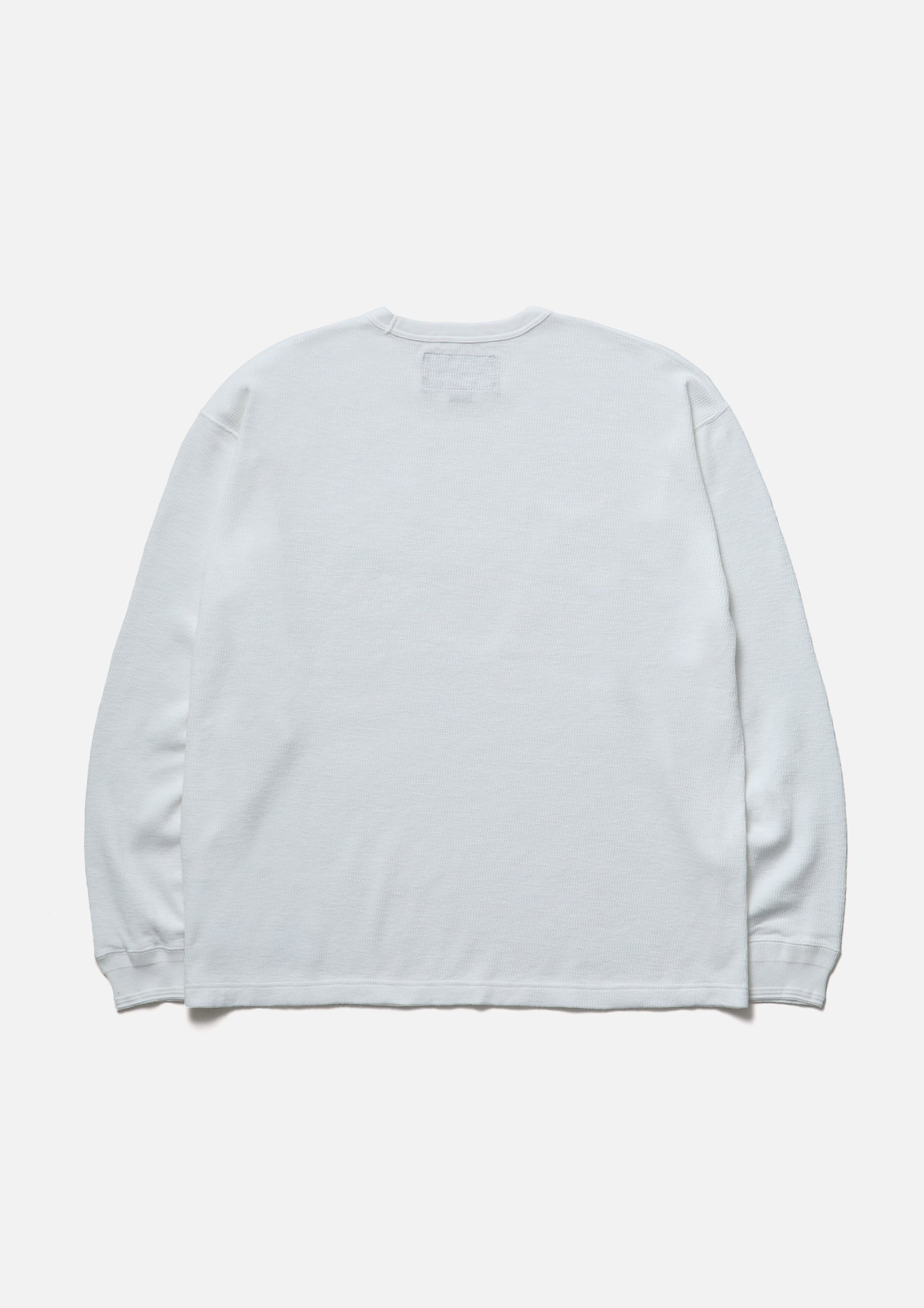 Long-sleeve crewneck cut-and-sew top made from honeycomb waffle fabric. A brand tag is placed at the left hem, and a woven side label is attached at the side seam. Completed with a one-wash finish.