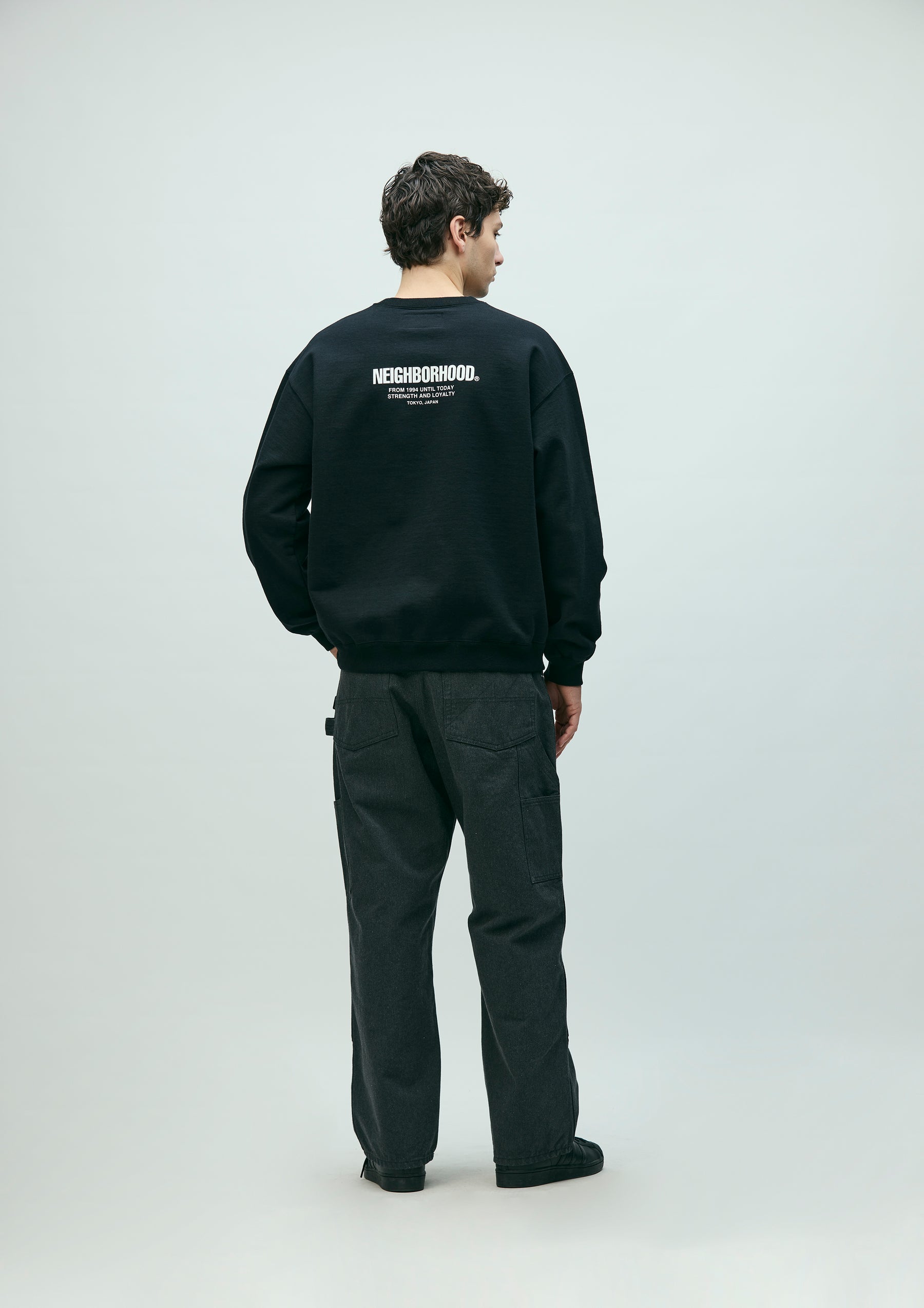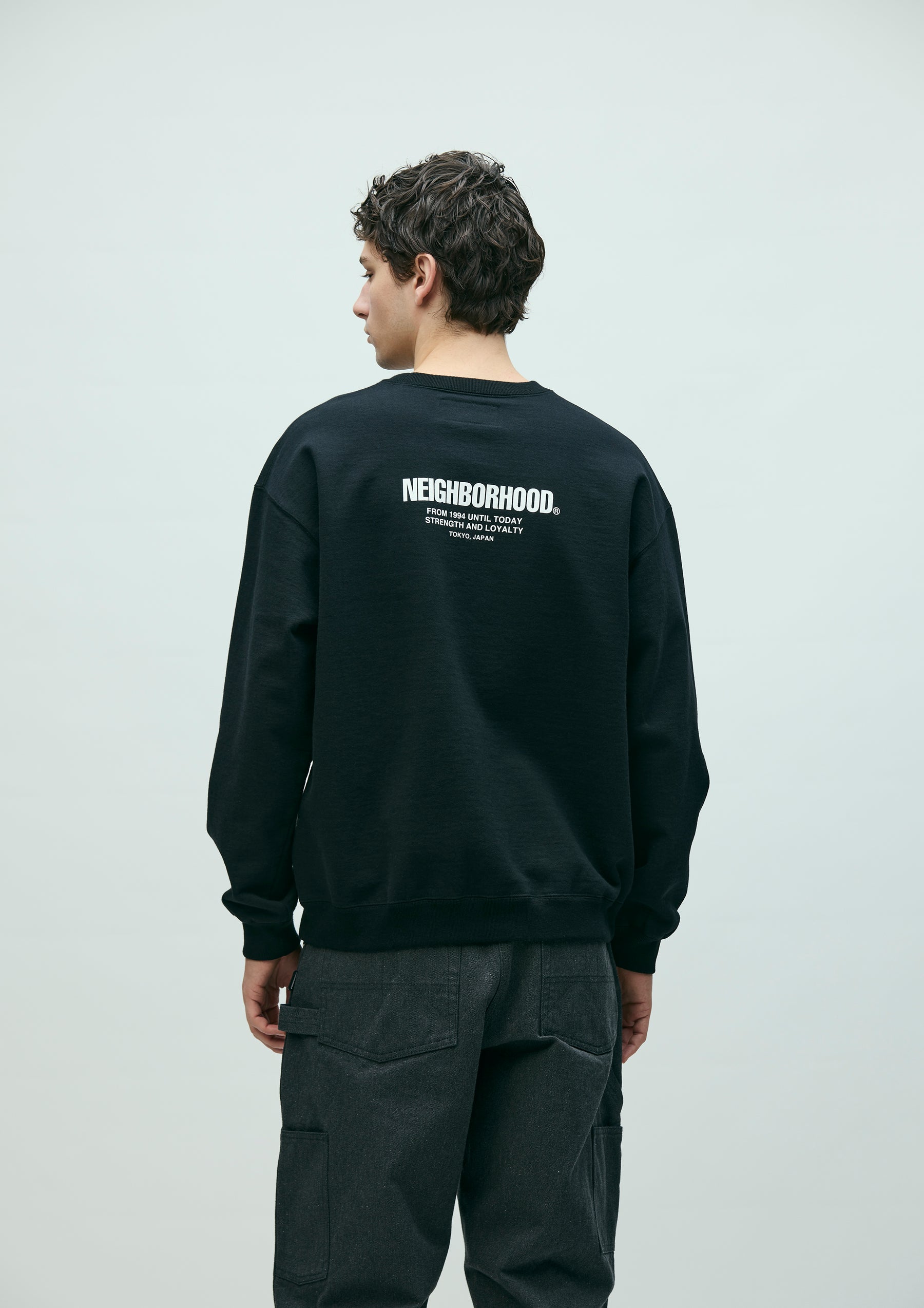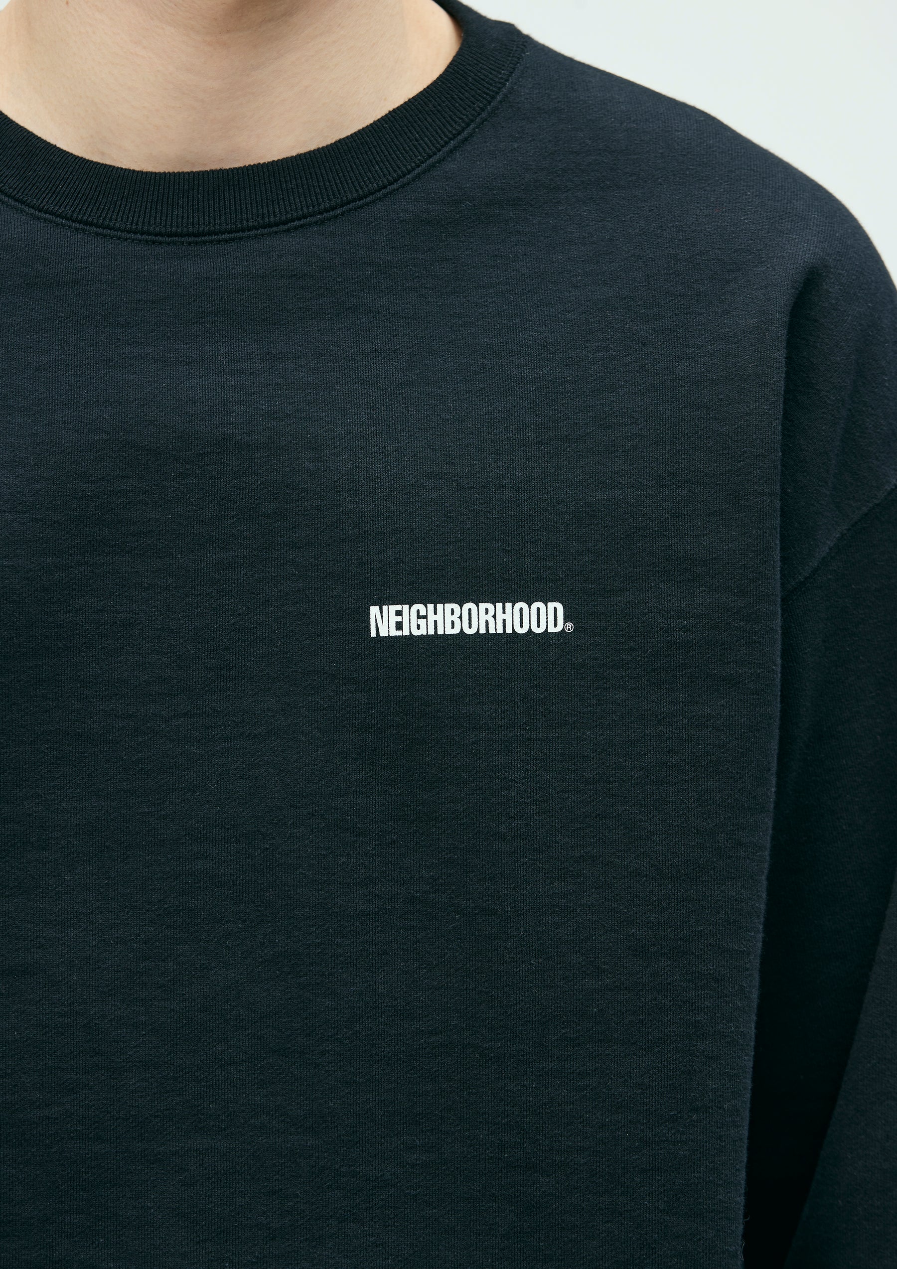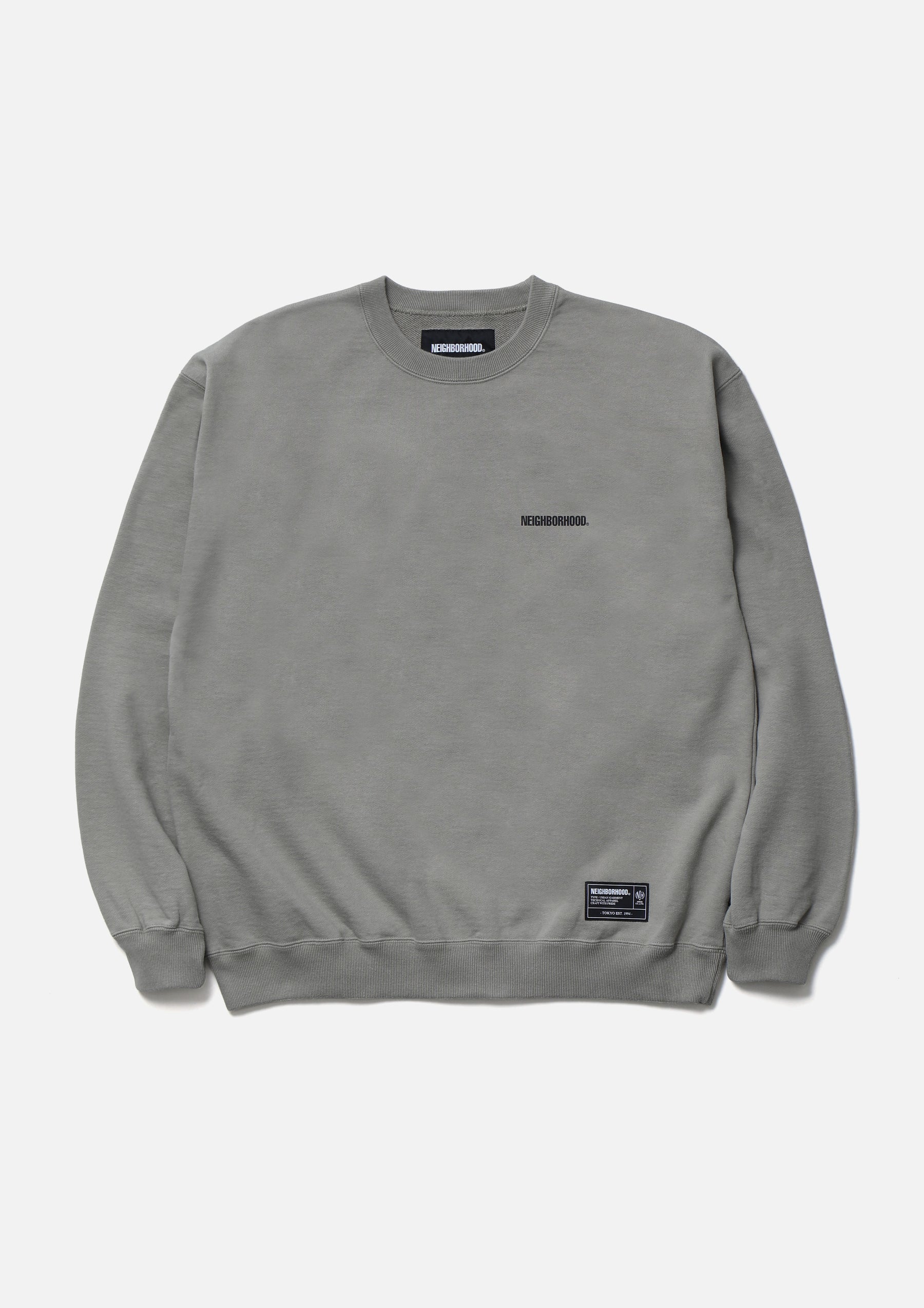 Crewneck pullover made from medium-weight cotton fleece fabric. Features printed logos on the left chest and back. A brand tag is placed at the left hem, and a woven side label is attached at the side seam. Completed with a one-wash finish.
