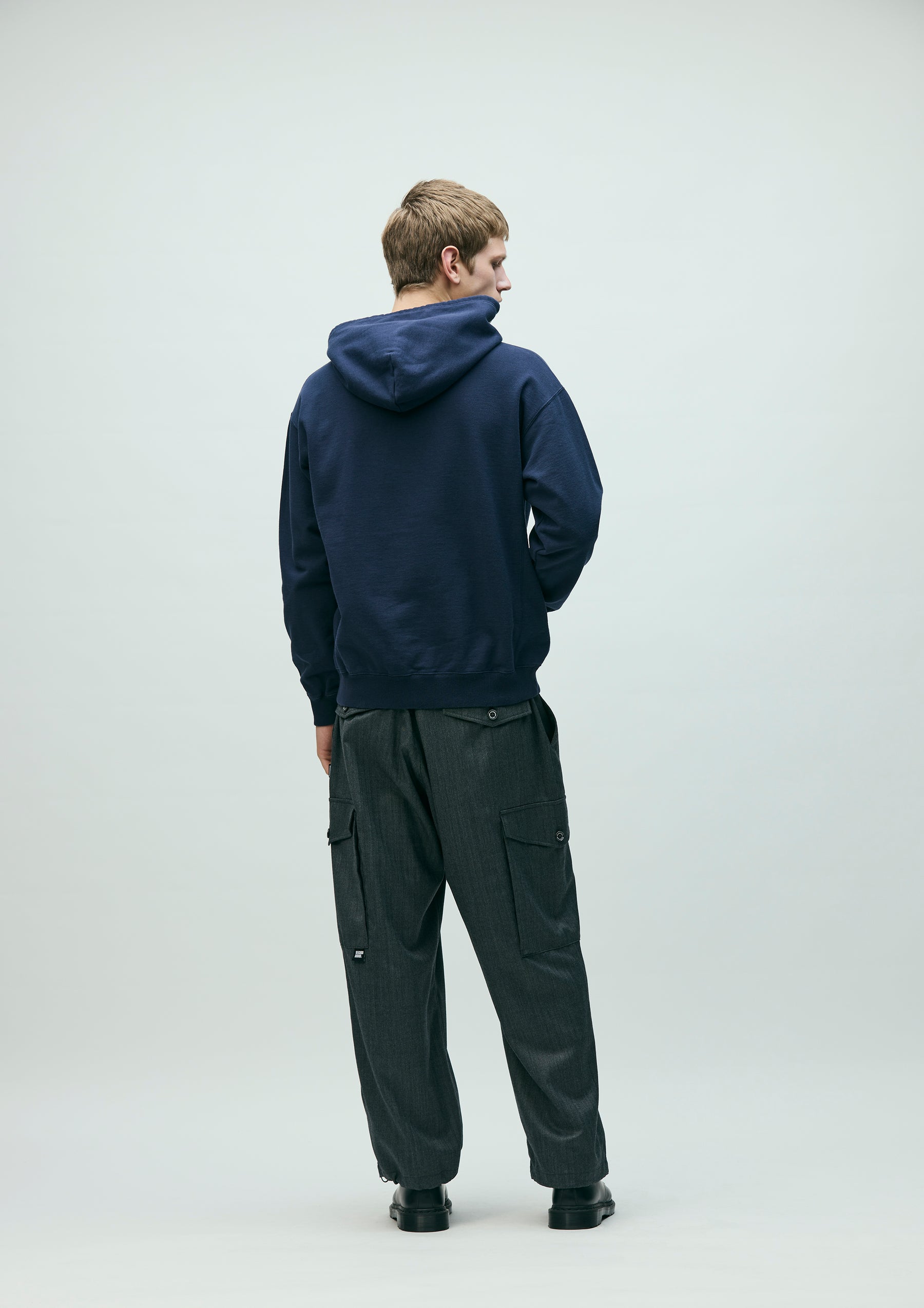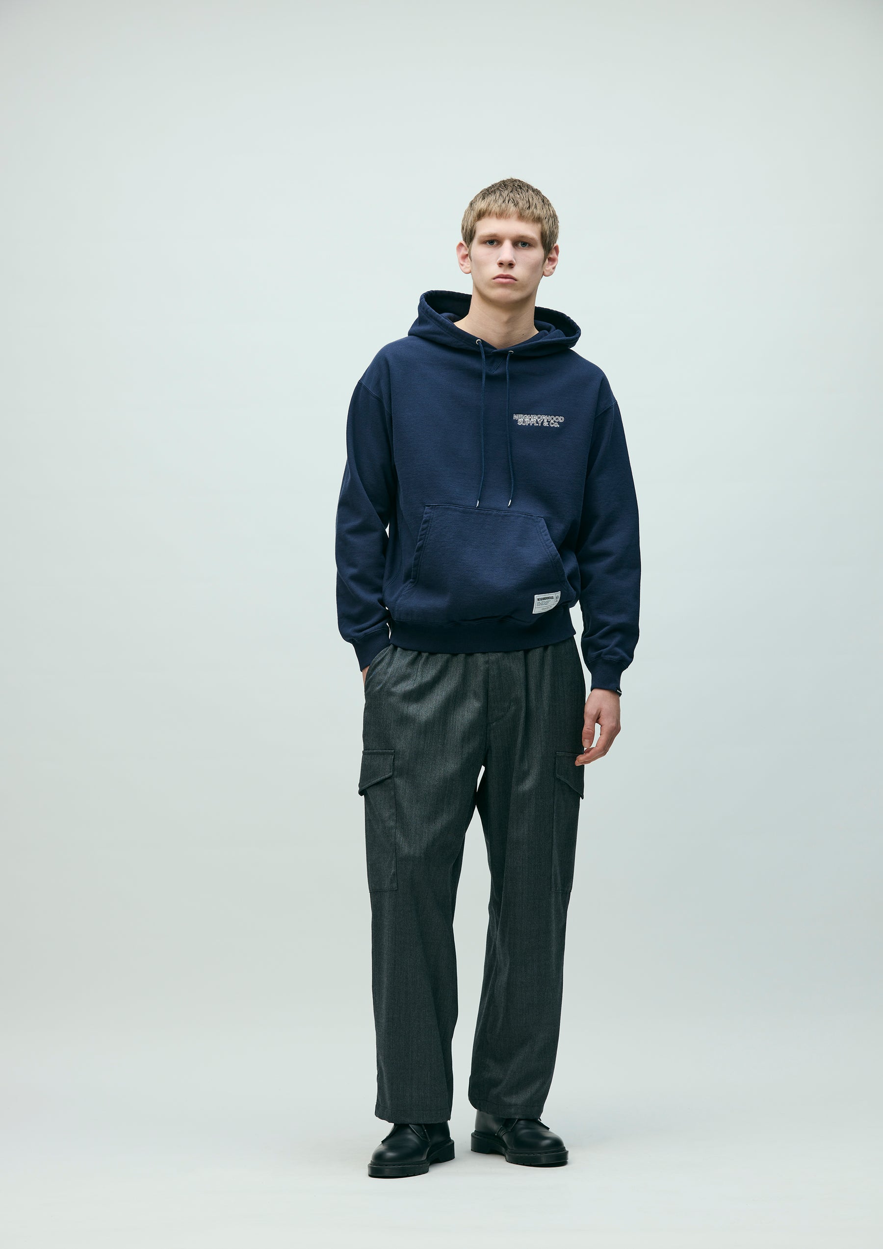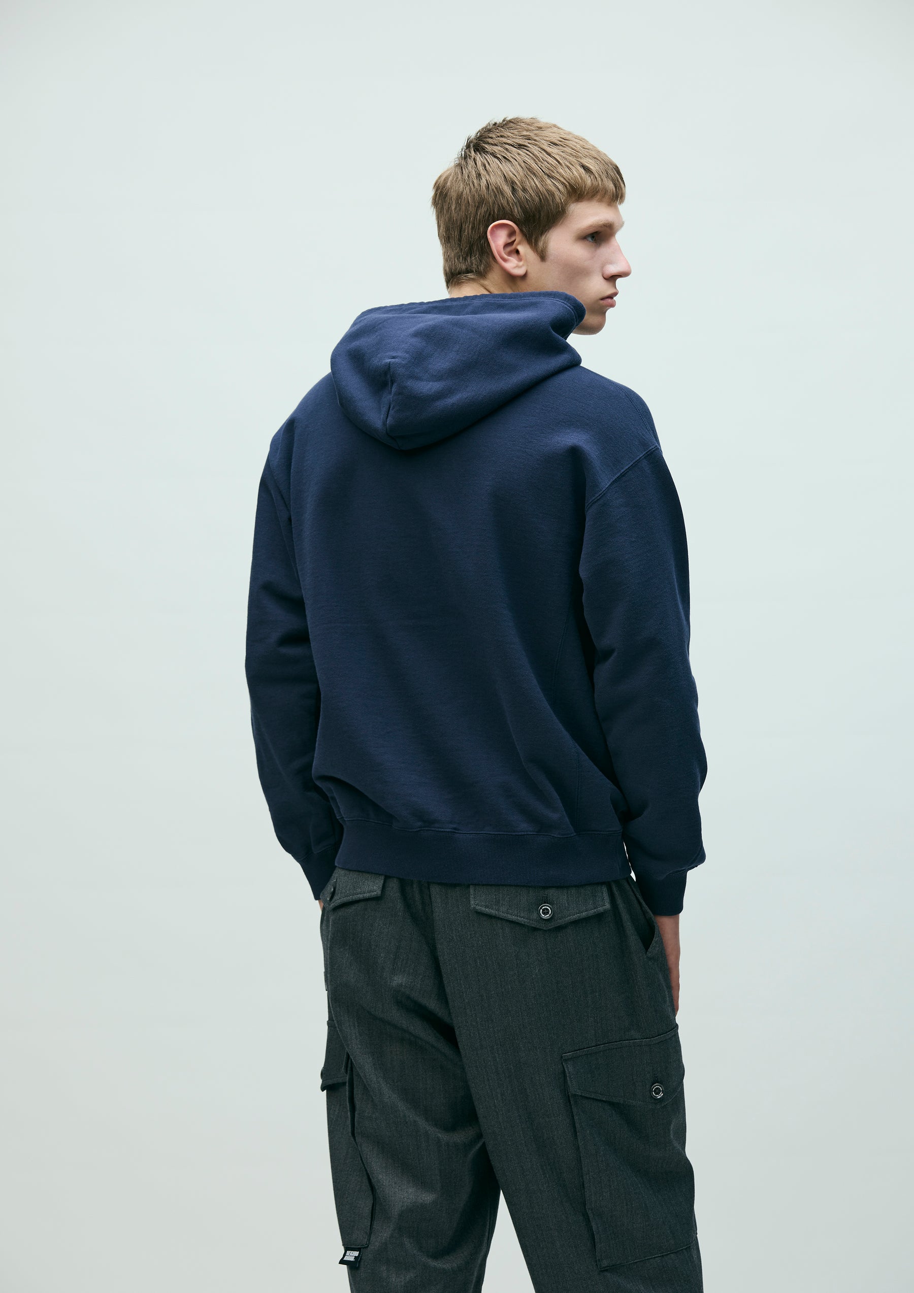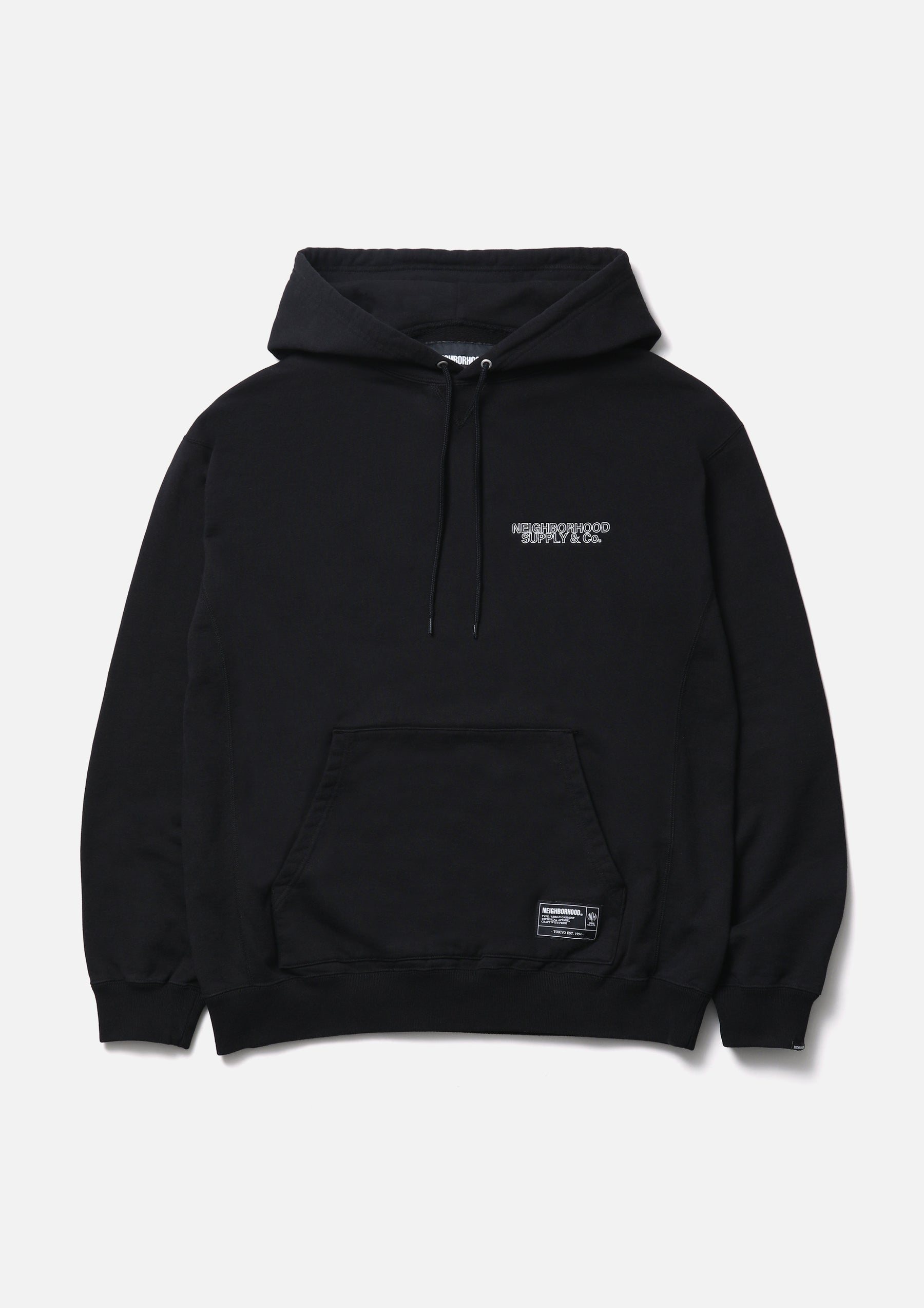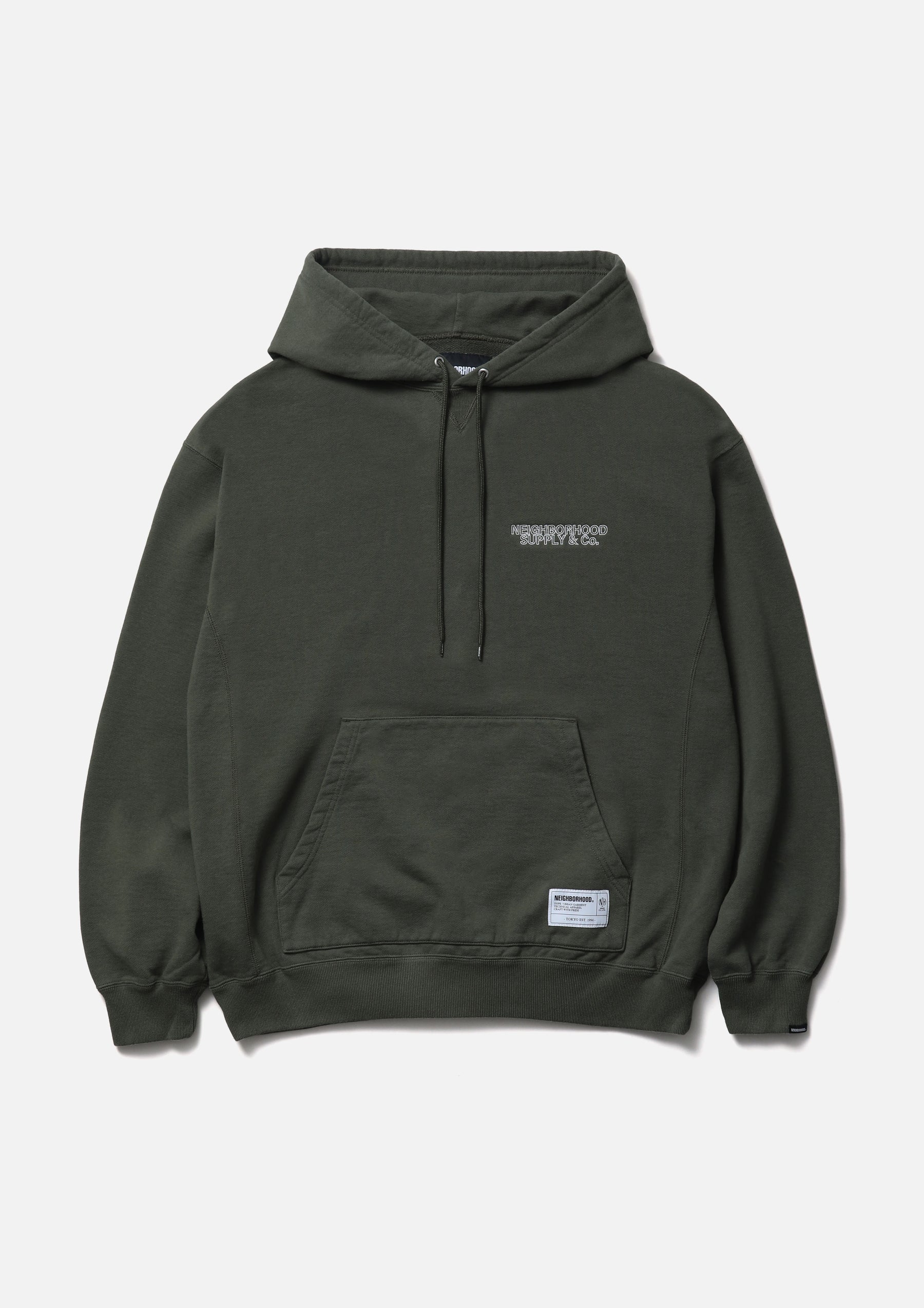 Pullover hoodie made from fleece fabric spun with organic cotton. Features an embroidered logo on the left chest and an original adjustable drawcord at the hood. A brand tag is placed at the left hem, and a woven side label is attached at the cuff. Completed with a one-wash finish.