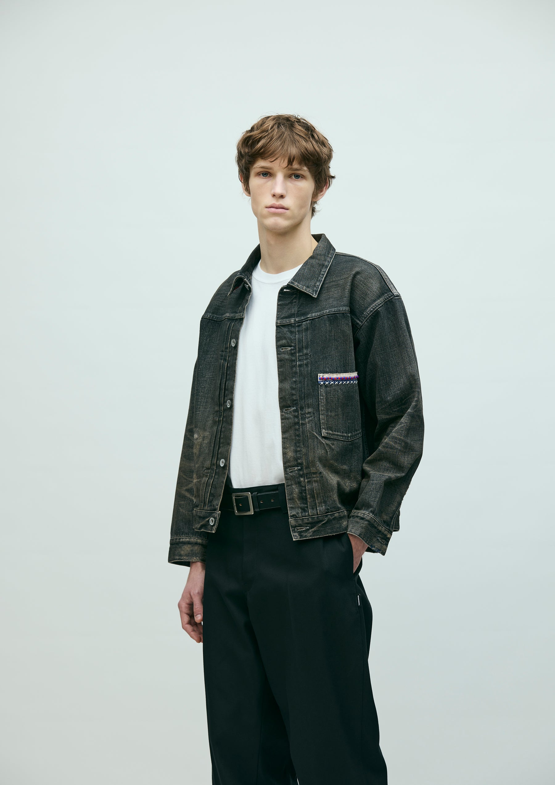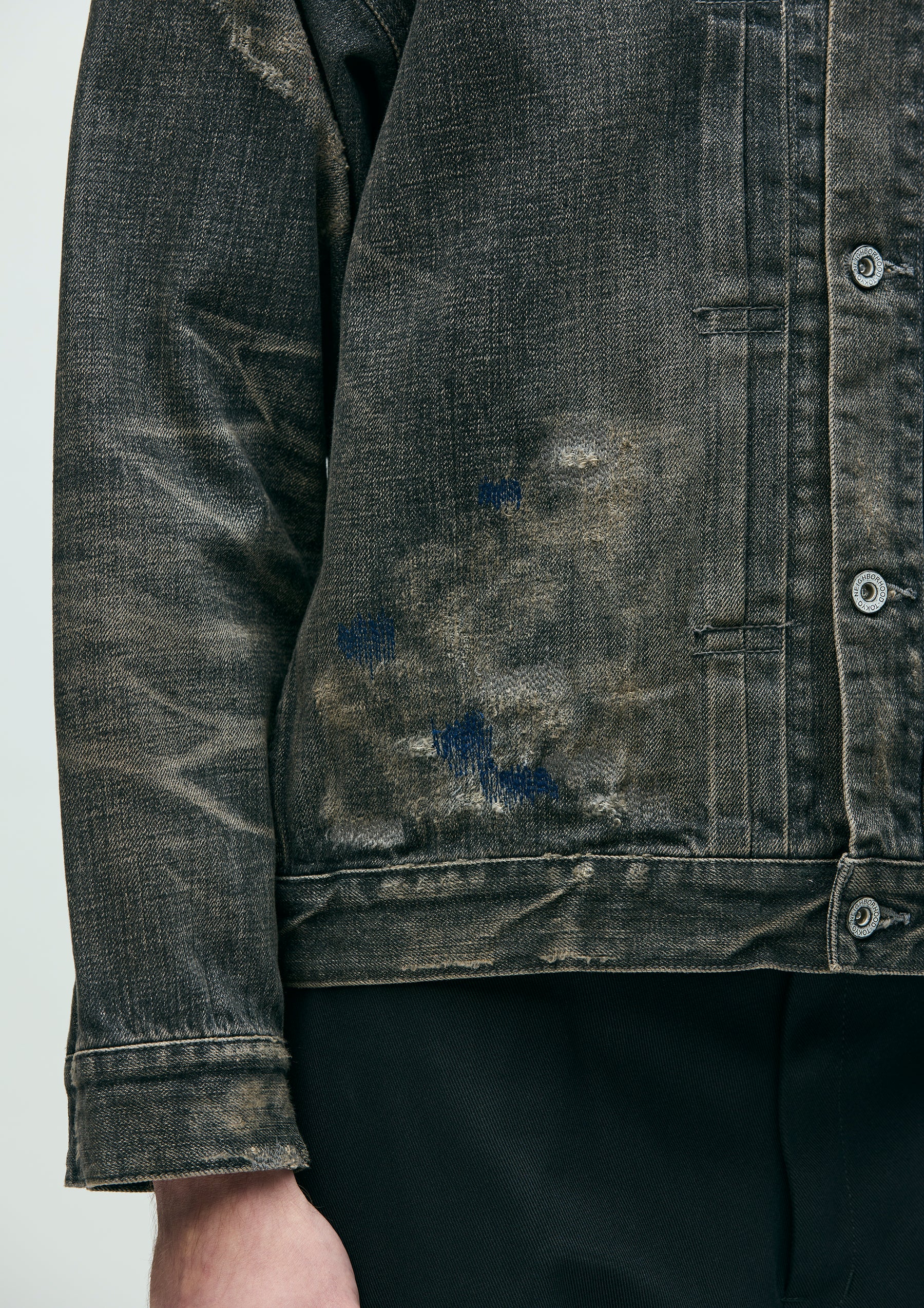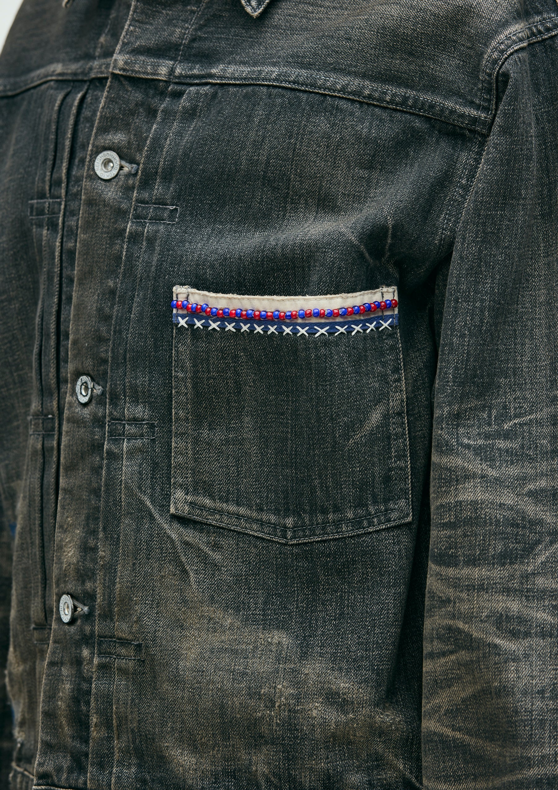 1st-type savage denim jacket made from original 12oz denim fabric, finished with a savage treatment. Characterized by realistic aging through damage processing, repair detailing, and heavy fading to express fabric degradation. Features decorative details such as White Hearts beads and hand embroidery on the chest pocket opening, along with contrast piping tape. Finished with original tack buttons and rivets. Equipped with a size label exclusive to the Custom Crafted line, and a woven side label at the side seam.