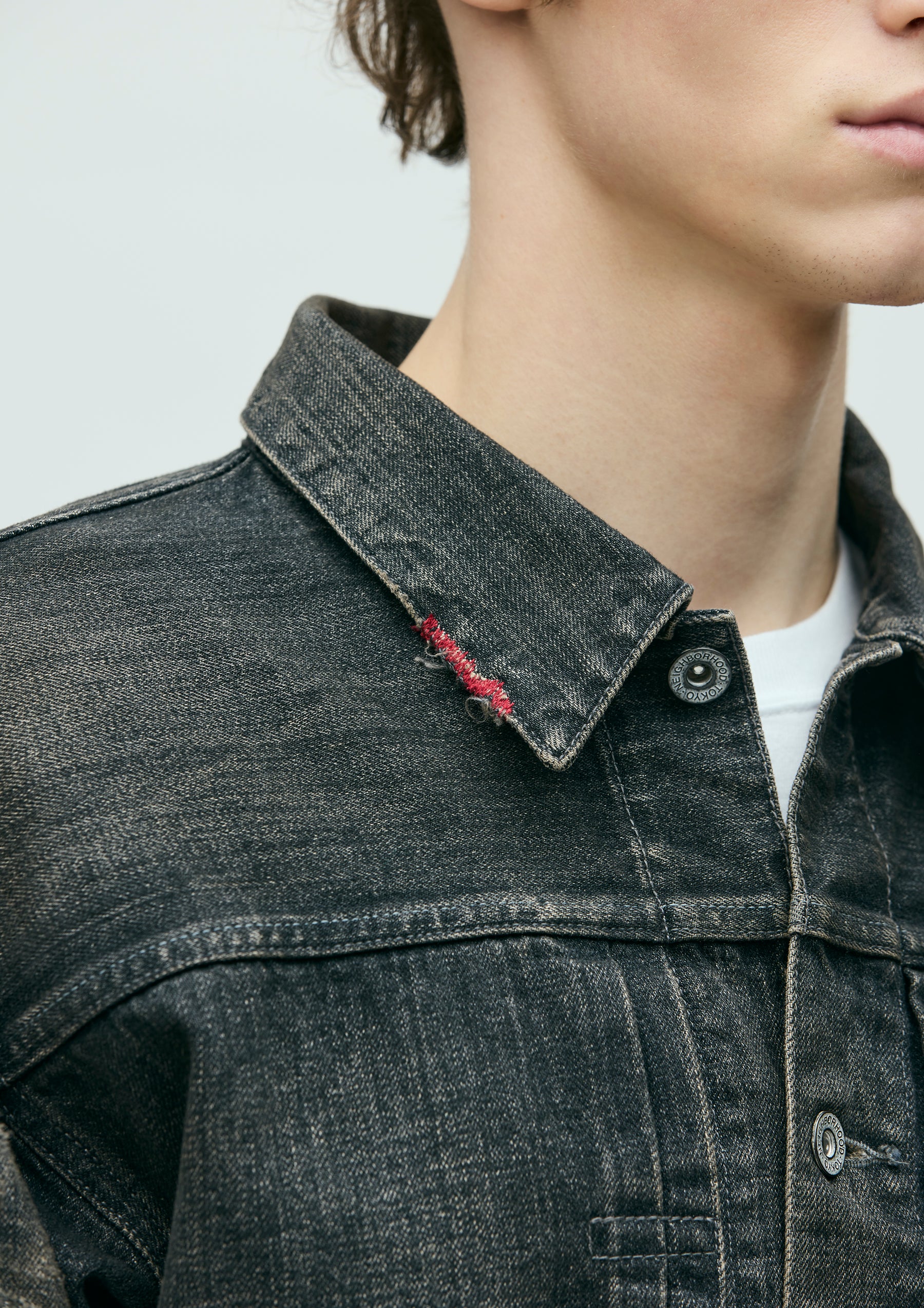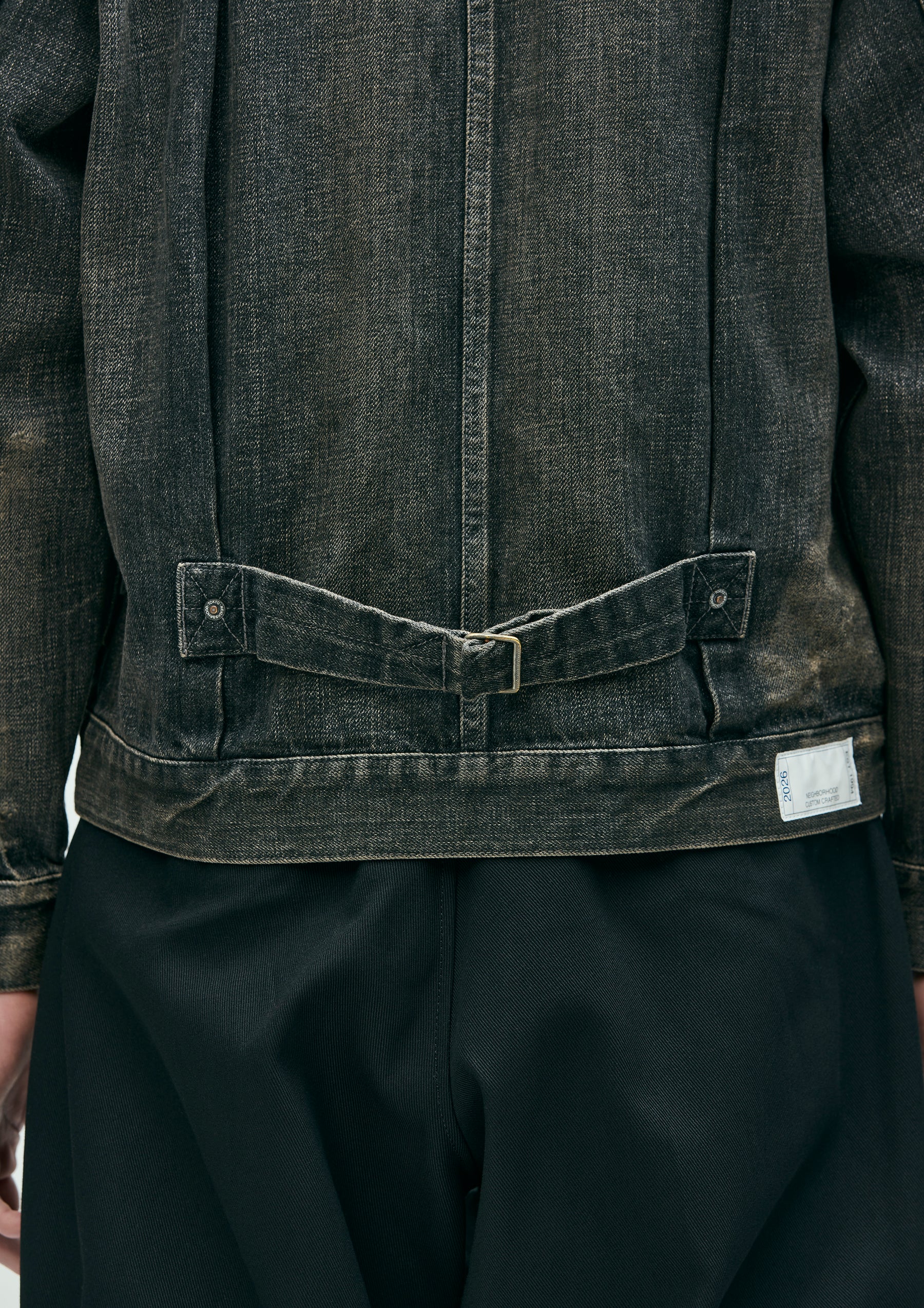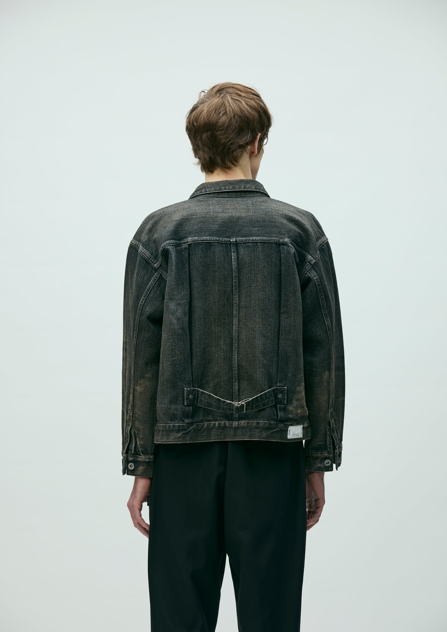 1st-type savage denim jacket made from original 12oz denim fabric, finished with a savage treatment. Characterized by realistic aging through damage processing, repair detailing, and heavy fading to express fabric degradation. Features decorative details such as White Hearts beads and hand embroidery on the chest pocket opening, along with contrast piping tape. Finished with original tack buttons and rivets. Equipped with a size label exclusive to the Custom Crafted line, and a woven side label at the side seam.