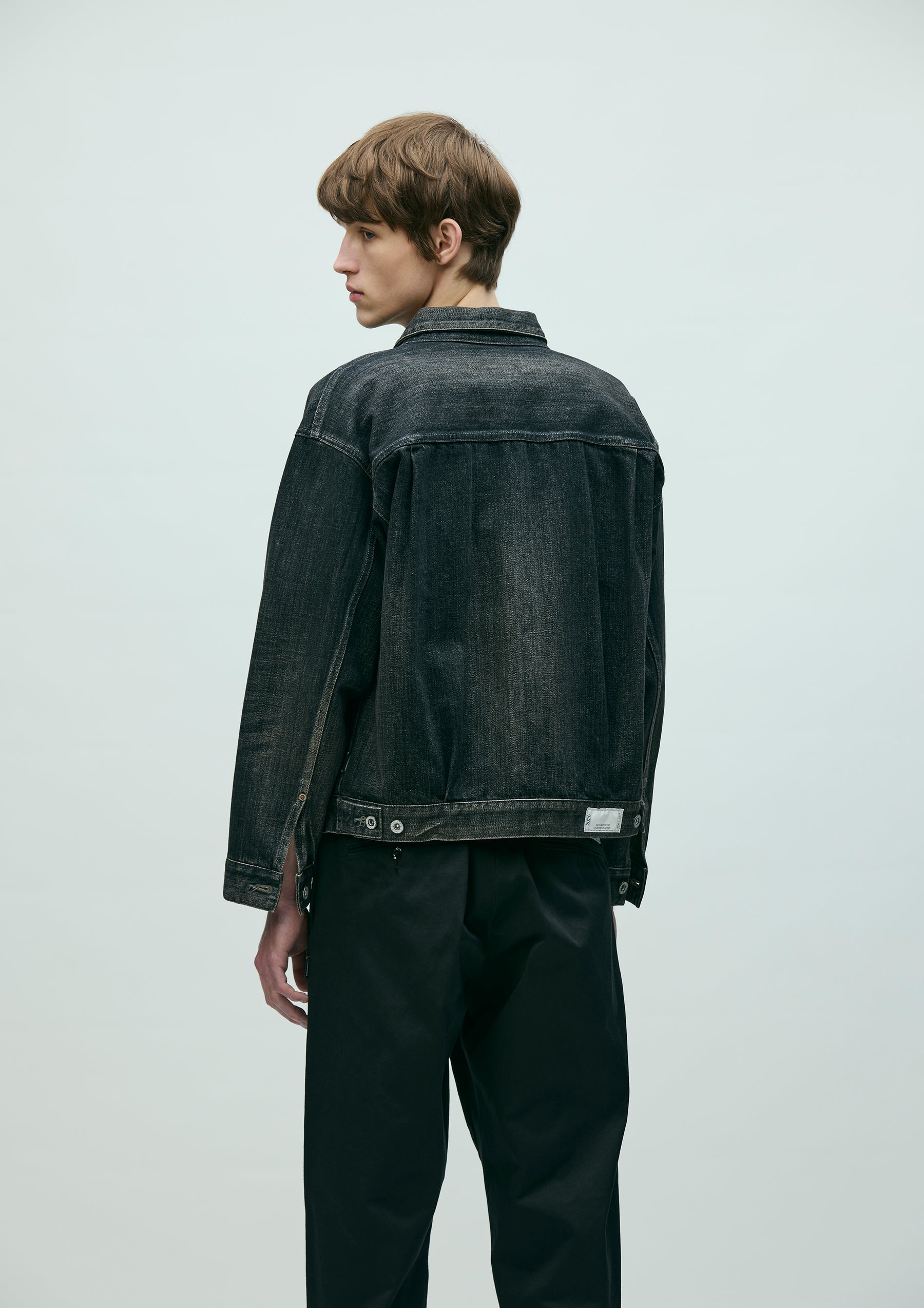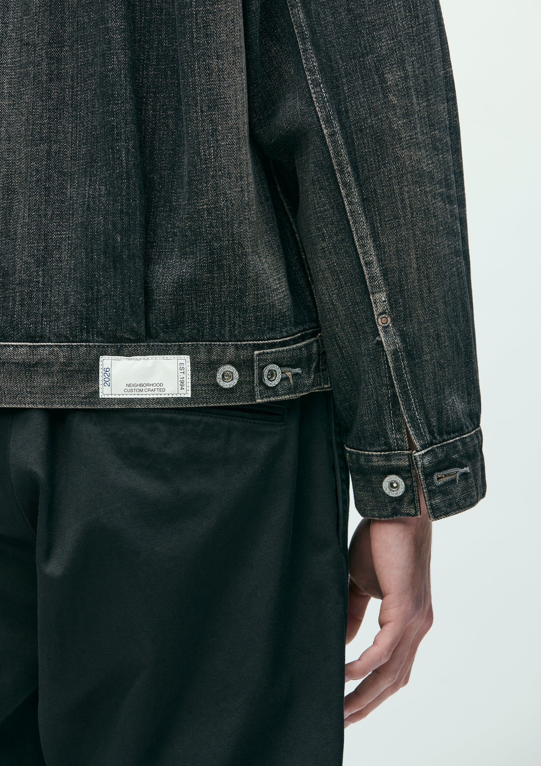 2nd-type denim jacket made from original 12oz denim fabric with a washed finish. Realistic aging is reproduced through a combination of treatments including natural fading and distressing. Features contrast stitching throughout. Finished with original tack buttons and rivets. Equipped with a size label exclusive to the Custom Crafted line, and a woven side label at the side seam.