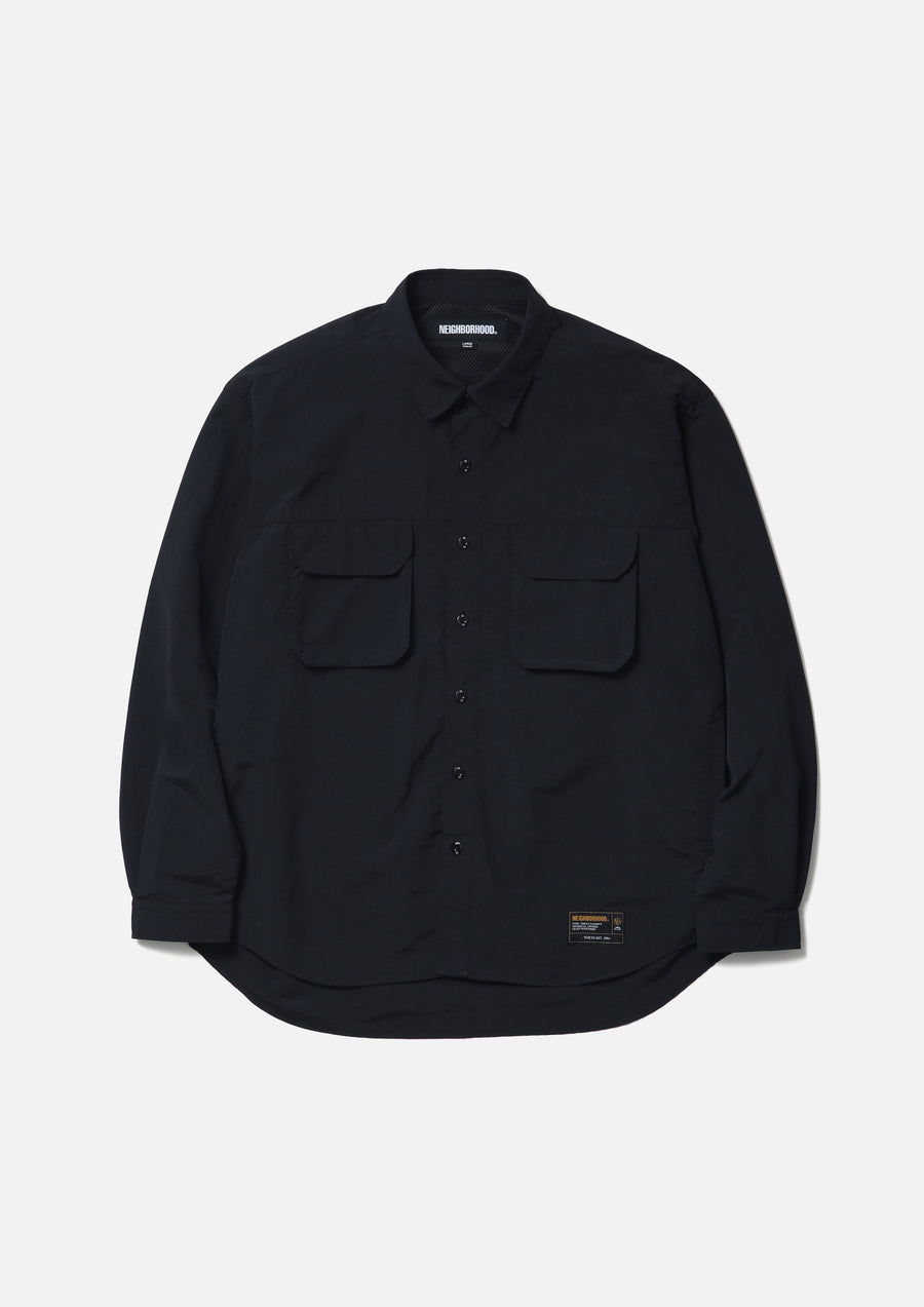 A fishing shirt made from nylon taffeta fabric using INVISTA’s SUPPLEX®, offering a soft, cotton-like texture. Lightweight yet highly durable with excellent quick-drying properties. Equipped with hand pockets utilizing side details and a mesh ventilation panel on the back for breathability. Graphic print on the back. Features original four-hole buttons, a brand tag on the left hem and side seam.