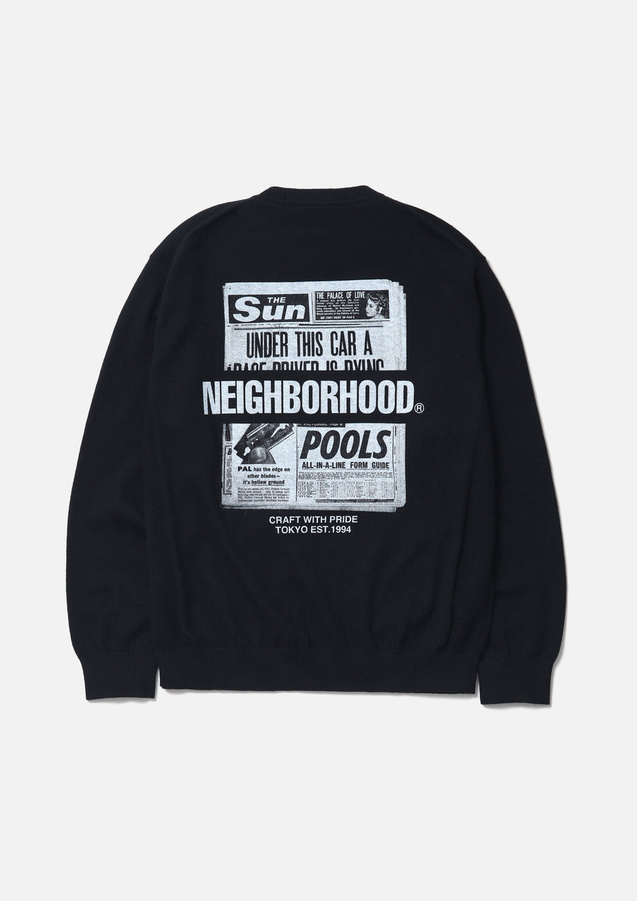 A collaborative item with out stand IN, a brand led by art director Tetsuya Nagato and designer/creative director Kazuki Kuraishi. A crewneck knit sweater crafted using a 12-gauge knitting machine with a seamless linking construction. Inspired by vintage sweatshirts, the side panels feature half-cardigan ribbing for enhanced lateral stretch. Designed to incorporate as many fashion marks (reductions) as possible, utilizing the natural drop of the shoulder in knitwear. Graphic print on the front, with a logo patch on the left sleeve.