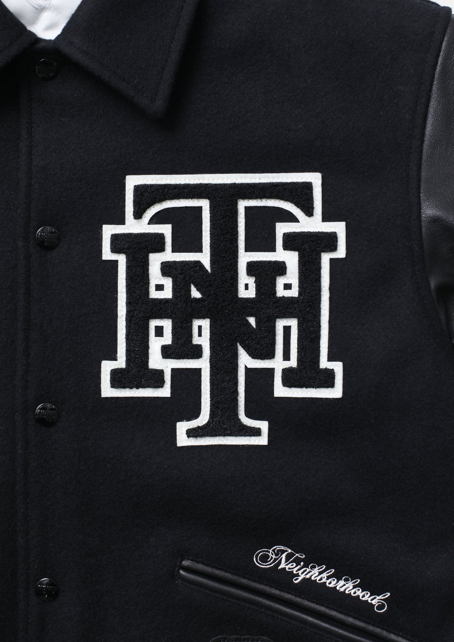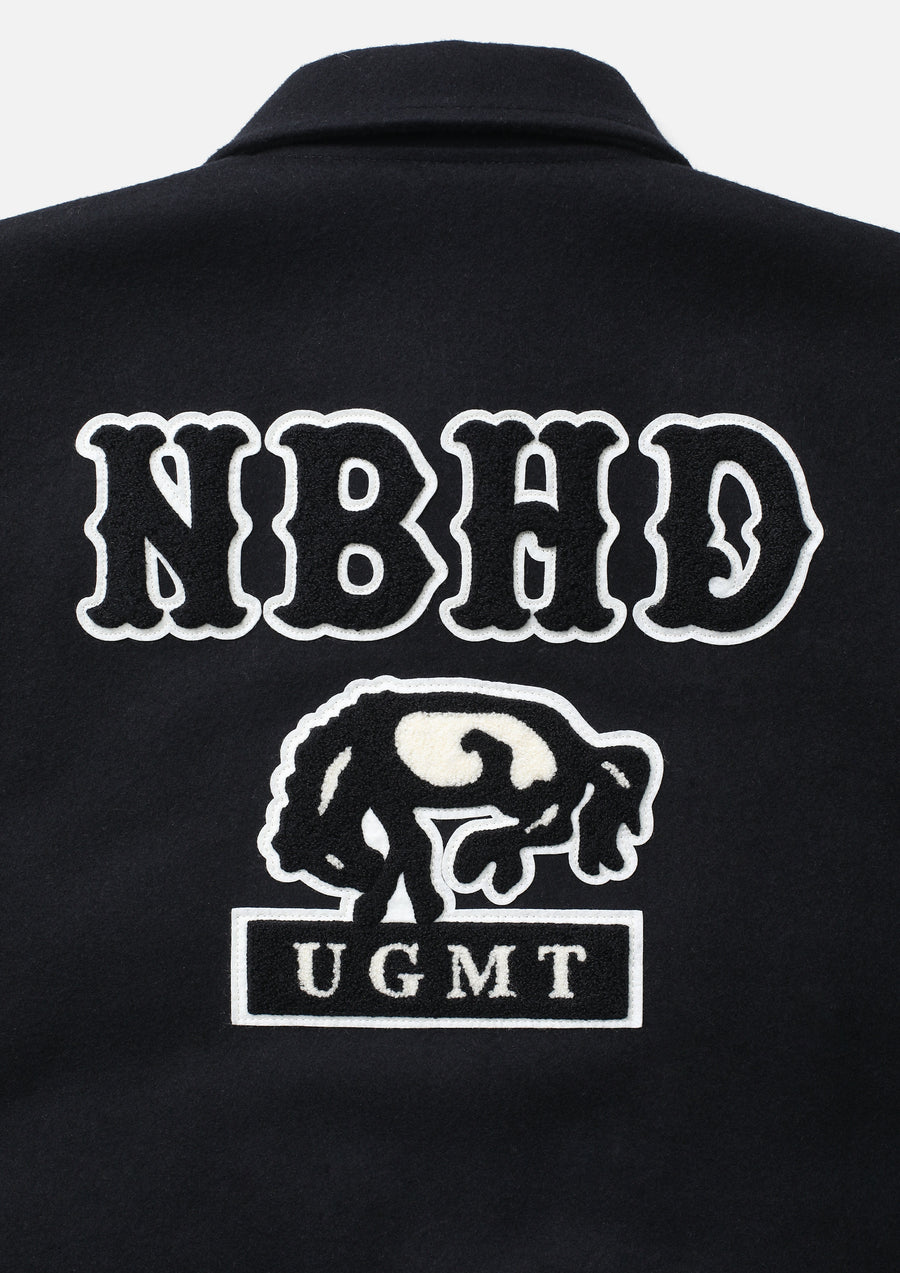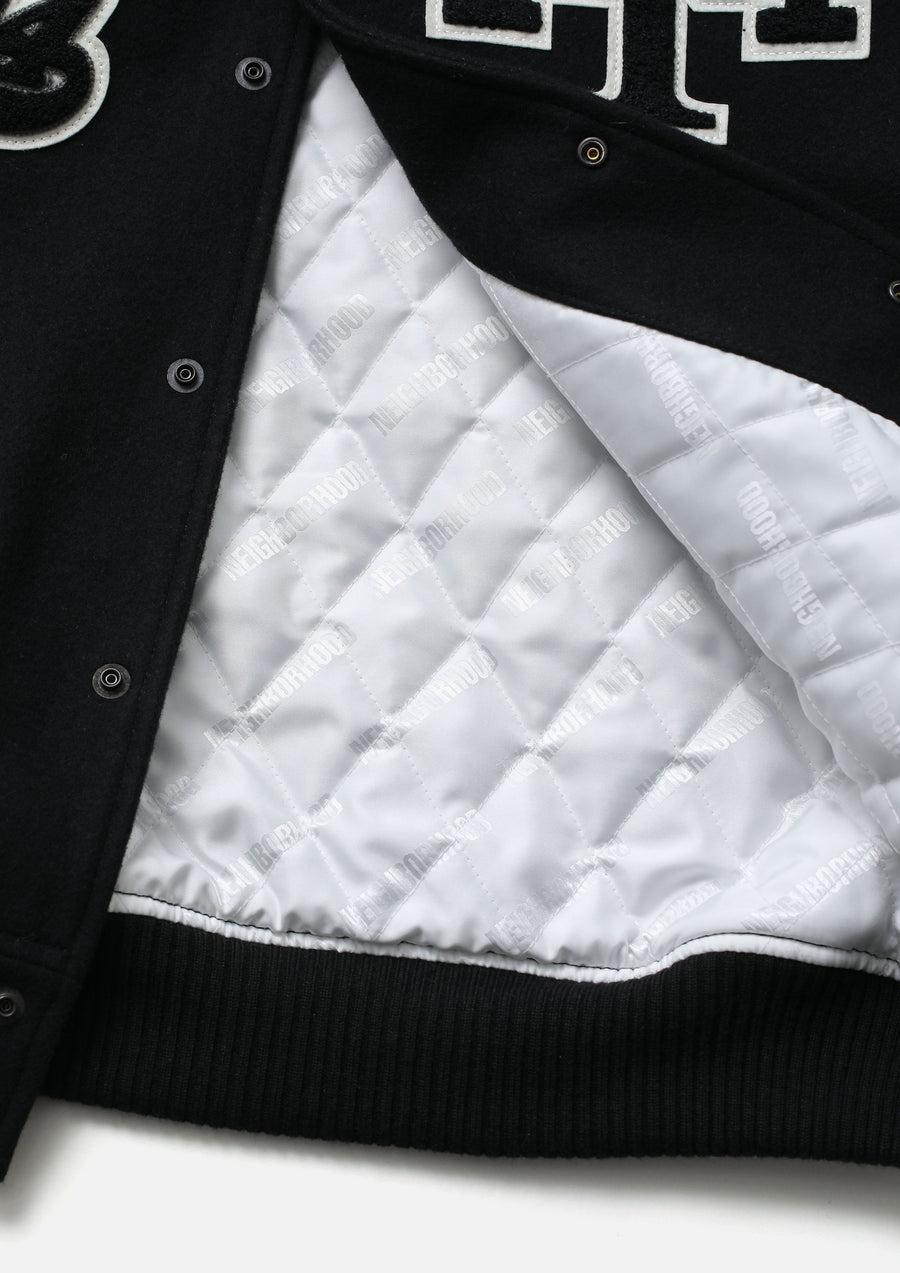 A stadium jacket featuring a heavy Melton wool body paired with cow leather sleeves. Logos and motifs are expressed through embroidered details and patches throughout. Finished with original snap buttons, clip tag at the side seam and a diamond-quilted lining made from custom jacquard fabric. Limited-edition piece, with individual numbering embroidered above both welt pockets.