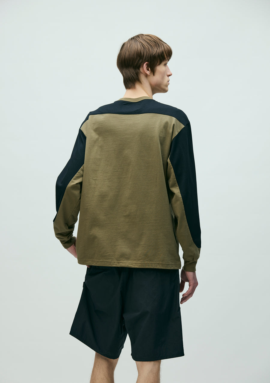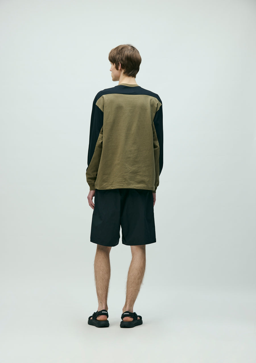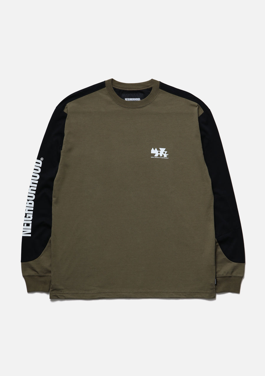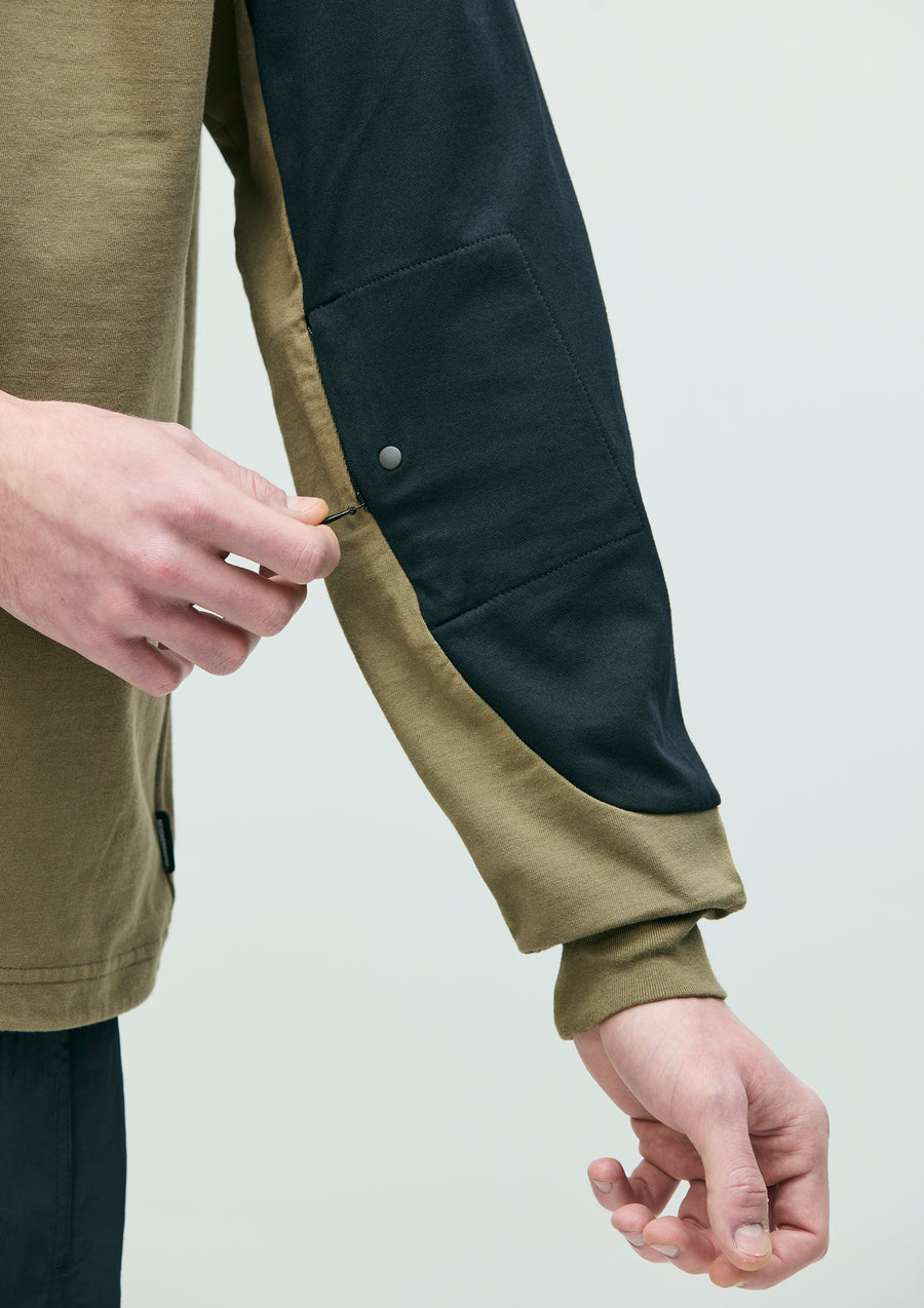 MAP Crewneck cut-and-sew top made from CORDURA® jersey fabric. Features a zip pocket on the left sleeve integrated into the panel design and an adjustable elastic drawcord at the hem. Logos are printed on the left chest and sleeve. A brand tag is placed at the left hem, and a woven side label is attached at the side seam.