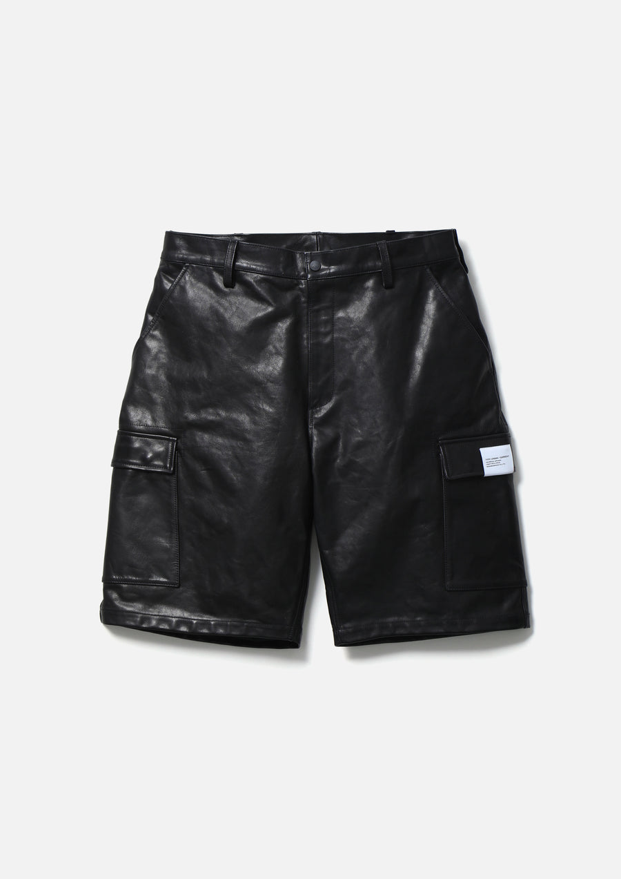 Cargo shorts crafted from cowhide leather. Finished with original snap buttons, zipper pulls, and signature tape. A brand tag is placed on the cargo pocket, with a woven side label attached next to the cargo pocket. Lined with antistatic polyester taffeta. Cut in a relaxed silhouette.