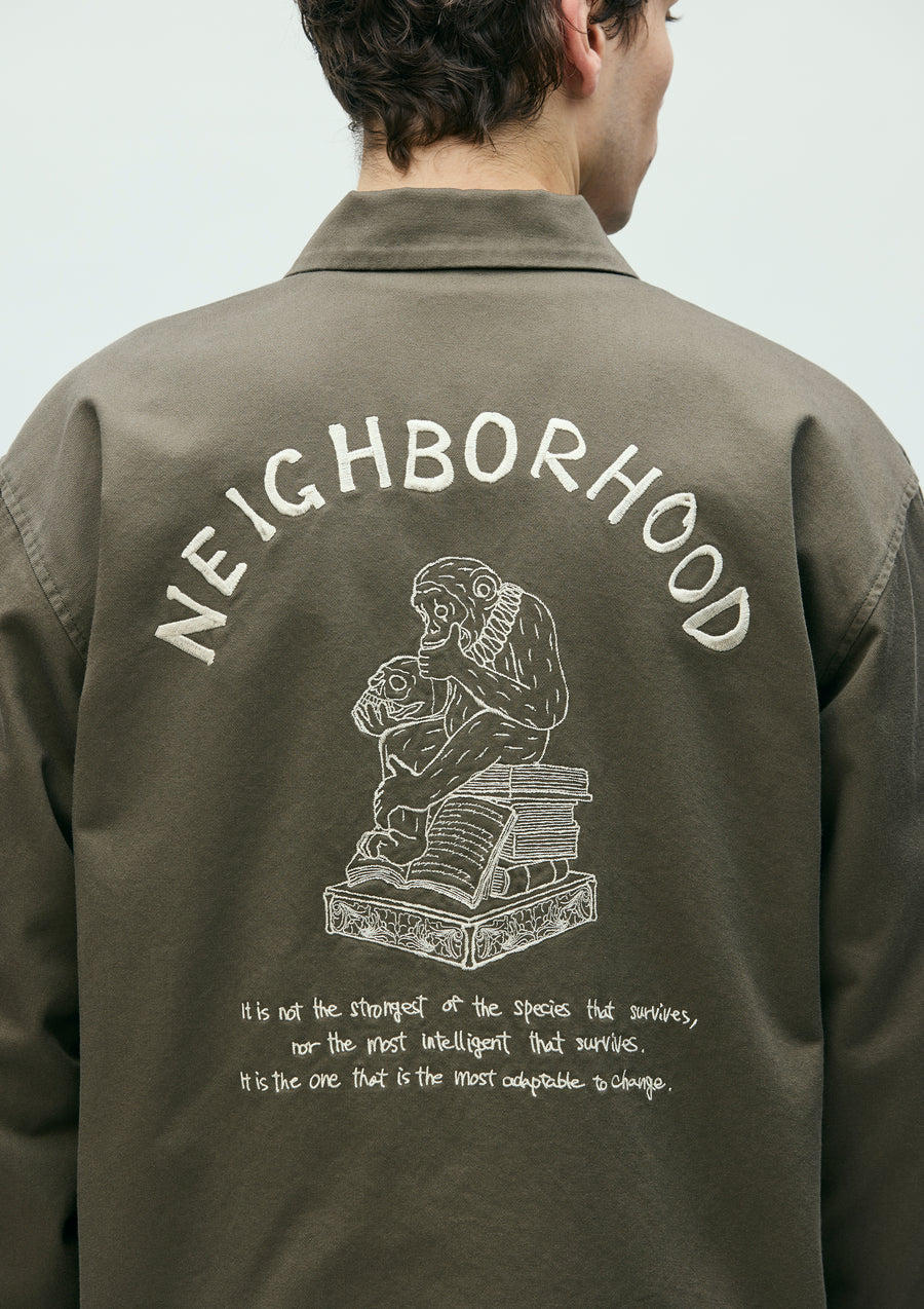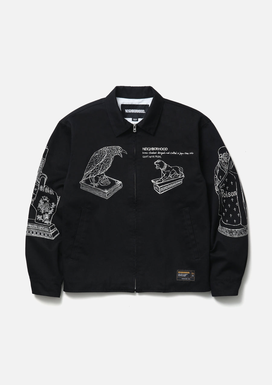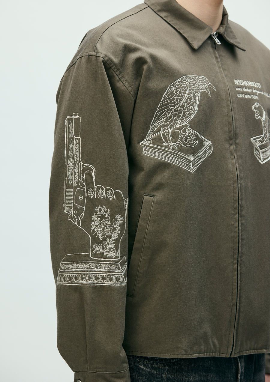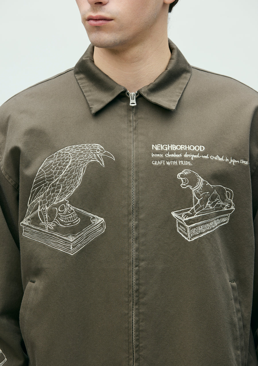 Souvenir jacket made from medium-weight chino cloth fabric. Features storm cuffs and embroidery of incense chamber motifs on the body and sleeves. Finished with original snap buttons. A woven side label is attached at the side seam.