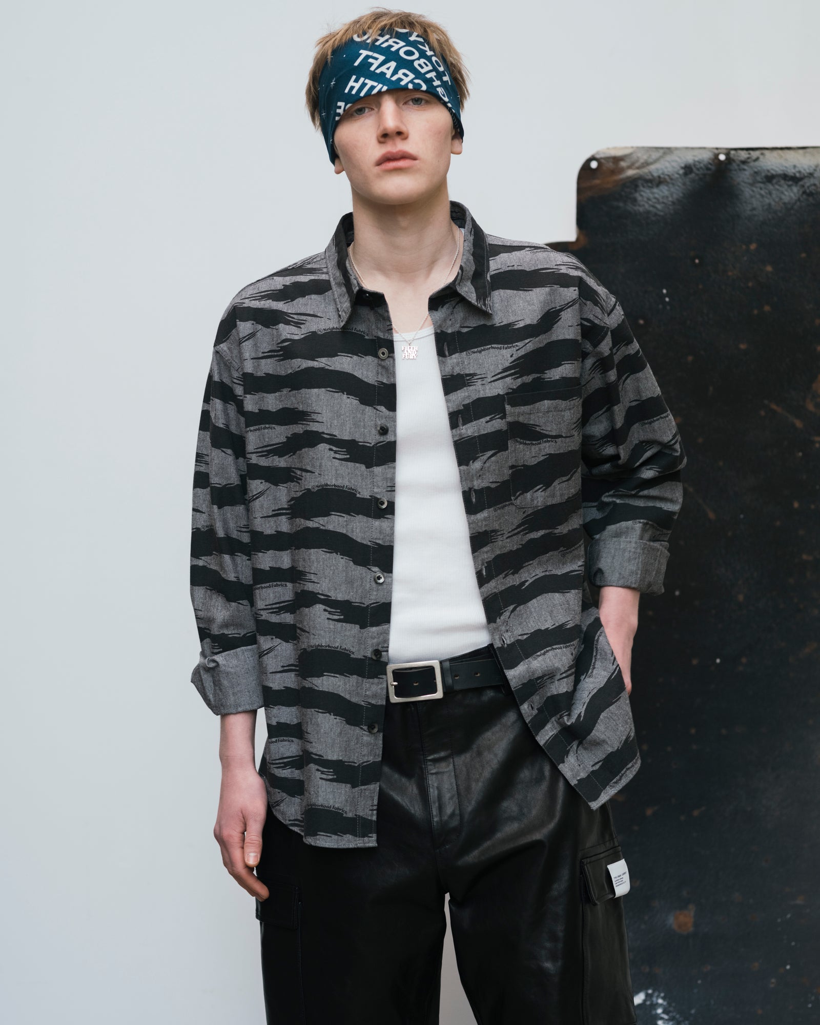 CAMO PATTERN CHAMBRAY SHIRT LS LEATHER CARGO SHORT PANTS LEATHER BELT