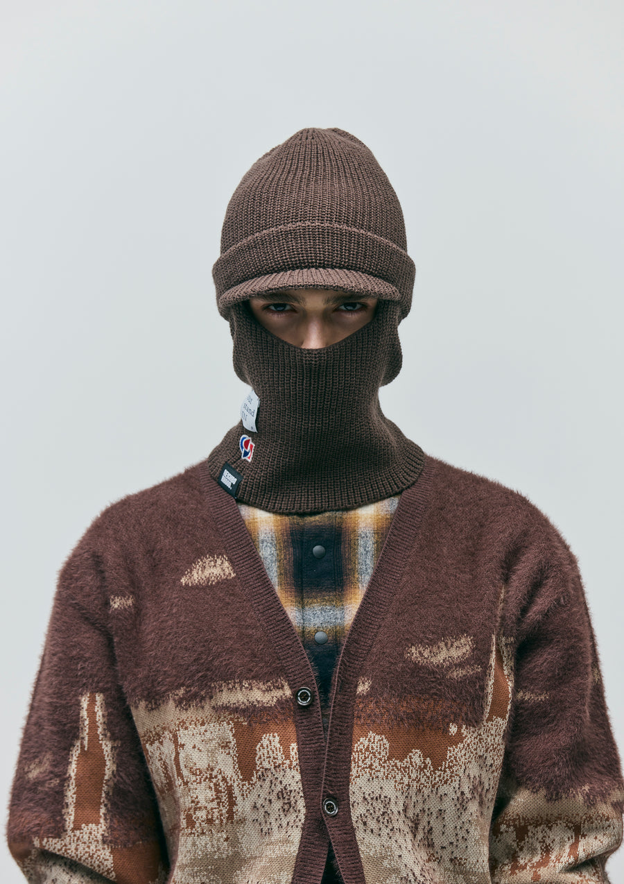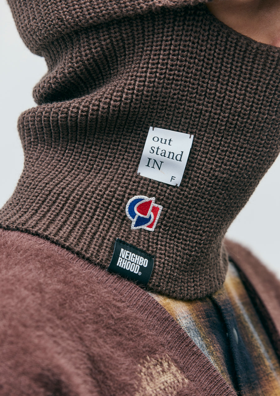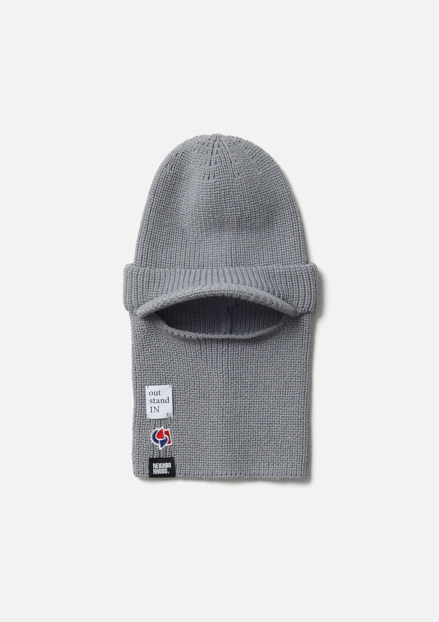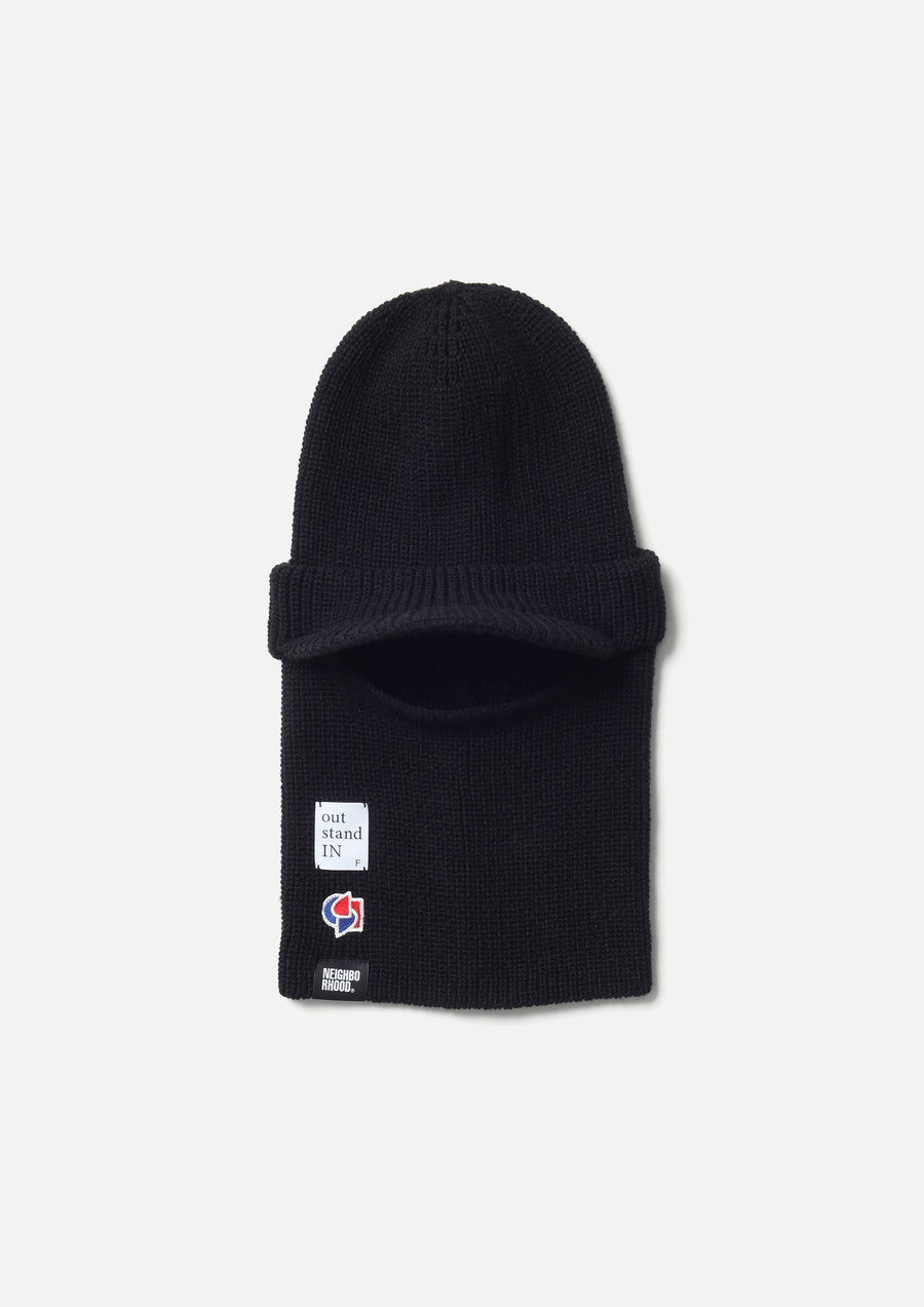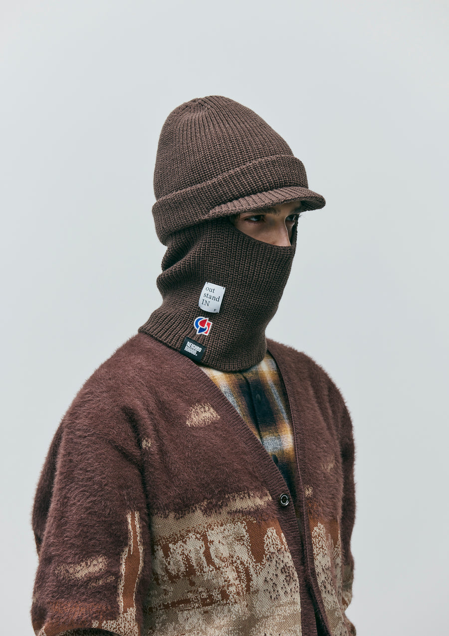 アートディレクター永戸鉄也と、デザイナー/クリエイティブディレクター倉石一樹が手掛けるブランド、out stand INとのジョイントワークアイテム。マスク部分を収納することで、ニットキャップとしても使用可能なつば付きのバラクラバ。アクリル糸を使用。右裾にロゴパッチを配置。