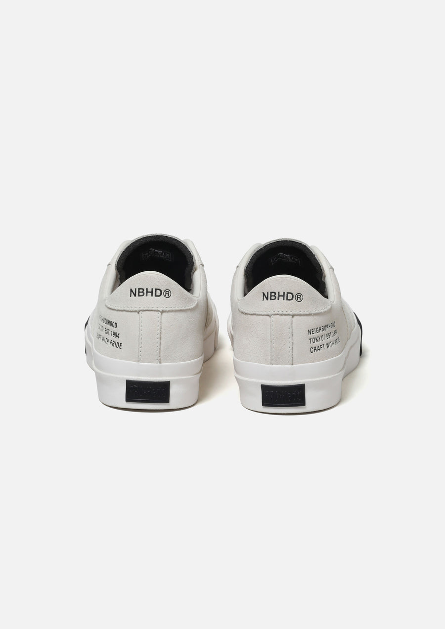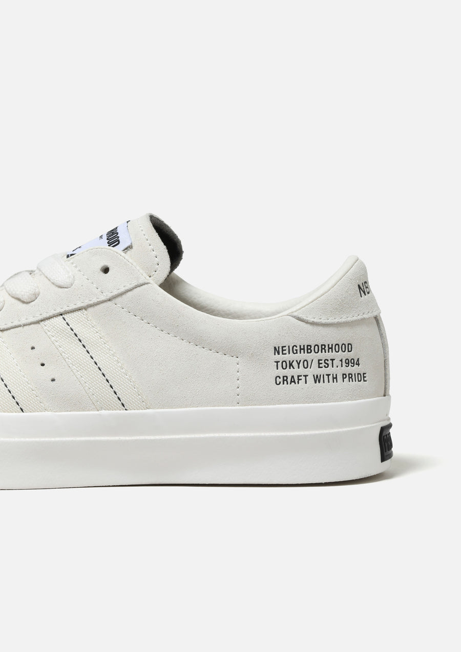 1970~80年代にストリートスタイルのアイコンとして誕生したPRO-Kedsの象徴的なモデル"ROYAL PLUS"のジョイントワークアイテム。"ROYAL PLUS SUEDE LO"モデルをベースに、ソール、パワーストライプ、ヒールパッチはすべて別注色に変更。サイドラインにはドットのウェビングテープ、アウトソールにはVibram Mega Gripを採用。アッパーとヒール、インソールにロゴプリントを施し、シュータンにはダブルネームを配置。ファットシューレースはBLACKとWHITEの2色を付属。