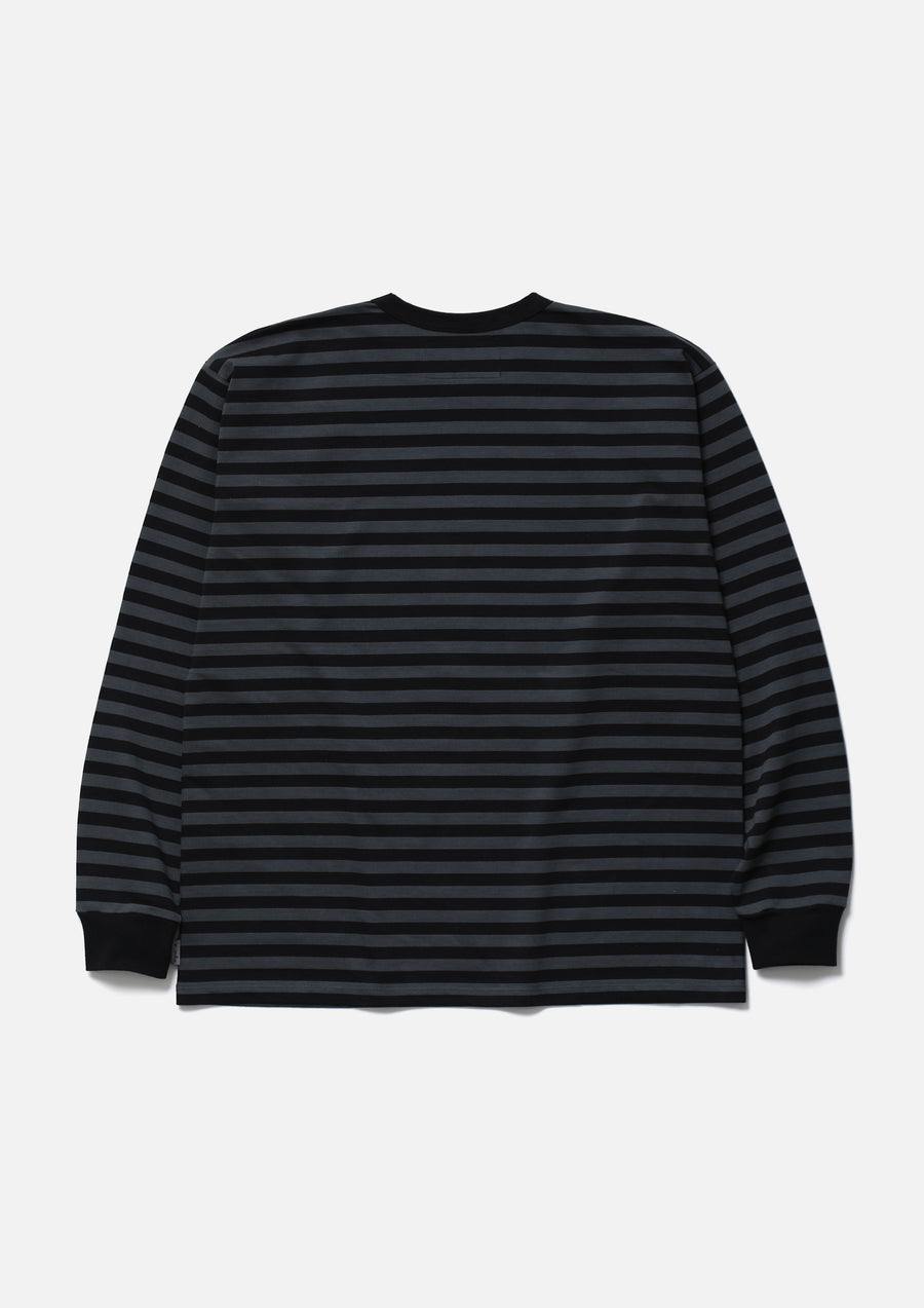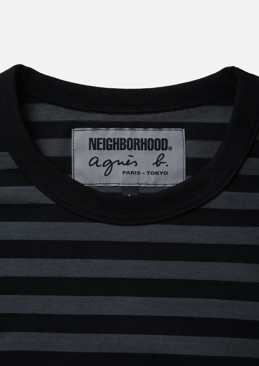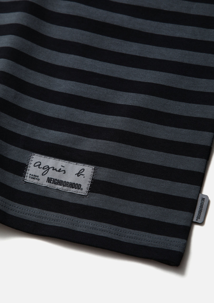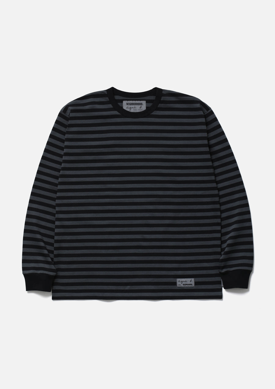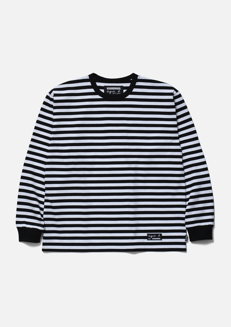 agnès b.オリジナルのナローボーダー生地を使用したボーダーロングスリーブカットソー。左裾にブランドタグ、脇接ぎにピスネームを付属。