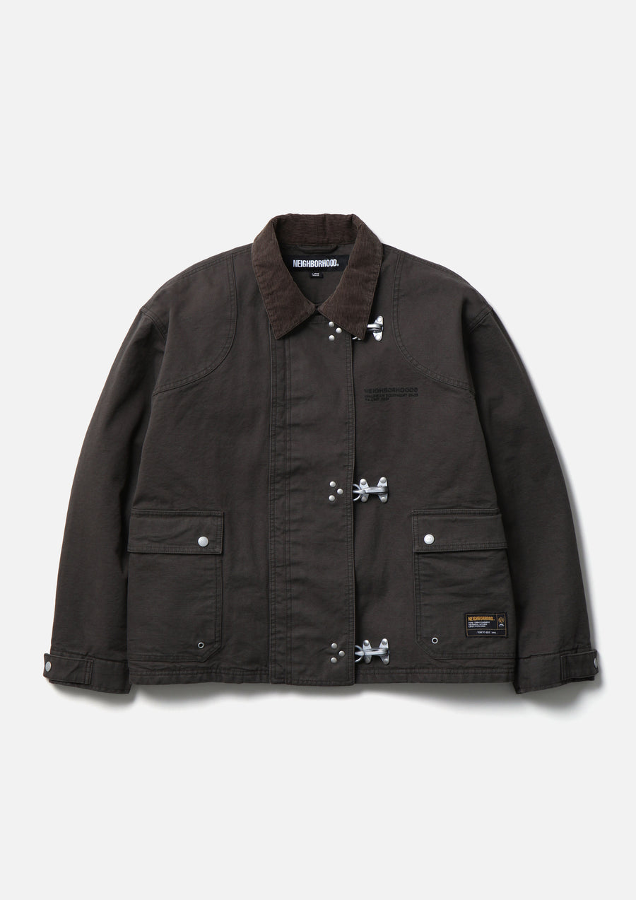 ヴィンテージライクな風合いを持つ中肉のダック生地をベースに、コーデュロイの襟を組み合わせたファイヤーマンジャケット。フロントは、ファイヤーマンバックルとスナップボタンによる開閉。両サイドに水抜き用アイレットを備えたユーティリティポケット、袖口にアジャスト用のスナップボタンを配置。左胸にロゴを刺繍。裏地はキルティング仕様。ポケット部分にネームタグ、サイドシームにピスネームを付属。