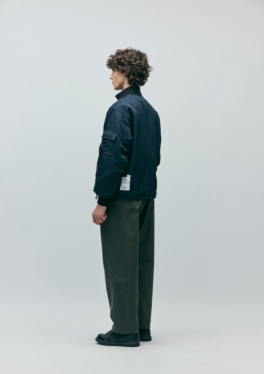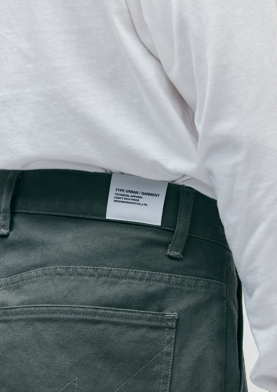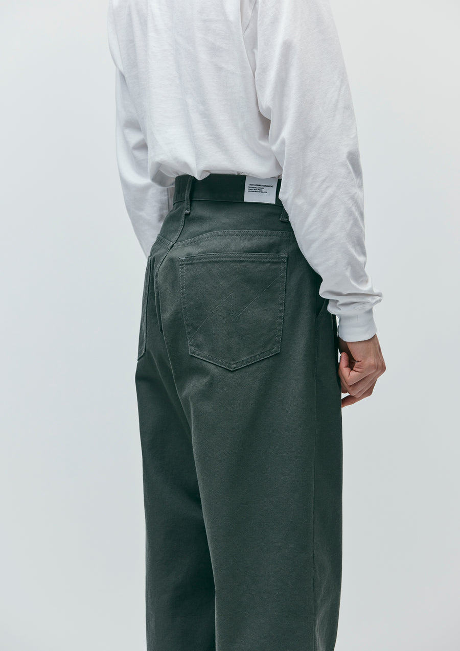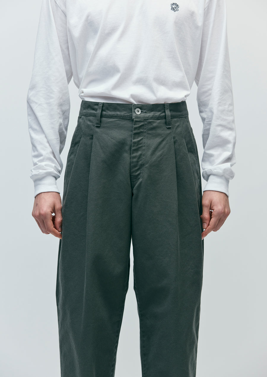 しっかりした肉感の厚手のサージ生地を使用したツータックパンツ。型崩れしにくいノンストレッチ素材を採用。ヒップポケットには"N"型のデザインステッチ施したディテール。オリジナルのタックボタンとフロントファスナー、シグネチャーテープを採用。ウエスト背面にネームタグ、サイドシームにピスネームを付属。ゆとりのあるシルエット。