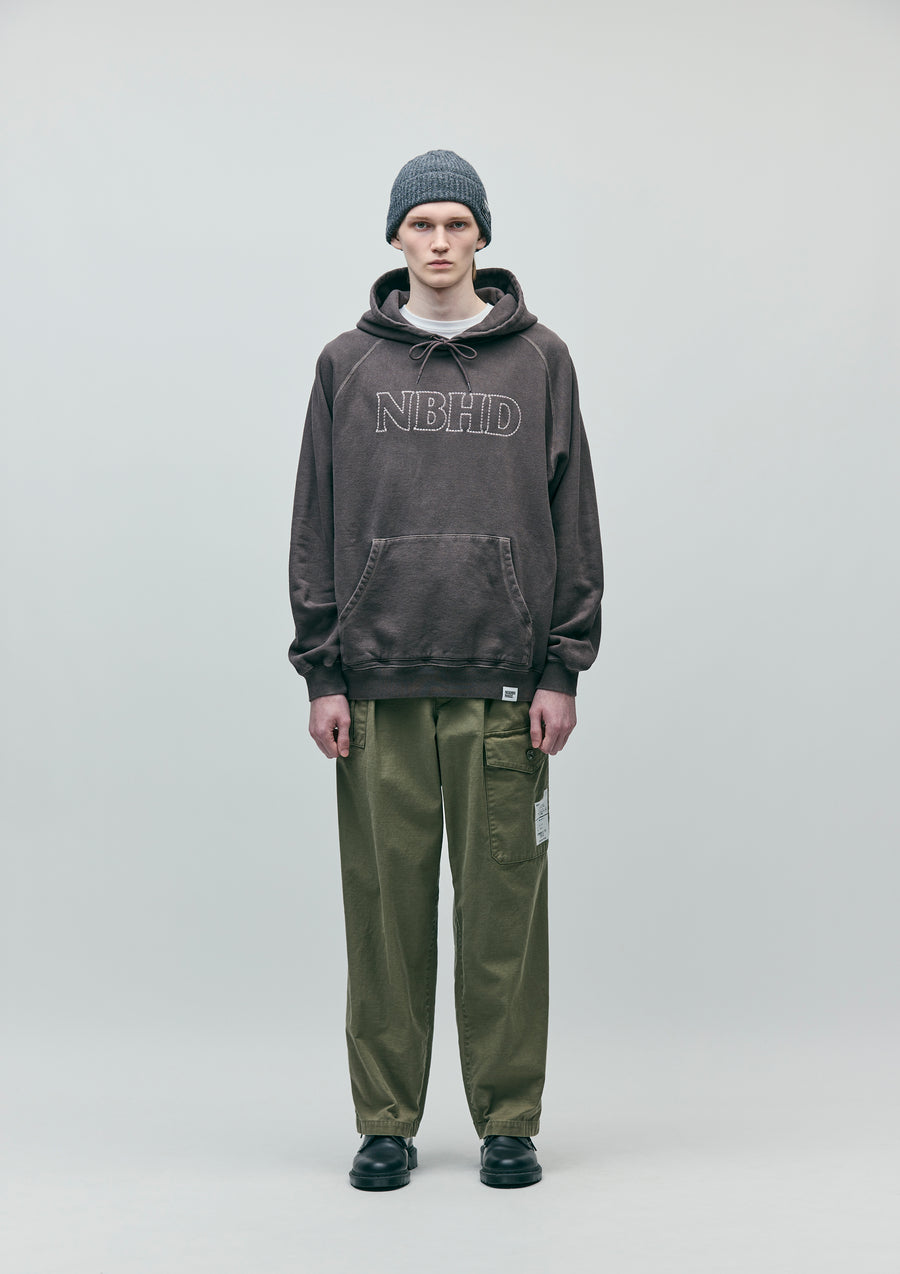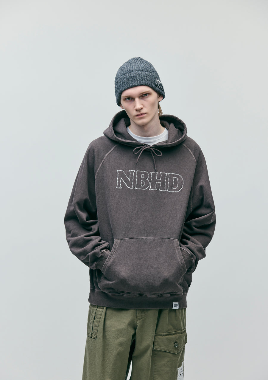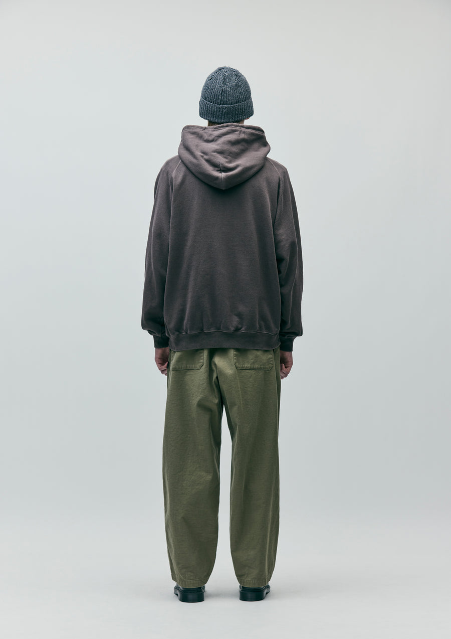 製品の状態でピグメントダイ加工を施した、裏毛素材のプルオーバーフーディ。 ラグランスリーブ仕様。フロントにロゴのボンディングステッチ刺繍を配置。をサイドシームにピスネームを付属。