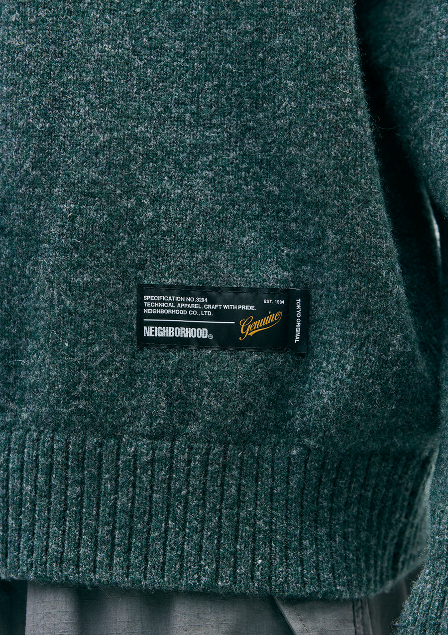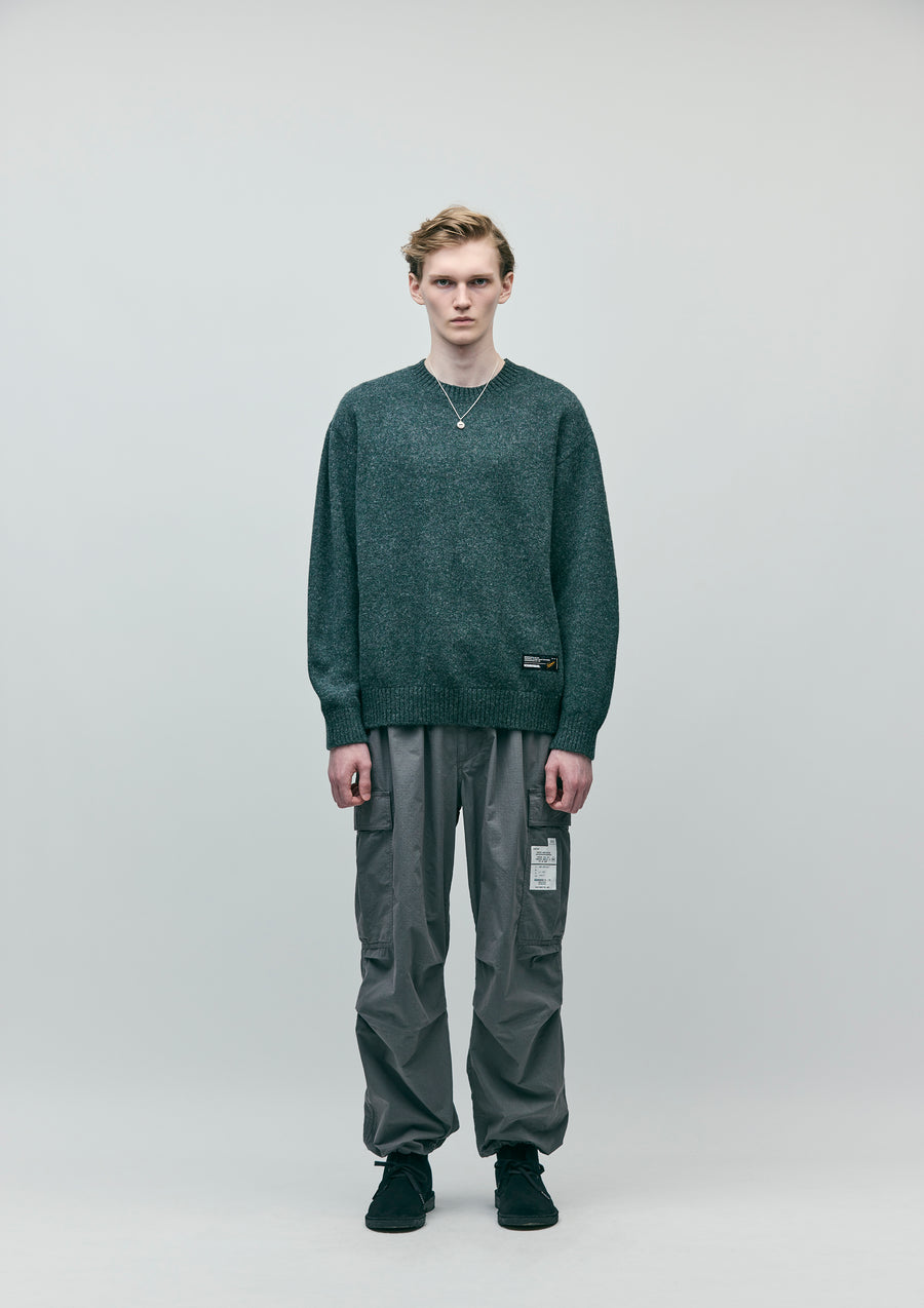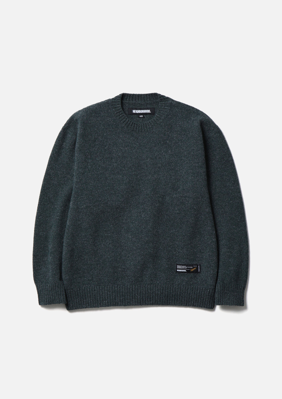 メリノウール素材を使用し、5ゲージ天竺編みで仕上げたクルーネックニット。左裾にネームタグを配置。
