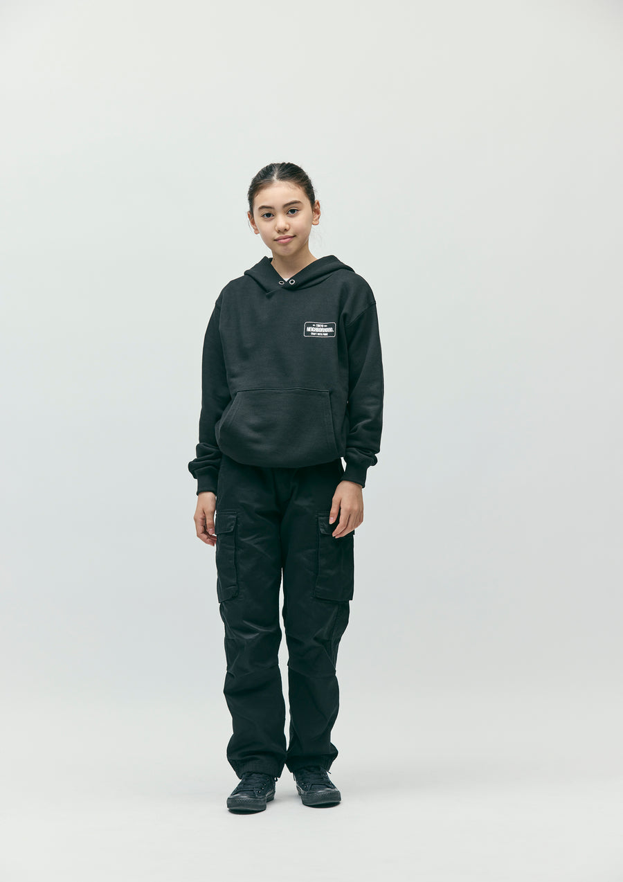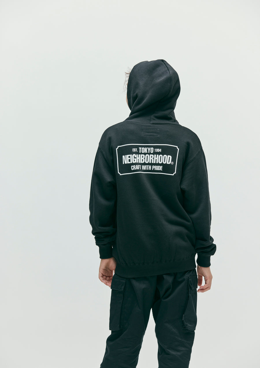 中肉のコットン裏毛素材使用したプルオーバーフーディ。左胸と背面にロゴをプリント。フード部分にネームタグを配置。