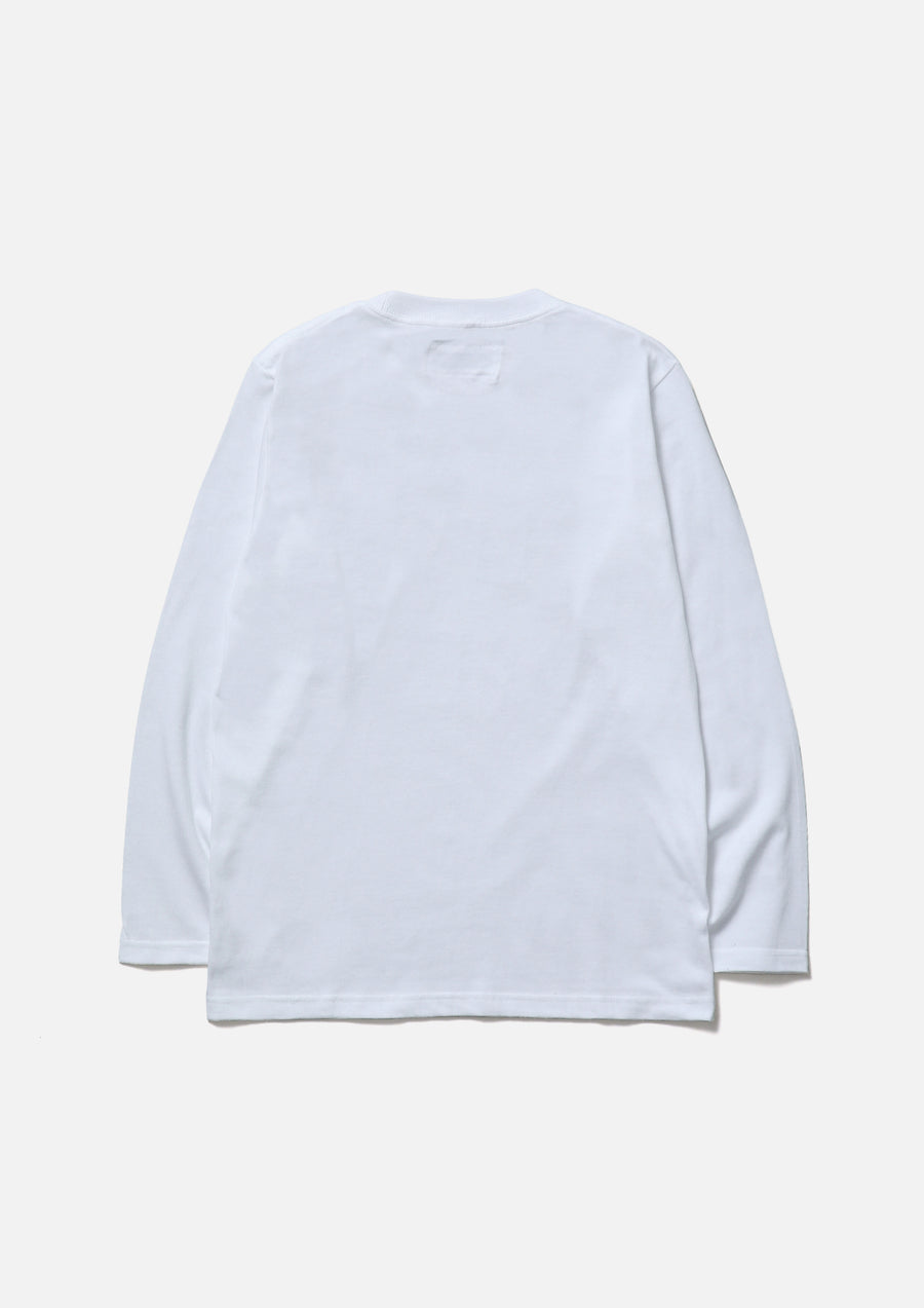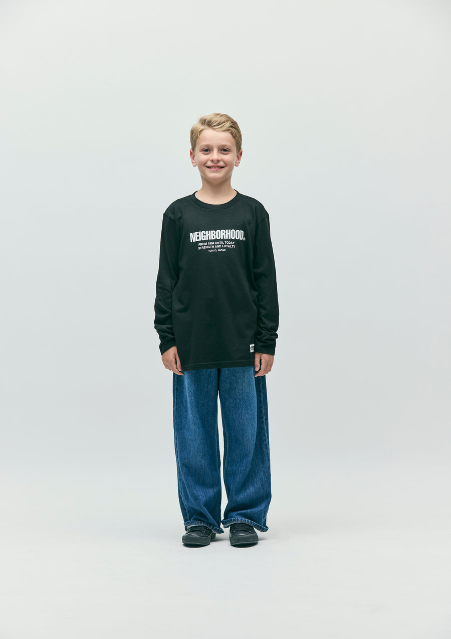 5.6ozのヘビーウェイトボディーを使用したロングスリーブTシャツ。フロントにロゴをプリント。左裾にネームタグを配置。