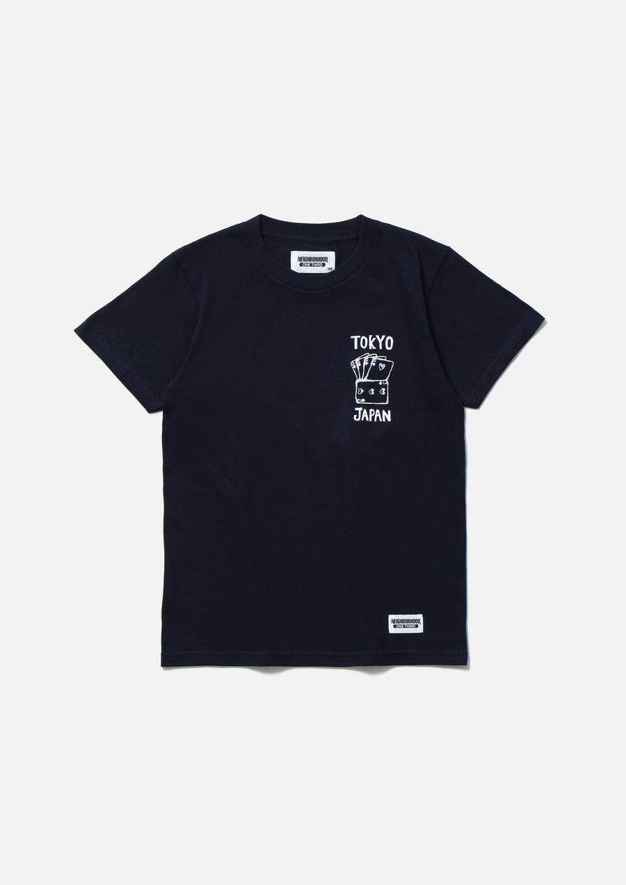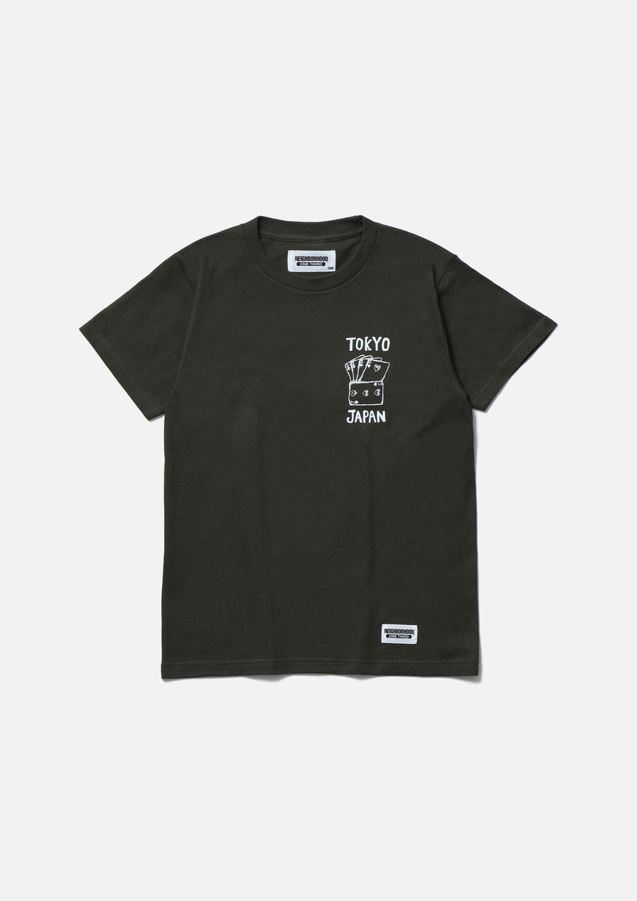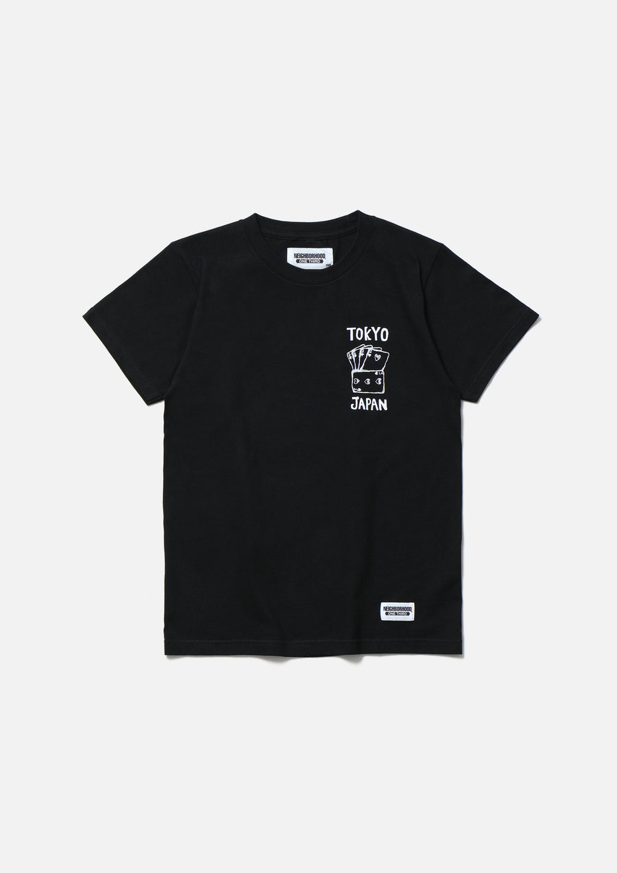 5.6ozのヘビーウェイトボディーを使用したショートスリーブTシャツ。左胸と背面にグラフィックをプリント。左裾にネームタグを配置。