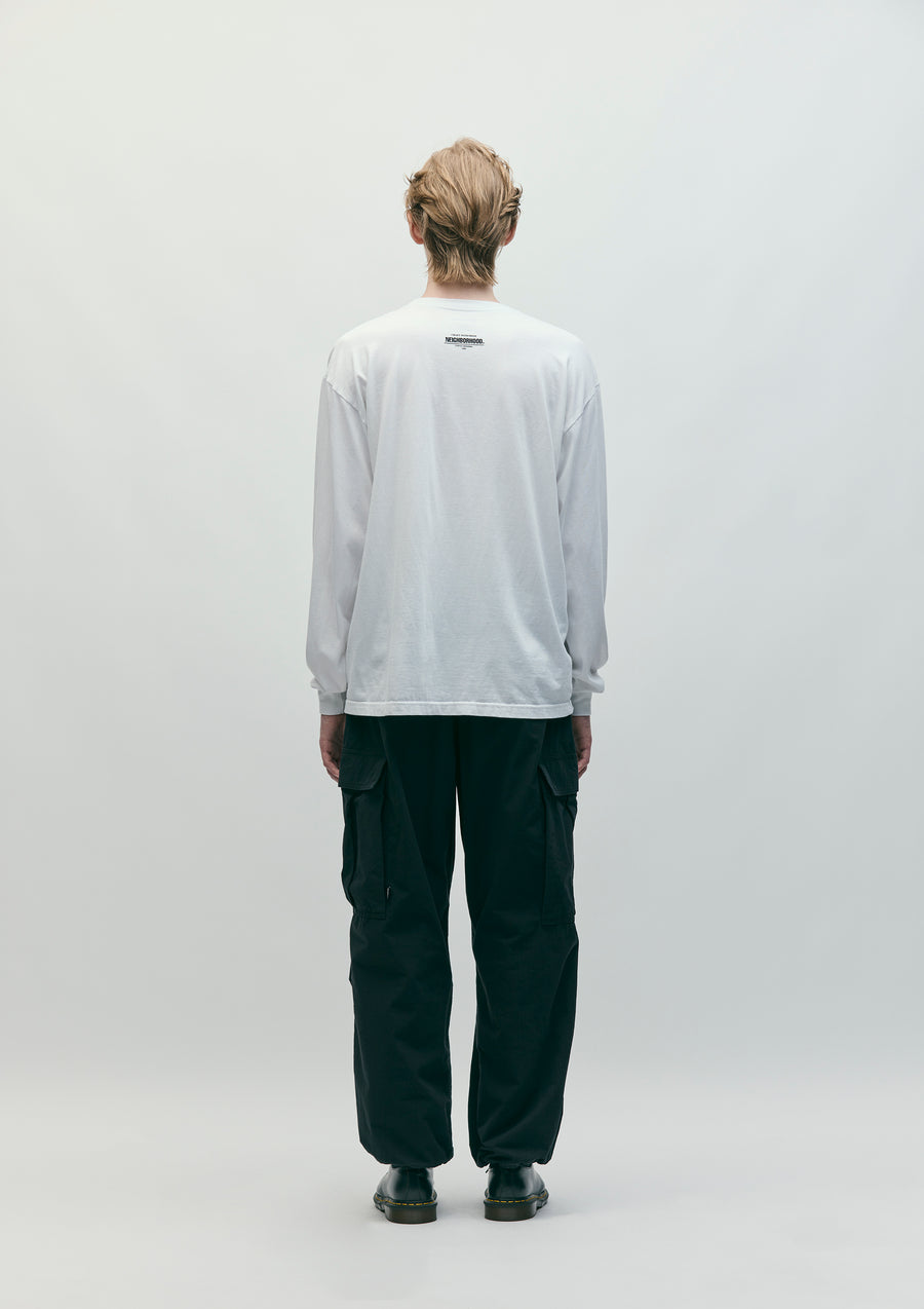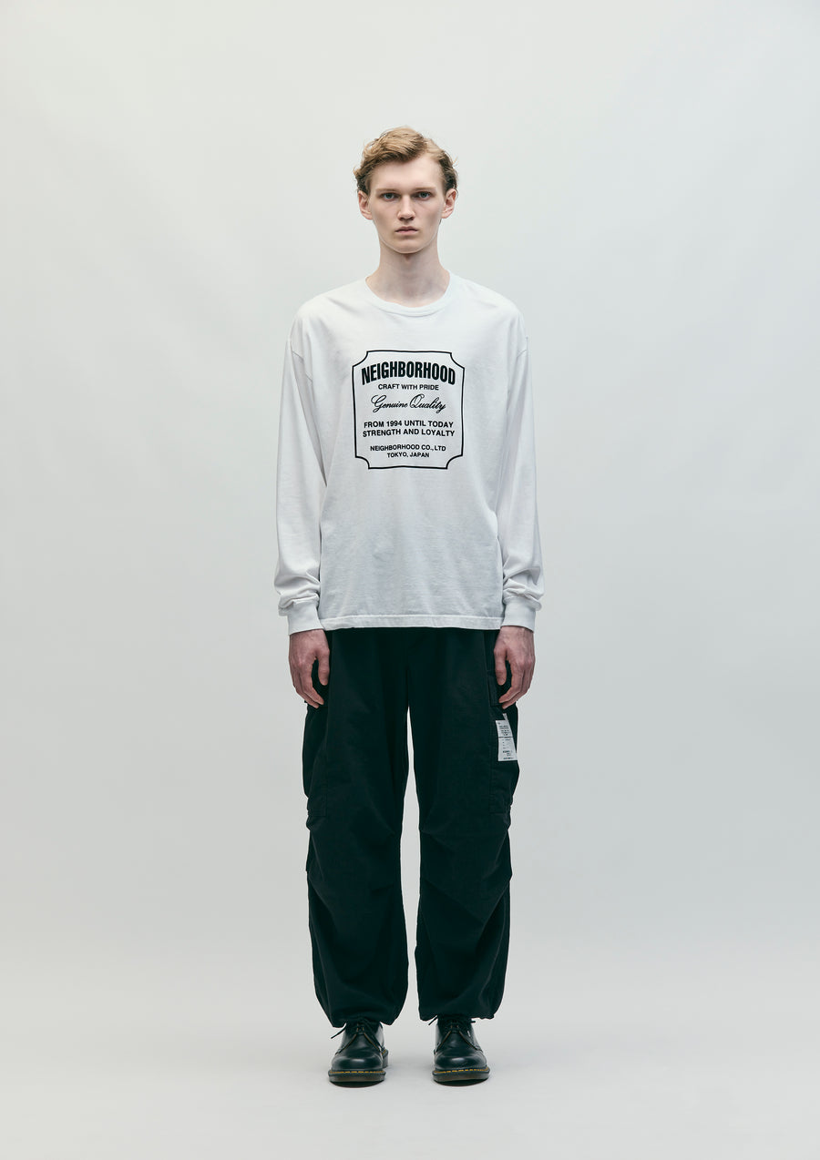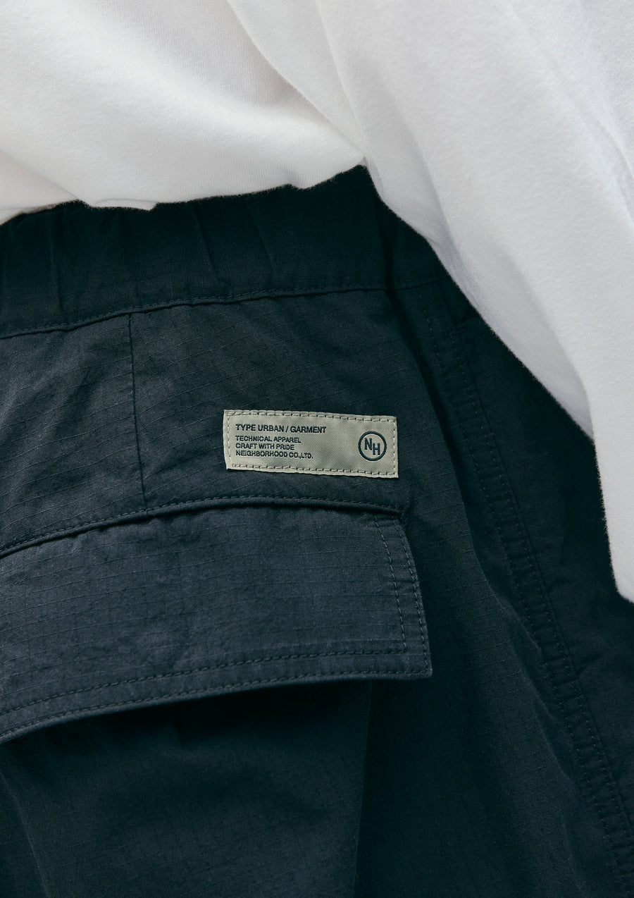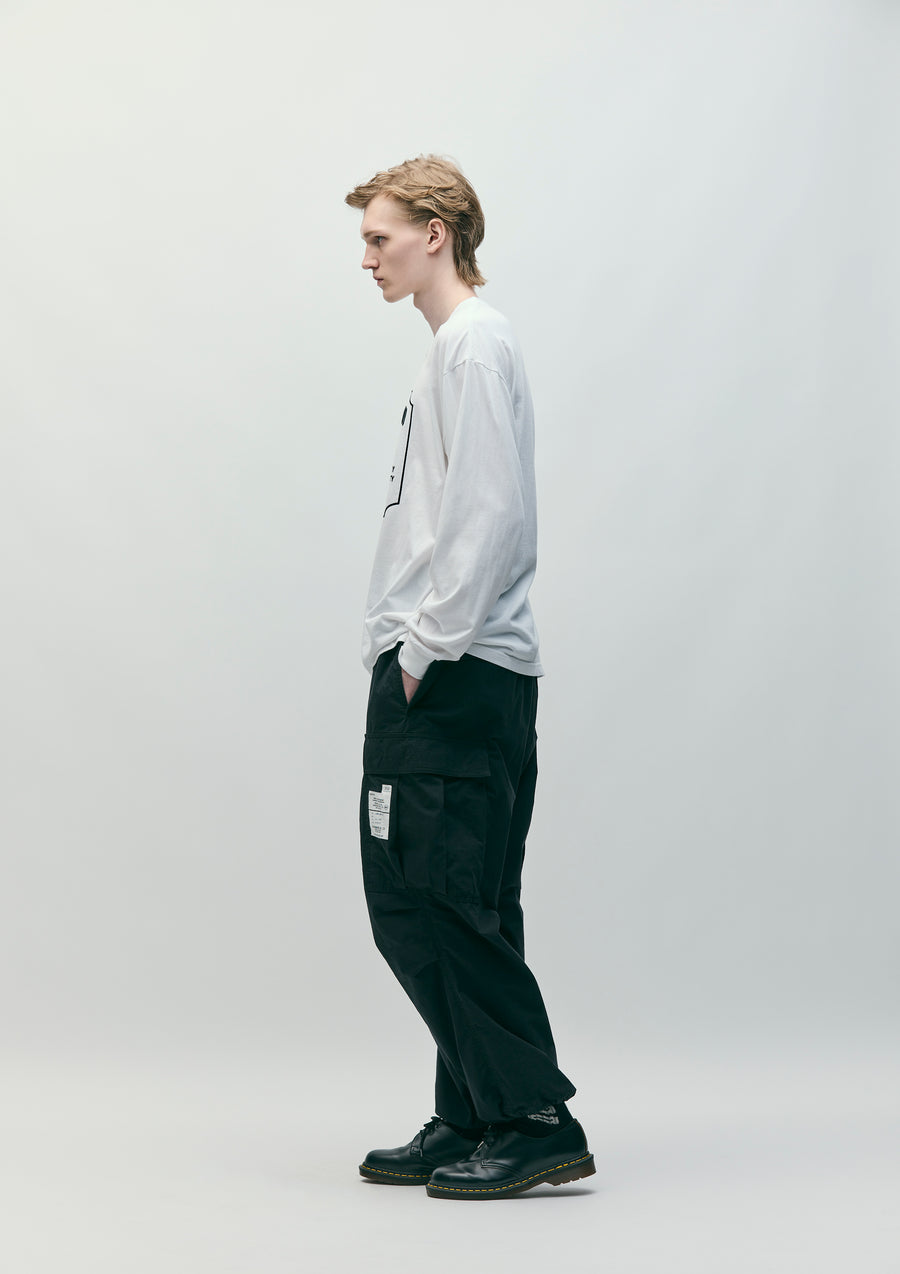 綿ナイロンの高密度リップストップ生地にワッシャー加工を施し、ナチュラルな風合いを表現したワイドカーゴパンツ。ゴム入りウエストにスピンドルを内蔵したイージータイプ。フラップ付きカーゴポケットとヒップポケットは、隠しスナップ仕様。裾に調節用のスピンドルを内蔵し、オリジナルのフロントファスナー、シグネチャーテープを採用。ポケット脇にピスネームを付属。膝元にタックを施したゆとりのあるシルエット。