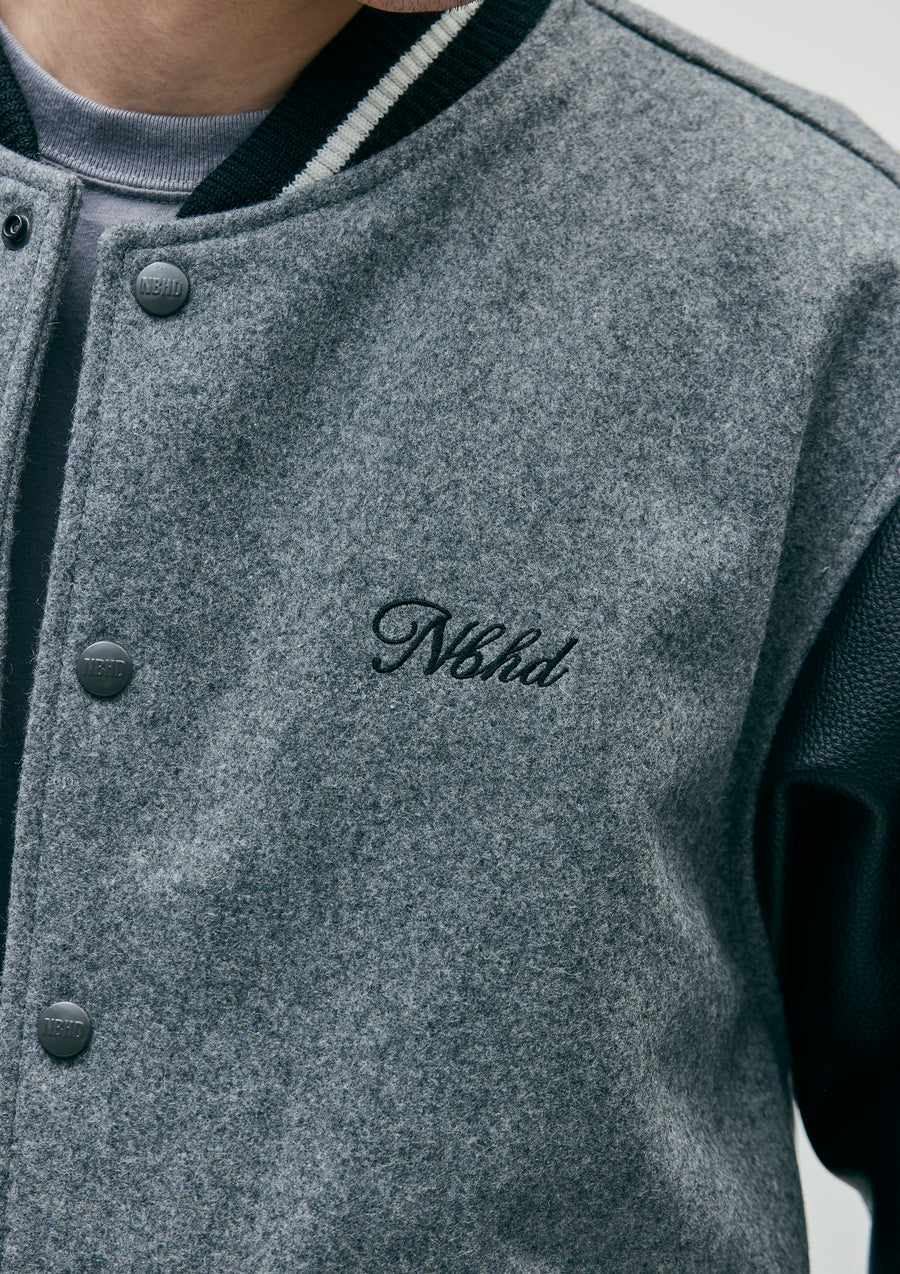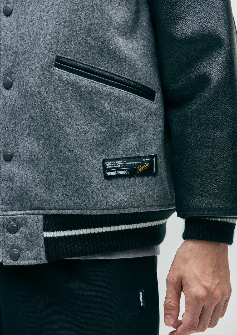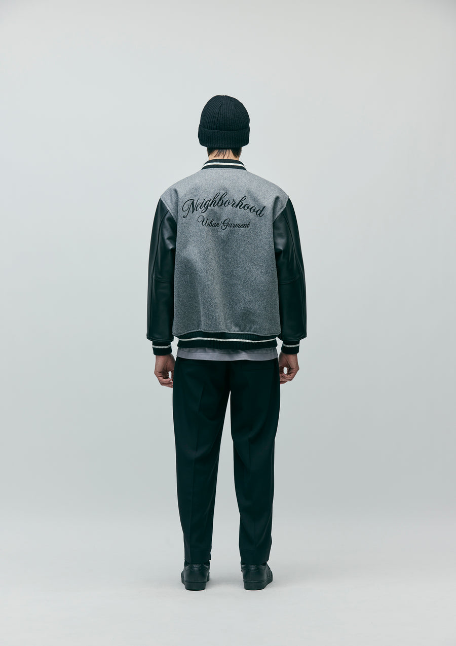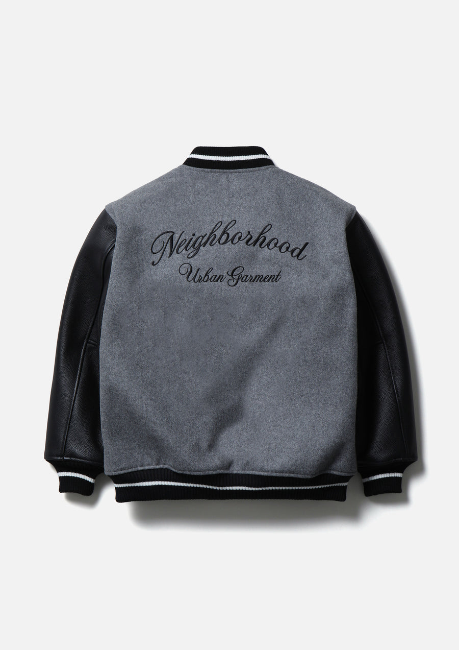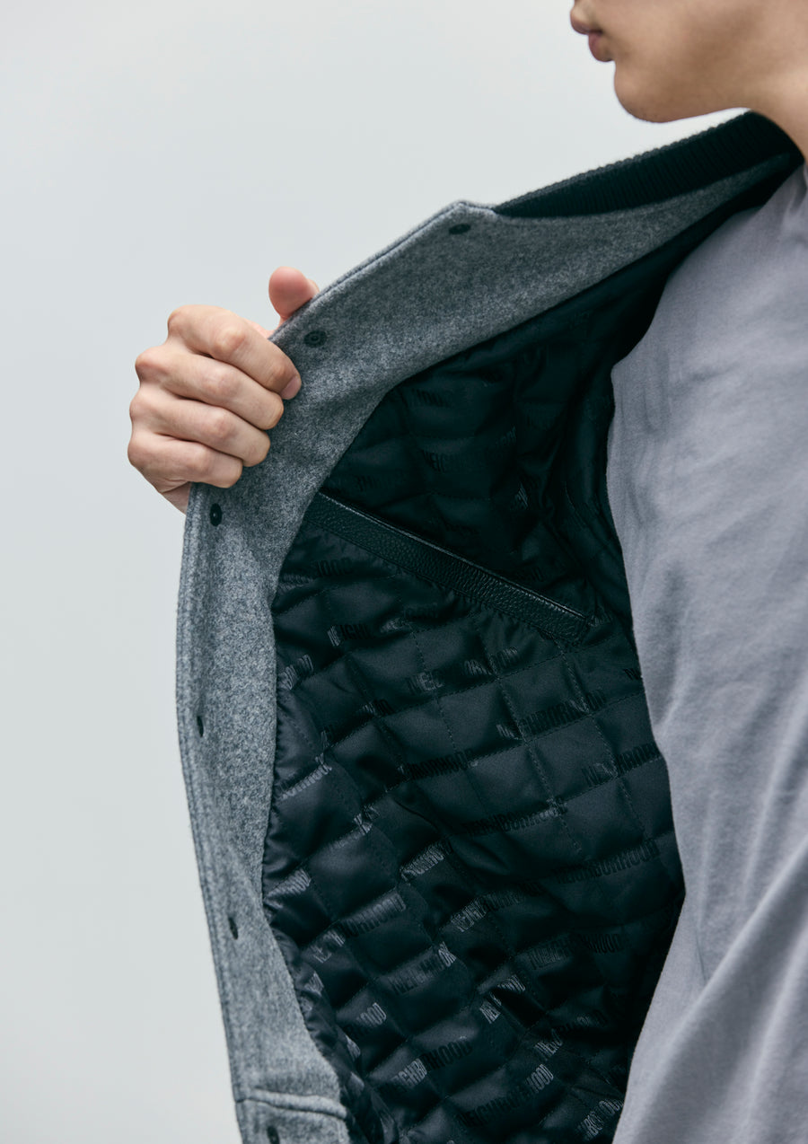 ハリコシのある肉厚なヘヴィメルトン素材とカウレザーをコンビネーションで使用したスタジアムジャケット。左胸と背面にロゴを刺繍。ジャカードロゴ入りの裏地を採用したキルティング仕様。オリジナルのスナップボタン、左裾にネームタグ、サイドシームにピスネームを付属。