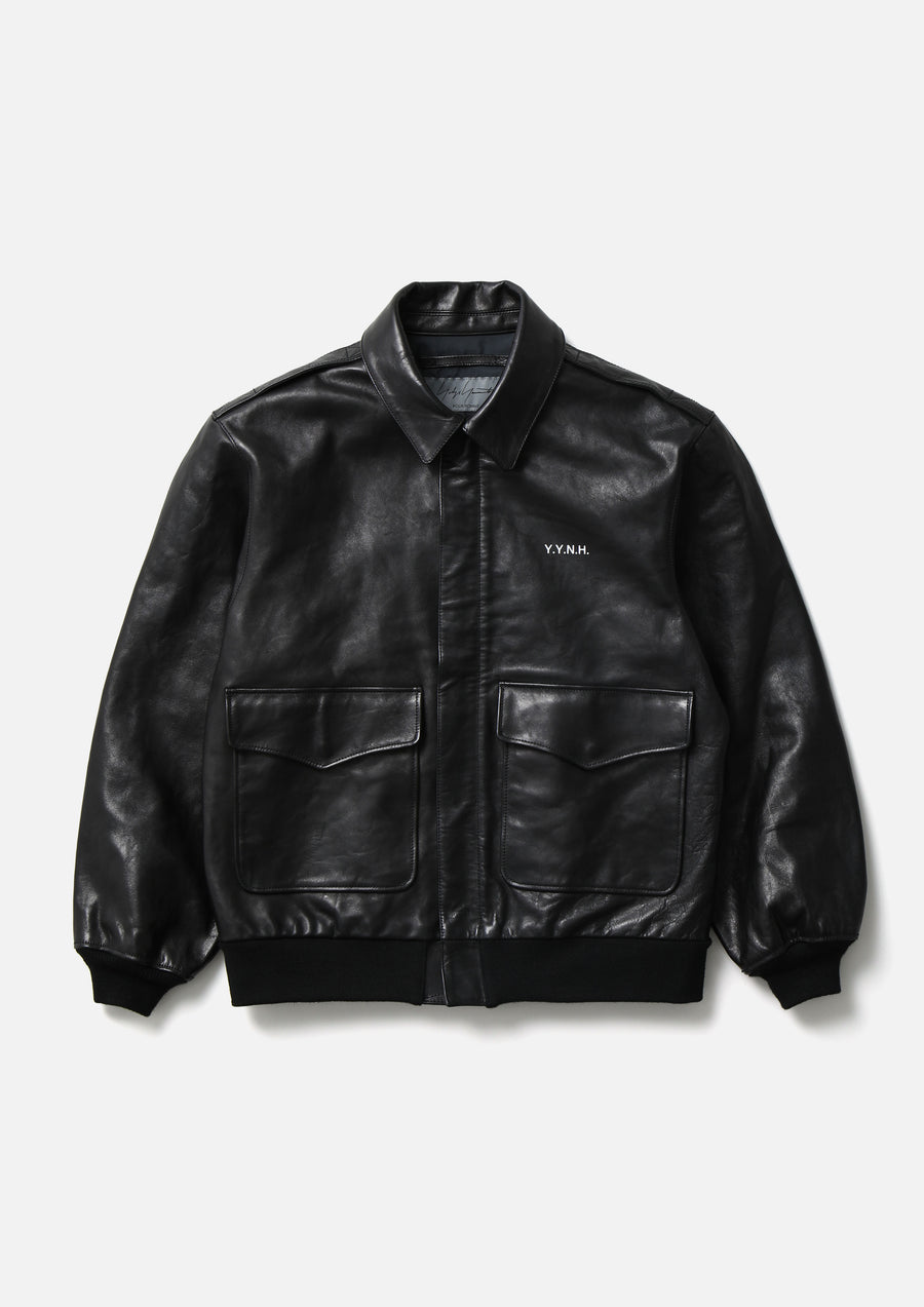 上質なホースレザーを使用したA-2タイプのレザージャケット。フロントは、前立てのあるフロントジップ留め。隠しスナップボタン付きのフラップポケット。袖口と裾はリブ仕様。オリジナルのジッパープルを採用。左胸と背面にロゴをプリント。裏地は制電性のあるポリエステルタフタ。Yohji Yamamoto POUR HOMMEとのコラボレーション。